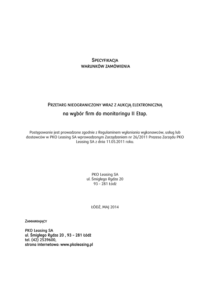 SPECYFIKACJA WARUNKÓW ZAMÓWIENIA PRZETARG NIEOGRANICZONY NIEOGRANICZONY WRAZ Z AUKCJĄ ELEKTRONICZNĄ ELEKTR ONICZNĄ na wybór wybór firm do monitoringu II Etap. Etap. Postępowanie jest prowadzone zgodnie z Regulaminem wyłaniania wykonawców, usług lub dostawców w PKO Leasing SA wprowadzonym Zarządzeniem nr 26/2011 Prezesa Zarządu PKO Leasing SA z dnia 11.05.2011 roku. PKO Leasing SA ul. Śmigłego Rydza 20 93 – 281 Łódź ŁÓDŹ, MAJ 2014 ZAMAWIAJĄCY PKO Leasing SA ul. Śmigłego Rydza 20 , 93 – 281 Łódź tel. (42) 2539600, strona internetowa: www.pkoleasing.pl I. TRYB POSTĘPOWANIA – PRZETARG NIEOGRANICZONY WRAZ Z AUKCJĄ ELEKTRONICZNĄ. ELEKTRONICZNĄ. II. OPIS PRZEDMIOTU ZAMÓWIENIA I. a) b) c) Przedmiotem zamówienia jest: Usługa polegająca na odzyskaniu całej kwoty należności przeterminowanych wskazanych w wysłanym do Klienta Ostatecznych Wezwaniach Do Zapłaty (OWDZ) w okresie pomiędzy 27 a 40 dniem okresu przeterminowania, Usługa polegająca na wydrukowaniu przez Oferenta otrzymanych od Zamawiającego dokumentów (OWDZ), wysłaniu ich za zwrotnym potwierdzeniem odbioru (ZPO) za pośrednictwem POCZTY POLSKIEJ SA do Klientów Zamawiającego wraz z rejestracją zwrotnych potwierdzeń odbioru oraz prowadzeniu przez Oferenta działań reklamacyjnych polegających na wyjaśnianiu braku Zwrotnego Potwierdzenia Odbioru ZPO. Usługa polegająca na poinformowaniu Klientów Zamawiającego o istniejącym zadłużeniu w 5 i 8 DPD wraz z poinformowaniem o możliwości restrukturyzacji umów wybranych (oznaczonych) Klientów. 1. Usługa wydruku i wysyłki ostatecznych wezwań do zapłaty (OWDZ), obejmuje: a) dwustronne wydrukowanie (duplex – zawsze parzysta liczba stron i strony numerowane), na podstawie przekazywanych w cyklach dziennych przez Zamawiającego plików PDF, XML lub w innym ustalonym przez obie strony formacie, w dwóch egzemplarzach pism będących wezwaniem do zapłaty zawierającym warunkowe oświadczenie o rozwiązaniu umowy; b) podpisanie przez Oferenta na podstawie specjalnego pełnomocnictwa udzielonego przez Zamawiającego dwóch egzemplarzy OWDZ; c) wysłanie jednego egzemplarza OWDZ za zwrotnym potwierdzeniem odbioru (ZPO – przesyłanym do Oferenta) w dniu otrzymania pliku, w którym ten OWDZ się znajdował (do każdej umowy w odrębnym liście); d) wysłanie OWDZ w tym samu dniu co otrzymany od Zamawiającego plik, obowiązuje Oferenta w dni robocze z wyłączeniem niedzieli i świąt; e) Oferent ma obowiązek wysłania w pierwszym dniu roboczym po dniu wolnym wszystkich OWDZ z plików, które otrzymał w tym okresie; f) W przypadku kilku OWDZ w pliku dziennym jednego (tego samego) Klienta (Klient ma zawartych z Zamawiającym kilka umów), Oferent ma obowiązek wysłania każdego OWDZ w odrębnej kopercie z ZPO; g) Przekazywanie do Zamawiającego w cyklach dziennych oryginałów podpisanych przez Oferenta OWDZ (drugi egzemplarz) opisanych w ustalony sposób; h) Przekazywanie do Zamawiającego w cyklach dziennych oryginałów ZPO opisanych w ustalony sposób; i) Wypełnienie druku i złożenie reklamacji na Poczcie Polskiej na brak ZPO nie wcześniej niż 14 dni od wysłania OWDZ i nie później niż w 17 dniu od wysłania OWDZ; j) Raportowanie w cyklach dziennych ilości złożonych reklamacji wraz z opisem którego dokumentu dotyczą i odpowiedzią uzyskaną z Poczty Polskiej k) Przekazywania do Zamawiającego na serwer w cyklach dziennych 3 raportów zbiorczych (w formacie ustalonym przez obie strony) wraz ze skanami OWDZ i ZPO opisanymi we wskazany sposób; l) Raport z wysłanych OWDZ; 2 m) Raport z odebranych ZPO z podziałem na odebrane (powrót samej ZPO) i nieodebrane (zwrot do Oferenta listu z OWDZ); n) Raport wysłanych OWDZ wraz ze sparowanymi ZPO o) Raportów miesięcznych niezbędnych do rozliczenia podsumowujących wykonane czynności z w danym cyklu rozliczeniowym rozumianym jako miesiąc kalendarzowy. 2. Usługa odzyskania całej należności wskazanej na OWDZ a) odzyskania przez Oferenta całej kwoty należności przeterminowanych wskazanym w ostatecznym wezwaniu do zapłaty (OWDZ) w okresie pomiędzy 27 a 40 dniem przeterminowania należności. Wszelkie ustalenia i deklaracje spłaty przyjmowane od Klienta muszą zostać zamknięte i zrealizowane najpóźniej do 40 dnia okresu przeterminowania. b) wpłaty Klienta po 40 dniu okresu przeterminowania nie będą uznawane we wzajemnych rozliczeniach pomiędzy Zamawiającym a Oferentem c) w ramach usługi monitorowania Oferent przeprowadzać będzie działania o charakterze upominawczo-informacyjnym, dotyczącym powstałej zaległości z wykorzystaniem narzędzi w postaci skutecznych kontaktów telefonicznych d) Oferent w okresie do 40 dnia przeterminowania należności przeprowadzi co najmniej jedną rozmowę telefoniczną e) Za skuteczny kontakt uznaje się rozmowę telefoniczną przeprowadzoną z Klientem (właścicielem) lub osobą odpowiadającą za płatności. f) Oferent nie będzie uprawniony do pobierania od Klientów PKO Leasing SA i PKO Bankowy Leasing Sp. z o.o. środków pieniężnych, tak w gotówce, jak i w formie przelewu bankowego. 3. Usługa informowania Klientów Zamawiającego przekazywanych w Raportach w 5 i 8 DPD o powstałej zaległości oraz informowanie oznaczonej wśród nich grupy Klientów o możliwości Restrukturyzacji Profilaktycznej umów leasingu i dotyczy: a) Kontaktu z Klientem w 5 i 8 DPD i przekazaniu informacji o kwocie zaległości, b) W przypadku kontaktu z Klientem odpowiednio oznaczonym poinformowania, o możliwości przeprowadzenia procesu restrukturyzacji umowy/ umów leasingu oraz o warunku dobezpieczenia; c) Przekazanie informacji o możliwości restrukturyzacji przekazywany jest jedynie Klientom nie deklarującym spłaty zadłużenia i jest traktowany jako scenariusz ostateczny, d) Za skuteczny kontakt uznaje się rozmowę telefoniczną przeprowadzoną z Klientem (właścicielem) lub osobą odpowiadającą za płatności, e) Dzia