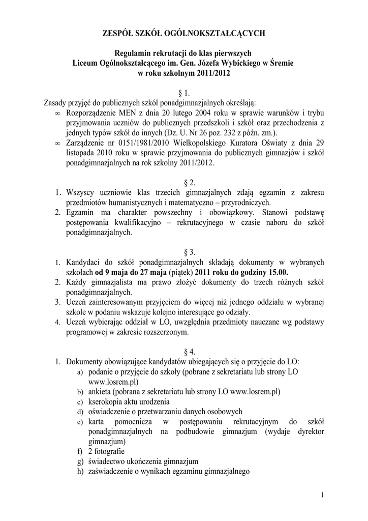 ZESPÓŁ SZKÓŁ OGÓLNOKSZTAŁCĄCYCH Regulamin rekrutacji do klas pierwszych Liceum Ogólnokształcącego im. Gen. Józefa Wybickiego w Śremie w roku szkolnym 2011/2012 § 1. Zasady przyjęć do publicznych szkól ponadgimnazjalnych określają: • Rozporządzenie MEN z dnia 20 lutego 2004 roku w sprawie warunków i trybu przyjmowania uczniów do publicznych przedszkoli i szkół oraz przechodzenia z jednych typów szkół do innych (Dz. U. Nr 26 poz. 232 z późn. zm.). • Zarządzenie nr 0151/1981/2010 Wielkopolskiego Kuratora Oświaty z dnia 29 listopada 2010 roku w sprawie przyjmowania do publicznych gimnazjów i szkół ponadgimnazjalnych na rok szkolny 2011/2012. § 2. 1. Wszyscy uczniowie klas trzecich gimnazjalnych zdają egzamin z zakresu przedmiotów humanistycznych i matematyczno – przyrodniczych. 2. Egzamin ma charakter powszechny i obowiązkowy. Stanowi podstawę postępowania kwalifikacyjno – rekrutacyjnego w czasie naboru do szkół ponadgimnazjalnych. 1. 2. 3. 4. § 3. Kandydaci do szkół ponadgimnazjalnych składają dokumenty w wybranych szkołach od 9 maja do 27 maja (piątek) 2011 roku do godziny 15.00. Każdy gimnazjalista ma prawo złożyć dokumenty do trzech różnych szkół ponadgimnazjalnych. Uczeń zainteresowanym przyjęciem do więcej niż jednego oddziału w wybranej szkole w podaniu wskazuje kolejno interesujące go odziały. Uczeń wybierając oddział w LO, uwzględnia przedmioty nauczane wg podstawy programowej w zakresie rozszerzonym. § 4. 1. Dokumenty obowiązujące kandydatów ubiegających się o przyjęcie do LO: a) podanie o przyjęcie do szkoły (pobrane z sekretariatu lub strony LO www.losrem.pl) b) ankieta (pobrana z sekretariatu lub strony LO www.losrem.pl) c) kserokopia aktu urodzenia d) oświadczenie o przetwarzaniu danych osobowych e) karta pomocnicza w postępowaniu rekrutacyjnym do szkół ponadgimnazjalnych na podbudowie gimnazjum (wydaje dyrektor gimnazjum) f) 2 fotografie g) świadectwo ukończenia gimnazjum h) zaświadczenie o wynikach egzaminu gimnazjalnego 1 i) świadectwo lekarskie j) w przypadku laureatów lub finalistów olimpiad przedmiotowych oraz laureatów konkursów przedmiotowych o zasięgu wojewódzkim – oryginał dokumentów potwierdzający zdobycie tytułu k) dokumenty potwierdzające osiągnięcia kandydata w konkursach o zasięgu wojewódzkim i ponadwojewódzkim, którego program obejmuje w całości lub poszerza treści podstawy programowej co najmniej jednego przedmiotu. 2. W postępowaniu rekrutacyjnym uczeń posługuje się kserokopiami: świadectwa 3. 4. 5. 6. ukończenia gimnazjum i zaświadczenia o wynikach egzaminu gimnazjalnego, uwierzytelnionych pieczęcią okrągłą gimnazjum, pieczątką: za zgodność z oryginałem, pieczątkami i podpisem dyrektora, do momentu potwierdzenia woli podjęcia nauki w LO. Wypełnioną kartę pomocniczą w postępowaniu rekrutacyjnym kandydat składa w szkole pierwszego wyboru w terminie od 9 maja do 27 maja 2011 roku. Kandydat rezygnujący z kolejnych wyborów odpowiednio wpisuje: nie wybieram. Uczeń ma prawo zmienić decyzję o wyborze szkoły ponadgimnazjalnej po otrzymaniu wyników egzaminu gimnazjalnego do 17 czerwca (piątek) 2011 r. do godziny 15.00. Kopię świadectwa ukończenia gimnazjum i kopię zaświadczenia o wynikach egzaminu gimnazjalnego poświadczone przez dyrektora gimnazjum, należy dostarczyć do sekretariatu ZSO do 28 czerwca (wtorek) 2011 r. do godz. 15.00. Uczeń potwierdza wolę podjęcia nauki w LO poprzez dostarczenie oryginałów świadectwa ukończenia gimnazjum i zaświadczenia o wynikach egzaminu gimnazjalnego do 4 lipca (poniedziałek) 2011 r. do godziny 13.00. § 5. 1. O przyjęciu kandydatów do klasy pierwszej LO decyduje szkolna komisja rekrutacyjno – kwalifikacyjna, uwzględniając następujący sposób przeliczania na punkty ocen z przedmiotów i innych osiągnięć kandydatów odnotowanych na świadectwie ukończenia gimnazjum: lp. 1 przedmioty/osiągnięcia przeliczone na punkty liczbowo określona ocena z języka polskiego x 2 2 liczbowo określona ocena z obowiązkowego języka obcego x 2 3 liczbowo określona ocena z matematyki x 2 4 liczbowo określona ocena z przedmiotu wskazanego przez szkolną komisję rekrutacyjno- kwalifikacyjną x 2: • 1a klasa z rozszerzonym językiem polskim, biologią, • punktacja max 12 punktów max 12 punktów max 12 punktów max 12 punktów językiem angielskim/niemieckim (innowacja pedagogiczna) – biologia 1b klasa z rozszerzoną biologią i chemią (innowacja) – biologia lub chemia 2 • • • • 5 6 7 8 9 1c klasa z rozszerzoną biologią i chemią – biologia 1d klasa z rozszerzoną matematyką, fizyką, informatyką – fizyka 1e klasa z rozszerzoną matematyką, fizyką, informatyką – fizyka 1f klasa z rozszerzonym językiem polskim, historią, wiedzą o kulturze i językiem angielskim ( innowacja ) – historia liczbowo określona średnia ocen (zaokrąglona do dwóch miejsc po przecinku) z sześciu przedmiotów ogólnokształcących: historii, wiedzy o społeczeństwie, biologii, geografii, fizyki i astronomii, chemii, informatyki, x 2 (z wyłączeniem przedmiotu wskazanego w punkcie 4). świadectwo z wyróżnieniem ocena zachowania: wzorowe bardzo dobre max 12 punktów 5 punktów 5 punktów 3 punktów konkursy przedmiotowe organizowane przez Wielkopolskiego Kuratora Oświaty – udział w finale wojewódzkim (punktowane maksymalnie dwa przedmioty 2 x 8 pkt.): osiągnięcia kandydata w kategoriach: a) sportowe: - na szczeblu ogólnopolskim (miejsca 1 – 6 ) - na szczeblu wojewódzkim (miejsca 1 – 3 ) - na szczeblu powiatowym (miejsca 1 – 3) b) artystyczne: - na szczeblu ogólnopolskim (m 1 – 6) - na szczeblu co najmniej wojewódzkim (m 1 – 3 ) - na szczeblu powiatowym (m 1 – 3) max 16 punktów 6 pkt. 4 pkt. 2 pkt. 6 pkt. 4 pkt. 2 pkt. c) konkursy wiedzy: - organizowane na szczeblu ogólnopolskim (m 1 – 6) - organizowane na szczeblu wojewódzkim (m 1 – 