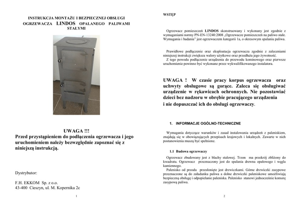 WSTĘP INSTRUKCJA MONTAŻU I BEZPIECZNEJ OBSŁUGI OGRZEWACZA LINDOS OPALANEGO PALIWAMI STAŁYMI Ogrzewacz pomieszczeń LINDOS skonstruowany i wykonany jest zgodnie z wymaganiami normy PN-EN-13240:2008 „Ogrzewacze pomieszczeń na paliwo stałe. Wymagania i badania” jest ogrzewaczem kategorii 1a, o okresowym spalaniu paliwa. Prawidłowe podłączenie oraz eksploatacja ogrzewacza zgodnie z zaleceniami niniejszej instrukcji zwiększa walory użytkowe oraz przedłuża jego żywotność. Z tego powodu podłączenie urządzenia do przewodu kominowego oraz pierwsze uruchomienie powinno być wykonane przez wykwalifikowanego instalatora. UWAGA ! W czasie pracy korpus ogrzewacza oraz uchwyty obsługowe są gorące. Zaleca się obsługiwać urządzenie w rękawicach ochronnych. Nie pozostawiać dzieci bez nadzoru w obrębie pracującego urządzenia i nie dopuszczać ich do obsługi ogrzewaczy. 1. INFORMACJE OGÓLNO-TECHNICZNE UWAGA !!! Przed przystąpieniem do podłączenia ogrzewacza i jego uruchomieniem należy bezwzględnie zapoznać się z niniejszą instrukcją. Dystrybutor: F.H. EKKOM Sp. z o.o. 43-400 Cieszyn, ul. M. Kopernika 2c 1 Wymagania dotyczące warunków i zasad instalowania urządzeń z paleniskiem, znajdują się w obowiązujących przepisach krajowych i lokalnych. Zawarte w nich postanowienia muszą być spełnione. 1.1 Budowa ogrzewaczy Ogrzewacz zbudowany jest z blachy stalowej. Trzon ma przekrój zbliżony do kwadratu. Ogrzewacz przeznaczony jest do spalania drewna opałowego i węgla kamiennego. Palenisko od przodu przesłonięte jest drzwiczkami. Górne drzwiczki zasypowe przeznaczone są do załadunku paliwa a dolne drzwiczki paleniskowe umożliwiają bezpieczną obsługę i odpopielanie paleniska. Palenisko stanowi jednocześnie komorę zasypową paliwa. 2 W dolnej części paleniska znajduje się żeliwny ruszt do spalania paliwa. Ściany paleniska nad rusztem do wysokości drzwiczek zasypowych paliwa, wyłożone są kształtkami szamotowymi. Popiół ze spalonego paliwa opada do popielnika usytuowanego pod rusztem. Szufladka popielnika jest jednocześnie przepustnicą doprowadzającą powietrze pierwotne pod ruszt i do paleniska. Odpowiednio wysuwając szufladkę reguluje się ilość powietrza do spalania paliwa. Maksymalne wysunięcie szufladki umożliwia usuwanie popiołu Od góry trzon urządzenia zamknięty jest blatem, w którym zamontowana jest okrągła stalowa pokrywa. Na tylnej ścianie ogrzewacza przepustnica spalin. zamontowany jest króciec wylotowy a w nim Przepustnica otwarta Przepustnica zamknięta Trzon ogrzewacza posadowiony jest na podstawie wyposażonej w podpory. Powierzchnia korpusu urządzenia pomalowana jest termoodporną farbą . 1.2 Dane techniczno – eksploatacyjne Parametr Węgiel kamienny 310 / 310 mm 272 / 272 mm 735 mm 605 mm Paliwo Szerokość / Głębokość blatu Szerokość / Głębokość trzonu Wysokość ogrzewacza Wysokość trzonu Powierzchnia grzewcza 0,75 m2 ogrzewacza Masa ogrzewacza 39 kg Średnica króćca 120 mm wylotowego Nominalna moc cieplna 8,8 kW grzewcza Sprawność cieplna przy 66 % mocy nominalnej Ciąg kominowy przy 12 Pa (0,12 mocy nominalnej mbar) Temperatura spalin przy 371 0C mocy nominalnej Średnia wartość 15,0 g/s strumienia masy spalin Emisja CO - (dla O2 = 0,43 % 13%) Masa załadunku paliwa 3,3 kg Stałopalność przy mocy 2,0 h nominalnej Drewno opałowe 310 / 310 mm 272 / 272 mm 735 mm 605 mm 0,75 m2 39 kg 120 mm 9,0 kW 71 % 12 Pa (0,12 mbar) 299 0C 8,7 g/s 0,94 % 2,7 kg 1,0 h Wyrób nie zawiera substancji niebezpiecznych o których mowa w art. 33 rozporządzenia UE nr. 1907/2006 1.3 Paliwo do opalania ogrzewaczy Paliwo zalecane - węgiel kamienny, drewno opałowe : - węgiel kamienny - zaleca się stosowanie węgla kamiennego sortymentu orzech 1 o wymiarach ziarna 40 – 80 mm. - drewno opałowe - zaleca się stosowanie drewna liściastego o wilgotności poniżej 20% i wymiarach 100 x 100 x 200 mm. 3 4 Paliwa niedozwolone - ogrzewacz nie jest przewidziany do spalania miału węgla kamiennego, koksu, trocin drewna oraz odpadków, szczególnie odpadków chemicznych. Spalanie tego typu opału jest zabronione. 2 INSTALACJA OGRZEWACZA Pomieszczenie, w którym planowane jest zainstalowanie ogrzewacza powinno odpowiadać przepisom: - rozporządzenia Min. Infrastruktury z dnia 12 kwietnia 2002r. „W sprawie warunków technicznych, jakim powinny odpowiadać budynki i ich usytuowanie” Dz. U. Nr 75 poz. 690. 2.1 Ustawienie ogrzewacza Ogrzewacz powinien być ustawiony i podłączony przez osobę o odpowiednich kwalifikacjach. Podłączony ogrzewacz należy ustawić na podłożu o wystarczającej nośności w stosunku do masy urządzenia, odpornym na wysoką temperaturę i nacisk, np. na betonie, płytkach ceramicznych. Jeżeli elementy budynku stanowiące otoczenie ogrzewacza i podłoga wykonane są z materiałów palnych, to należy zachować następujące odległości od urządzenia: - urządzenie grzewcze oraz rury przyłączeniowe powinny być oddalone od łatwopalnych, nieosłoniętych części konstrukcyjnych budynku co najmniej 0,6 m ( producent zaleca co najmniej 0,8 m ), a od osłoniętych okładziną z tynku o grubości 25 mm na siatce, lub inną równorzędną okładziną – co najmniej 0,3 m ( producent zaleca co najmniej 0,4 m ). - urządzenie grzewcze z nóżkami powinno być ustawione na podłożu niepalnym i odpornym na wysoką temperaturę o grubości co najmniej 0,15 m. Podłoga łatwo zapalna przed drzwiczkami paleniska powinna być zabezpieczona pasem materiału niepalnego (np. blachy) sięgającym poza krawędzie drzwiczek co najmniej po 0,3 m z każdej strony. Ponadto lokalizacja urządzenia powinna zapewniać łatwy dostęp celem obsługi i konserwacji. 2.2 Podłączenie ogrzewacza do kanału kominowego Podłączenie do komina należy wykonać szczelnie, bezpośrednio poprzez krótkie przyłącze rurowe. Przyłącza rurowe powinny być wykonane ze stali odpornej na wysokie temperatury.