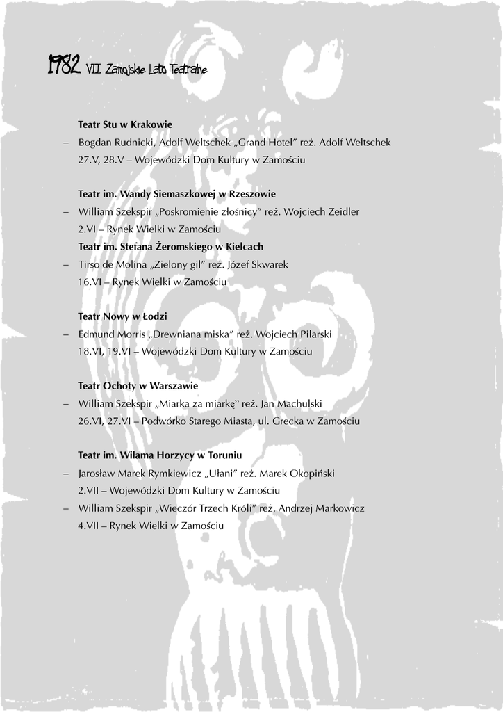 1982 VII Zamojskie Lato Teatralne Teatr Stu w Krakowie − Bogdan Rudnicki, Adolf Weltschek „Grand Hotel” reż. Adolf Weltschek 27.V, 28.V – Wojewódzki Dom Kultury w Zamościu Teatr im. Wandy Siemaszkowej w Rzeszowie − William Szekspir „Poskromienie złośnicy” reż. Wojciech Zeidler 2.VI – Rynek Wielki w Zamościu Teatr im. Stefana Żeromskiego w Kielcach − Tirso de Molina „Zielony gil” reż. Józef Skwarek 16.VI – Rynek Wielki w Zamościu Teatr Nowy w Łodzi − Edmund Morris „Drewniana miska” reż. Wojciech Pilarski 18.VI, 19.VI – Wojewódzki Dom Kultury w Zamościu Teatr Ochoty w Warszawie − William Szekspir „Miarka za miarkę” reż. Jan Machulski 26.VI, 27.VI – Podwórko Starego Miasta, ul. Grecka w Zamościu Teatr im. Wilama Horzycy w Toruniu − Jarosław Marek Rymkiewicz „Ułani” reż. Marek Okopiński 2.VII – Wojewódzki Dom Kultury w Zamościu − William Szekspir „Wieczór Trzech Króli” reż. Andrzej Markowicz 4.VII – Rynek Wielki w Zamościu