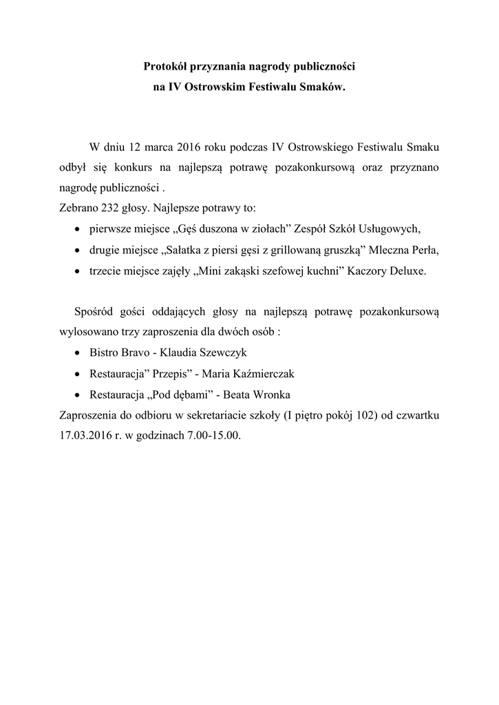 Protokół przyznania nagrody publiczności na IV Ostrowskim Festiwalu Smaków. W dniu 12 marca 2016 roku podczas IV Ostrowskiego Festiwalu Smaku odbył się konkurs na najlepszą potrawę pozakonkursową oraz przyznano nagrodę publiczności . Zebrano 232 głosy. Najlepsze potrawy to: pierwsze miejsce „Gęś duszona w ziołach” Zespół Szkół Usługowych, drugie miejsce „Sałatka z piersi gęsi z grillowaną gruszką” Mleczna Perła, trzecie miejsce zajęły „Mini zakąski szefowej kuchni” Kaczory Deluxe. Spośród gości oddających głosy na najlepszą potrawę pozakonkursową wylosowano trzy zaproszenia dla dwóch osób : Bistro Bravo - Klaudia Szewczyk Restauracja” Przepis” - Maria Kaźmierczak Restauracja „Pod dębami” - Beata Wronka Zaproszenia do odbioru w sekretariacie szkoły (I piętro pokój 102) od czwartku 17.03.2016 r. w godzinach 7.00-15.00.