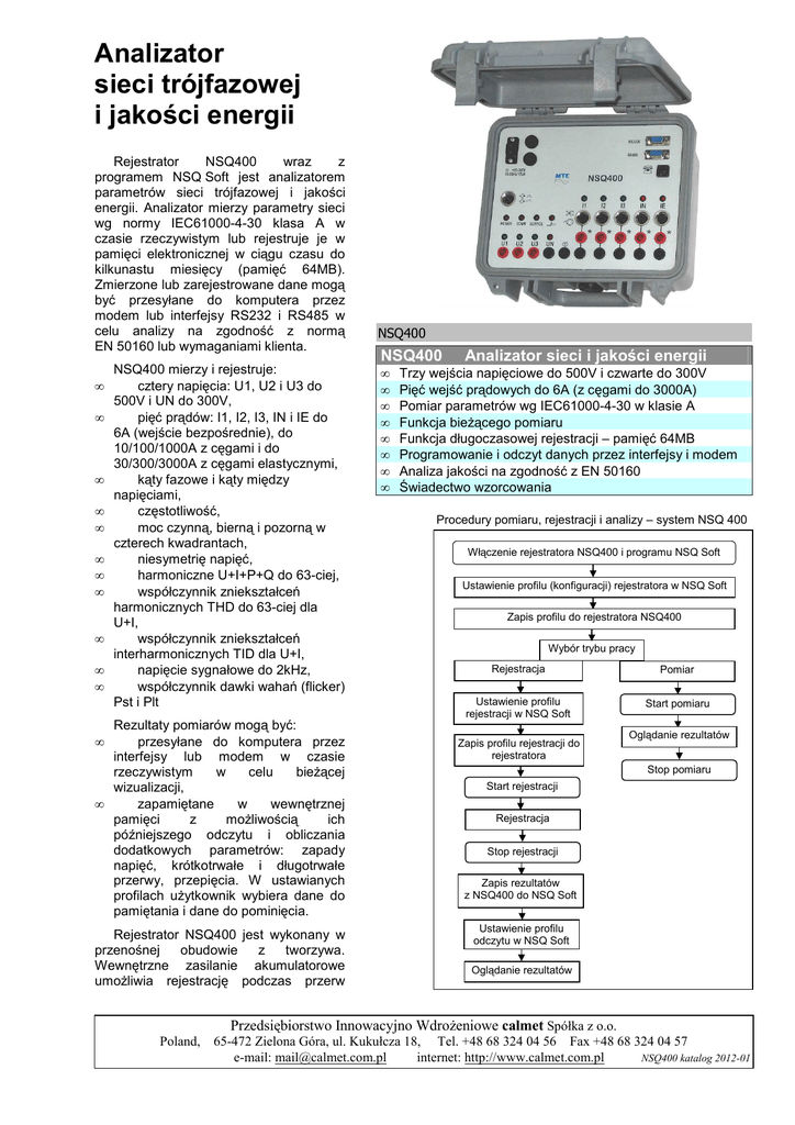 Analizator sieci trójfazowej i jakości energii Rejestrator NSQ400 wraz z programem NSQ Soft jest analizatorem parametrów sieci trójfazowej i jakości energii. Analizator mierzy parametry sieci wg normy IEC61000-4-30 klasa A w czasie rzeczywistym lub rejestruje je w pamięci elektronicznej w ciągu czasu do kilkunastu miesięcy (pamięć 64MB). Zmierzone lub zarejestrowane dane mogą być przesyłane do komputera przez modem lub interfejsy RS232 i RS485 w celu analizy na zgodność z normą EN 50160 lub wymaganiami klienta. • • • • • • • • • • • NSQ400 mierzy i rejestruje: cztery napięcia: U1, U2 i U3 do 500V i UN do 300V, pięć prądów: I1, I2, I3, IN i IE do 6A (wejście bezpośrednie), do 10/100/1000A z cęgami i do 30/300/3000A z cęgami elastycznymi, kąty fazowe i kąty między napięciami, częstotliwość, moc czynną, bierną i pozorną w czterech kwadrantach, niesymetrię napięć, harmoniczne U+I+P+Q do 63-ciej, współczynnik zniekształceń harmonicznych THD do 63-ciej dla U+I, współczynnik zniekształceń interharmonicznych TID dla U+I, napięcie sygnałowe do 2kHz, współczynnik dawki wahań (flicker) Pst i Plt Rezultaty pomiarów mogą być: przesyłane do komputera przez interfejsy lub modem w czasie rzeczywistym w celu bieŜącej wizualizacji, • zapamiętane w wewnętrznej pamięci z moŜliwością ich późniejszego odczytu i obliczania dodatkowych parametrów: zapady napięć, krótkotrwałe i długotrwałe przerwy, przepięcia. W ustawianych profilach uŜytkownik wybiera dane do pamiętania i dane do pominięcia. • Rejestrator NSQ400 jest wykonany w przenośnej obudowie z tworzywa. Wewnętrzne zasilanie akumulatorowe umoŜliwia rejestrację podczas przerw napięcia zasilania (15 przerw po 2 min). Poland, NSQ400 NSQ400 • • • • • • • • Analizator sieci i jakości energii Trzy wejścia napięciowe do 500V i czwarte do 300V Pięć wejść prądowych do 6A (z cęgami do 3000A) Pomiar parametrów wg IEC61000-4-30 w klasie A Funkcja bieŜącego pomiaru Funkcja długoczasowej rejestracji – pamięć 64MB Programowanie i odczyt danych przez interfejsy i modem Analiza jakości na zgodność z EN 50160 Świadectwo wzorcowania Procedury pomiaru, rejestracji i analizy – system NSQ 400 Włączenie rejestratora NSQ400 i programu NSQ Soft Ustawienie profilu (konfiguracji) rejestratora w NSQ Soft Zapis profilu do rejestratora NSQ400 Wybór trybu pracy Rejestracja Pomiar Ustawienie profilu rejestracji w NSQ Soft Start pomiaru Zapis profilu rejestracji do rejestratora Oglądanie rezultatów Stop pomiaru Start rejestracji Rejestracja Stop rejestracji Zapis rezultatów z NSQ400 do NSQ Soft Ustawienie profilu odczytu w NSQ Soft Oglądanie rezultatów Przedsiębiorstwo Innowacyjno WdroŜeniowe calmet Spółka z o.o. 65-472 Zielona Góra, ul. Kukułcza 18, Tel. +48 68 324 04 56 Fax +48 68 324 04 57 e-mail: [email protected] internet: http://www.calmet.com.pl NSQ400 katalog 2012-01 PODSTAWOWE PARAMETRY TECHNICZNE Funkcja / parametr Zakres Napięcie 0...500V Napięcie 0...300V Prąd bezpośredni Prąd z cęgami 10A Prąd z cęgami 100A Prąd z cęgami 1000A 0...6A 0,1...10A 1...100A 10...1000A 0,3...30A 3...300A 30...3000A Prąd z cęgami 30/300/3000A Błąd dopuszczalny PROGRAM NSQ SOFT Kanał pomiarowy ±0,1% @ 300V ±0,2% @ 57V ±0,1% @ 300V ±0,2% @ 57V ±0,1% zakresu ±2mA ±0,5% ±0,1% zakresu ±0,5% ±0,1% zakresu ±0,5% ±0,1% zakresu I1, I2, I3, IN, IE I1, I2, I3, IN, IE I1, I2, I3, IN, IE I1, I2, I3, IN, IE ±1% ±0,1% zakresu I1, I2, I3, IN, IE U1, U2, U3 UN Kąt fazowy L1, L2, L3 wejście bezpośrednie ±0,7° 0...±360° z cęgami ±1,7° Kąt między napięciami U1, U2, U3 0...±360° ±0,7° Częstotliwość 45…65Hz U1 lub U2 lub U3 ±0,05Hz *) Moc i energia wg zakresów L1, L2, L3 wejście bezpośrednie ±0,5% ±0,1% zakresu napięć i prądów z cęgami ±1% ±0,1% zakresu Niesymetria napięć 0...200% U1, U2, U3 ±2% Harmoniczne dla U+I+P+Q 1...63-cia L1, L2, L3 ±10% Współczynnik zniekształceń 1...63-cia L1, L2, L3 ±10% harmonicznych THD dla U+I Współczynnik zniekształceń do 3,2kHz L1, L2, L3 ±10% interharmonicznych TID dla U+I Napięcie sygnałowe **) do 2kHz U1, U2, U3 ±10% Współczynnik dawki wahań 0,1...25Hz U1, U2, U3 ±5% Pst i Plt 0,1 błędu dopuszczalnego / 1°C Wpływ temperatury otoczenia w zakresie temperatur +5...+20°C i +26...+40°C Zasilanie 85..230..265 / 45..65Hz / 15VA Wymiary i masa analizatora 265 / 175 / 243 mm / 3.7kg Wymiary i masa analizatora z wyposaŜeniem 420 / 280 / 370 mm / 8,1 kg *) błąd dopuszczalny mocy odniesiony do wartości mocy pozornej **) amplituda i częstotliwość nieharmonicznej o najwyŜszej amplitudzie REJESTRATOR NSQ400 Z WYPOSAśENIEM Zestaw umieszczony jest w skrzyni, która w stanie zamkniętym jest przeznaczona do transportu a w stanie otwartym umoŜliwia pracę z zestawem na obiekcie w trudnych warunkach. Skład kompletu obejmuje: • rejestrator NSQ400, • przewód zasilający, • przewód interfejsu RS232 i adapter USB-RS232, • komplet przewodów napięciowych bezpiecznych (5szt), • komplet przewodów prądowych bezpiecznych do 20A (10szt), • zestaw końcówek wymiennych do przewodów bezpiecznych (15szt banan +15szt Cu), • NSQ Soft program komputerowy. • instrukcję obsługi, • kartę gwarancyjną, • świadectwo wzorcowania producenta. • konfigurowanie rejestratora NSQ400, • odczyt danych z rejestratora w trybie pomiarowym lub zapamiętanych podczas rejestracji, • wizualizacja odczytywanych danych w formie tablic, wykresów czasowych, oscyloskopowych i wektorowych oraz histogramów, • filtrację odczytanych danych za pomocą profilu odczytu i obróbkę statystyczną w celu prezentacji wyników w postaci histogramów oraz wykresów CBEMA i ITIC, • export danych do innych programów, np. MS Excel celem ich dalszej obróbki wg wymagań uŜytkownika, • zapis i odczyt danych na plik w celu archiwizacji. Opcjonalnie (na Ŝyczenie