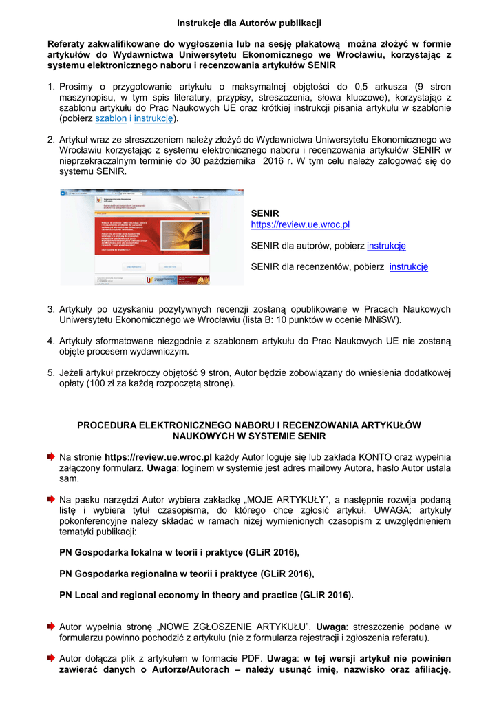 Instrukcje dla Autorów publikacji Referaty zakwalifikowane do wygłoszenia lub na sesję plakatową można złożyć w formie artykułów do Wydawnictwa Uniwersytetu Ekonomicznego we Wrocławiu, korzystając z systemu elektronicznego naboru i recenzowania artykułów SENIR 1. Prosimy o przygotowanie artykułu o maksymalnej objętości do 0,5 arkusza (9 stron maszynopisu, w tym spis literatury, przypisy, streszczenia, słowa kluczowe), korzystając z szablonu artykułu do Prac Naukowych UE oraz krótkiej instrukcji pisania artykułu w szablonie (pobierz szablon i instrukcję). 2. Artykuł wraz ze streszczeniem należy złożyć do Wydawnictwa Uniwersytetu Ekonomicznego we Wrocławiu korzystając z systemu elektronicznego naboru i recenzowania artykułów SENIR w nieprzekraczalnym terminie do 30 października 2016 r. W tym celu należy zalogować się do systemu SENIR. SENIR https://review.ue.wroc.pl SENIR dla autorów, pobierz instrukcję SENIR dla recenzentów, pobierz instrukcję 3. Artykuły po uzyskaniu pozytywnych recenzji zostaną opublikowane w Pracach Naukowych Uniwersytetu Ekonomicznego we Wrocławiu (lista B: 10 punktów w ocenie MNiSW). 4. Artykuły sformatowane niezgodnie z szablonem artykułu do Prac Naukowych UE nie zostaną objęte procesem wydawniczym. 5. Jeżeli artykuł przekroczy objętość 9 stron, Autor będzie zobowiązany do wniesienia dodatkowej opłaty (100 zł za każdą rozpoczętą stronę). PROCEDURA ELEKTRONICZNEGO NABORU I RECENZOWANIA ARTYKUŁÓW NAUKOWYCH W SYSTEMIE SENIR Na stronie https://review.ue.wroc.pl każdy Autor loguje się lub zakłada KONTO oraz wypełnia załączony formularz. Uwaga: loginem w systemie jest adres mailowy Autora, hasło Autor ustala sam. Na pasku narzędzi Autor wybiera zakładkę „MOJE ARTYKUŁY”, a następnie rozwija podaną listę i wybiera tytuł czasopisma, do którego chce zgłosić artykuł. UWAGA: artykuły pokonferencyjne należy składać w ramach niżej wymienionych czasopism z uwzględnieniem tematyki publikacji: PN Gospodarka lokalna w teorii i praktyce (GLiR 2016), PN Gospodarka regionalna w teorii i praktyce (GLiR 2016), PN Local and regional economy in theory and practice (GLiR 2016). Autor wypełnia stronę „NOWE ZGŁOSZENIE ARTYKUŁU”. Uwaga: streszczenie podane w formularzu powinno pochodzić z artykułu (nie z formularza rejestracji i zgłoszenia referatu). Autor dołącza plik z artykułem w formacie PDF. Uwaga: w tej wersji artykuł nie powinien zawierać danych o Autorze/Autorach – należy usunąć imię, nazwisko oraz afiliację. Artykuły są recenzowane w systemie double-blind review process, czyli Autor i Recenzenci nie znają swoich tożsamości. Po przesłaniu artykułu, bieżące informacje o tym, co dzieje się z artykułem będą widoczne dla Autora na stronie w zakładce „MOJE ARTYKUŁY”. Po zakończeniu procesu recenzji Autor otrzyma recenzje do wglądu. Warunkiem ostatecznego przyjęcia artykułu do druku są dwie pozytywne recenzje. Po uwzględnieniu uwag zawartych w recenzjach Autor przesyła artykuł w wersji edytowalnej, czyli w programie WORD. Uwaga: w tej wersji należy podać w artykule imię i nazwisko Autora/Autorów oraz afiliację. Na kolejnym etapie artykuł jest poddawany kontroli redakcyjnej w Wydawnictwie. Autor otrzymuje do akceptacji artykuł z poprawkami redakcyjnymi. Po wprowadzeniu poprawek Autor przesyła wersję ostateczną artykułu. Uwaga: podczas wypełniania formularza pojawi się pole: „Chcę recenzować artykuły dla Wydawnictwa” – wypełnienie tego pola jest dobrowolne. Deklaracja dotyczy recenzowania w przyszłości prac dla Wydawnictwa UE we Wrocławiu.