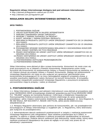 Regulamin sklepu internetowego dostępny jest pod adresem internetowym: • http://dstreet.pl/Regulamin-cabout-pol-23.html • http://dstreet.com.pl/regulamin.pdf REGULAMIN SKLEPU INTERNETOWEGO DSTREET.PL SPIS TREŚCI: 1. 2. 3. 4. 5. 6. POSTANOWIENIA OGÓLNE USŁUGI ELEKTRONICZNE W SKLEPIE INTERNETOWYM WARUNKI ZAWIERANIA UMOWY SPRZEDAŻY SPOSOBY I TERMINY PŁATNOŚCI ZA PRODUKT KOSZT, SPOSOBY I TERMIN DOSTAWY PRODUKTU REKLAMACJA PRODUKTU (DOTYCZY UMÓW SPRZEDAŻY ZAWARTYCH DO 24 GRUDNIA 2014 ROKU) 7. REKLAMACJA PRODUKTU (DOTYCZY UMÓW SPRZEDAŻY ZAWARTYCH OD 25 GRUDNIA 2014 ROKU) 8. POZASĄDOWE SPOSOBY ROZPATRYWANIA REKLAMACJI I DOCHODZENIA ROSZCZEŃ ORAZ ZASADY DOSTĘPU DO TYCH PROCEDUR 9. PRAWO ODSTĄPIENIA OD UMOWY (DOTYCZY UMÓW SPRZEDAŻY ZAWARTYCH DO 24 GRUDNIA 2014 ROKU) 10.PRAWO ODSTĄPIENIA OD UMOWY (DOTYCZY UMÓW SPRZEDAŻY ZAWARTYCH OD 25 GRUDNIA 2014 ROKU) 11.POSTANOWIENIA DOTYCZĄCE PRZEDSIĘBIORCÓW 12.POSTANOWIENIA KOŃCOWE Sklep Internetowy www.dstreet.pl dba o prawa konsumenta. Konsument nie może zrzec się praw przyznanych mu w Ustawie o Prawach Konsumenta. Postanowienia umów mniej korzystne dla konsumenta niż postanowienia Ustawy o Prawach Konsumenta są nieważne, a w ich miejsce stosuje się przepisy Ustawy o Prawach Konsumenta. Dlatego też postanowienia niniejszego Regulaminu nie mają na celu wyłączać ani ograniczać jakichkolwiek praw konsumentów przysługujących im na mocy bezwzględnie wiążących przepisów prawa, a wszelkie ewentualne wątpliwości należy tłumaczyć na korzyść konsumenta. W przypadku ewentualnej niezgodności postanowień niniejszego Regulaminu z powyższymi przepisami, pierwszeństwo mają te przepisy i należy je stosować. 1. POSTANOWIENIA OGÓLNE 1.1. Sklep Internetowy dostępny pod adresem internetowym www.dstreet.pl prowadzony jest przez GRZEGORZA DROP prowadzącego działalność gospodarczą pod firmą GRZEGORZ DROP F.H. "MILANO" wpisany do Centralnej Ewidencji i Informacji o Działalności Gospodarczej Rzeczypospolitej Polskiej prowadzonej przez ministra właściwego do spraw gospodarki, posiadający: adres miejsca wykonywania działalności i adres do doręczeń: ul. Jana Długosza 5, 98-300 Wieluń, NIP 8321949717, REGON 100775146, adres poczty elektronicznej: [email protected]. 1.2. Niniejszy Regulamin skierowany jest zarówno do konsumentów, jak i do przedsiębiorców korzystających ze Sklepu Internetowego (z wyjątkiem pkt. 11 Regulaminu, który skierowany jest wyłącznie do przedsiębiorców). 1.3. Administratorem danych osobowych przetwarzanych w związku z realizacją postanowień niniejszego Regulaminu jest Usługodawca. Dane osobowe przetwarzane są w celach, w zakresie i w oparciu o zasady wskazane w polityce prywatności opublikowanej na stronach Sklepu Internetowego. Podanie danych osobowych jest dobrowolne. Każda osoba, której dane osobowe przetwarza Usługodawca ma prawo do wglądu w ich treść oraz prawo do ich aktualizacji i poprawiania. 1.4. Definicje: 1.4.1. DZIEŃ ROBOCZY - jeden dzień od poniedziałku do piątku z wyłączeniem dni ustawowo wolnych od pracy. 1.4.2. FORMULARZ REJESTRACJI – formularz dostępny w Sklepie Internetowym umożliwiający utworzenie Konta. 1.4.3. FORMULARZ ZAMÓWIENIA – Usługa Elektroniczna, interaktywny formularz dostępny w Sklepie Internetowym umożliwiający złożenie Zamówienia, w szczególności poprzez dodanie Produktów do elektronicznego koszyka oraz określenie warunków Umowy Sprzedaży, w tym sposobu dostawy i płatności. 1.4.4. KLIENT – (1) osoba fizyczna posiadająca pełną zdolność do czynności prawnych, a w wypadkach przewidzianych przez przepisy powszechnie obowiązujące także osoba fizyczna posiadająca ograniczoną zdolność do czynności prawnych; (2) osoba prawna; albo (3) jednostka organizacyjna nieposiadająca osobowości prawnej, której ustawa przyznaje zdolność prawną; - która zawarła lub zamierza zawrzeć Umowę Sprzedaży ze Sprzedawcą. 1.4.5. KODEKS CYWILNY – ustawa kodeks cywilny z dnia 23 kwietnia 1964 r. (Dz.U. 1964 nr 16, poz. 93 ze zm.). 1.4.6. KONTO – Usługa Elektroniczna, oznaczony indywidualną nazwą (loginem) i hasłem podanym przez Usługobiorcę zbiór zasobów w systemie teleinformatycznym Usługodawcy, w którym gromadzone są dane podane przez Usługobiorcę oraz informacje o złożonych przez niego Zamówieniach w Sklepie Internetowym. 1.4.7. NEWSLETTER – Usługa Elektroniczna, elektroniczna usługa dystrybucyjna świadczona przez Usługodawcę za pośrednictwem poczty elektronicznej e-mail, która umożliwia wszystkim korzystającym z niej Usługobiorcom automatyczne otrzymywanie od Usługodawcy cyklicznych treści kolejnych edycji newslettera zawierającego informacje o Produktach, nowościach i promocjach w Sklepie Internetowym. 1.4.8. PRODUKT – dostępna w Sklepie Internetowym rzecz ruchoma będąca przedmiotem Umowy Sprzedaży między Klientem a Sprzedawcą. 1.4.9. REGULAMIN – niniejszy regulamin Sklepu Internetowego. 1.4.10. SKLEP INTERNETOWY - sklep internetowy Usługodawcy dostępny pod adresem internetowym: www.dstreet.pl. 1.4.11. SPRZEDAWCA; USŁUGODAWCA – GRZEGORZ DROP prowadzącey działalność gospodarczą pod firmą GRZEGORZ DROP F.H. "MILANO" wpisany do Centralnej Ewidencji i Informacji o Działalności Gospodarczej Rzeczypospolitej Polskiej prowadzonej przez ministra właściwego do spraw gospodarki, posiadający: adres miejsca wykonywania działalności i adres do doręczeń: ul. Jana Długosza 5, 98-300 Wieluń, NIP 8321949717, REGON 100775146, adres poczty elektronicznej: [email protected]. 1.4.12. UMOWA SPRZEDAŻY – umowa sprzedaży Produktu zawierana albo zawarta między Klientem a Sprzedawcą za pośrednictwem Sklepu Internetowego. 1.4.13. USŁUGA ELEKTRONICZNA – usługa świadczona drogą elektroniczną przez Usługodawcę na rzecz Usługobiorcy za pośrednictwem Sklepu Internetowego. 1.4.14. USŁUGOBIORCA – (1) osoba fizyczna posiadająca pełną zdolność d