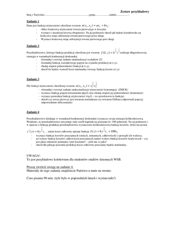Zestaw przykładowy Imi i Nazwisko .................................................................grupa.....................indeks................... Zadanie 1 Dana jest funkcja u yteczno ci okre lona wzorem u ( x1 , x 2 ) = ax1 + bx 2 : - oblicz kra cow u yteczno towaru pierwszego w koszyku - wyznacz i naszkicuj krzyw oboj tno ci. Na jej podstawie okre l jak b dzie kształtowała si kra cowa stopa substytucji towaru pierwszego przez drugi. - Wyznacz kra cow stop substytucji towaru pierwszego prze drugi. Zadanie 2 1 1 Przedsi biorstwo, którego funkcja produkcji okre lona jest wzorem f ( k , z ) = k 3 z 3 realizuje długookresow strategi w warunkach konkurencji doskonałej: - sformułuj i rozwi zadanie minimalizacji wydatków Z2 - sformułuj funkcj warunkowego popytu na czynniki produkcji ϕ (v,y), - zbadaj stopie jednorodno ci funkcji ϕ (v,y), - okre l ile b dzie wynosił koszt minimalny tworz c funkcj kosztu c(v,y) Zadanie 3 1 1 Dla funkcji u yteczno ci okre lonej wzorem u ( x1 , x 2 ) = x14 x 22 - sformułuj i rozwi zadanie maksymalizacji u yteczno ci konsumpcji (ZMUK) - wyznacz funkcj popytu konsumenta ϕ(p,I) oraz zbadaj stopie jej jednorodno ci (komentarz) - wyznacz po redni funkcj u yteczno ci ν(p,I) – (co przedstawia ta funkcja) - okre l czy towar pierwszy jest towarem normalnym czy towarem Giffena (odpowied poprzyj odpowiednimi obliczeniami) Zadanie 4 Przedsi biorstwo działaj c w warunkach konkurencji doskonałej wyznacza swoj strategi krótkookresow . Wiadomo, e przedsi biorstwo utrzymuje stały zasób kapitału na poziomie k= 100 jednostek. Na tej podstawie i w oparciu o funkcj produkcji przedsi biorstwa wyznaczono krótkookresow funkcj kosztów, która ma posta 3 2 3 2 c ( y ) = 6 y v z , zatem koszt całkowity opisuje funkcja k ( y ) = 6 y v z + 100v k 1 - wyznacz funkcje kosztów przeci tnych (stałych, zmiennych, całkowitych) i sporz d ich wykresy, na wykres funkcji kosztów całkowitych przeci tnych nanie wykres funkcji kosztów kra cowych – czy jest jaka zale no pomi dzy tymi kosztami? – je li tak, to jaka? okre l dla jakiego poziomu produkcji koszt całkowity przeci tny b dzie minimalny. UWAGA!. To jest przykładowe kolokwium dla studentów studiów dziennych WSB. Prosz zwróci uwag na zadanie 4. Materiały do tego zadania znajdziecie Pa stwo u mnie na stronie. Czas pisania 90 min. (tyle było w poprzednich latach i wystarczało!)