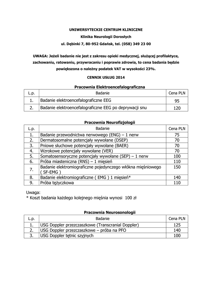 UNIWERSYTECKIE CENTRUM KLINICZNE Klinika Neurologii Dorosłych ul. Dębinki 7, 80-952 Gdańsk, tel. (058) 349 23 00 UWAGA: Jeżeli badanie nie jest z zakresu opieki medycznej, służącej profilaktyce, zachowaniu, ratowaniu, przywracaniu i poprawie zdrowia, to cena badania będzie powiększona o należny podatek VAT w wysokości 23%. CENNIK USŁUG 2014 Pracownia Elektroencefalograficzna L.p. Badanie Cena PLN 1. Badanie elektroencefalograficzne EEG 95 2. Badanie elektroencefalograficzne EEG po deprywacji snu 120 Pracownia Neurofizjologii L.p. 1. 2. 3. 4. 5. 6. 7. 8. 9. Badanie Badanie przewodnictwa nerwowego (ENG) – 1 nerw Dermatosomalne potencjały wywołane (DSEP) Pniowe słuchowe potencjały wywołane (BAER) Wzrokowe potencjały wywołane (VER) Somatosensoryczne potencjały wywołane (SEP) – 1 nerw Próba miasteniczna (RNS) – 1 mięsień Badanie elektromiograficzne pojedynczego włókna mięśniowego ( SF-EMG ) Badanie elektromiograficzne ( EMG ) 1 mięsień* Próba tężyczkowa Cena PLN 75 70 70 70 100 110 150 140 110 Uwaga: * Koszt badania każdego kolejnego mięśnia wynosi 100 zł Pracownia Neurosonologii L.p. 1. 2. 3. Badanie USG Doppler przezczaszkowe (Transcranial Doppler) USG Doppler przezczaszkowe – próba na PFO USG Doppler tętnic szyjnych Cena PLN 125 140 100