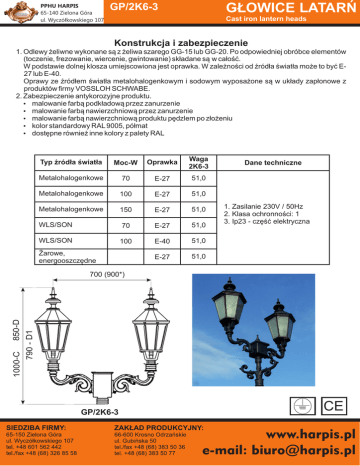 PPHU HARPIS 65-140 Zielona Góra ul. Wyczółkowskiego 107 GŁOWICE LATARŃ GP/2K6-3 Cast iron lantern heads Konstrukcja i zabezpieczenie 1. Odlewy żeliwne wykonane są z żeliwa szarego GG-15 lub GG-20. Po odpowiedniej obróbce elementów (toczenie, frezowanie, wiercenie, gwintowanie) składane są w całość. W podstawie dolnej klosza umiejscowiona jest oprawka. W zależności od źródła światła może to być E27 lub E-40. Oprawy ze źródłem światła metalohalogenkowym i sodowym wyposażone są w układy zapłonowe z produktów firmy VOSSLOH SCHWABE. 2. Zabezpieczenie antykorozyjne produktu. malowanie farbą podkładową przez zanurzenie malowanie farbą nawierzchniową przez zanurzenie malowanie farbą nawierzchniową produktu pędzlem po złożeniu kolor standardowy RAL 9005, półmat dostępne również inne kolory z palety RAL Typ źródła światła Moc-W Oprawka Waga 2K6-3 Metalohalogenkowe 70 E-27 51,0 Metalohalogenkowe 100 E-27 51,0 Metalohalogenkowe 150 E-27 51,0 WLS/SON 70 E-27 51,0 WLS/SON 100 E-40 51,0 E-27 51,0 Żarowe, energooszczędne Dane techniczne 1. Zasilanie 230V / 50Hz 2. Klasa ochronności: 1 3. Ip23 - część elektryczna 790 - D1 1000-C 850-D 700 (900*) CE GP/2K6-3 SŻ/02 H=2760 SŻ/04 H=2060