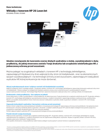 Dane techniczne Wkłady z tonerem HP 26 LaserJet (CF226XD, CF226X, CF226A) Idealne rozwiązanie do tworzenia czarno-białych wydruków o stałej, wysokiej jakości z dużą prędkością, do jakiej stworzona została Twoja drukarka lub urządzenie wielofunkcyjne HP, z jednoczesną ochroną przed oszustami. Można polegać na oryginalnych wkładach z tonerem HP z technologią JetIntelligence, zapewniających błyskawiczny druk większej liczby stron niż kiedykolwiek , oraz na ekonomicznych opcjach wysokowydajnych i na technologii ochrony przed oszustwami, zapewniającymi stałą jakość wydruków HP, której konkurencja nie może dorównać. 1 2 Więcej wydrukowanych stron i większa wartość niż kiedykolwiek wcześniej 1 Większa wydajność druku z każdego wkładu1. Oryginalne wkłady z tonerem HP z technologią JetIntelligence zapewniają drukowanie większej liczby stron niż kiedykolwiek1. Możesz polegać na inteligentnym śledzeniu poziomu tonera oraz na ekonomicznych, wysokowydajnych opcjach2,3. Lepsze wykorzystanie inwestycji. Technologia Page Maximiser zapewnia drukowanie większej liczby stron z jednego wkładu niż kiedykolwiek.1 Drukowanie z dużą prędkością – bez wpływu na jakość Drukuj dokumenty o stałej, wysokiej jakości z dużą prędkością, do jakiej stworzono Twoją drukarkę lub urządzenie wielofunkcyjne HP. Oryginalne wkłady z tonerem HP z technologią JetIntelligence są przeznaczone do pracy z szybkimi drukarkami i zapewniają rezultaty oczekiwane przez użytkowników. Nawet w przypadku dużej prędkości druku można być pewnym stałej jakości wydruków dzięki oryginalnym wkładom z tonerem HP z technologią JetIntelligence. Zapewnij stałą jakość wydruków i korzystaj z ochrony przed oszustami Pomóż chronić swoją firmę przed podrabianymi wkładami z innowacyjną technologią HP zapewniającą ochronę przed podróbkami. Zarządzaj kosztami biznesowymi i utrzymuj standardy jakości wydruków z drukarek i urządzeń wielofunkcyjnych HP LaserJet dzięki strategiom korzystania wyłącznie z oryginalnych materiałów eksploatacyjnych HP oraz ochronie wkładów. Pomóż zapewnić jakość wydruków HP z innowacyjną technologią ochrony przed podróbkami. Pomóż chronić swoją inwestycję Większa liczba wydruków z drukarki lub urządzenia wielofunkcyjnego HP1. Oryginalne wkłady z tonerem HP z technologią JetIntelligence zostały zaprojektowane do współpracy z szybkimi drukarkami oraz do zapewniania stałej jakości wydruków. Wybierz oryginalny wkład z tonerem HP, który najlepiej wykorzysta możliwości Twojej drukarki. W przypadku drukowania z dużą prędkością nadal możesz polegać na precyzyjnym czarnym tonerze o specjalnej formule. W oparciu o wartości wydajności wkładów według normy ISO/IEC 19752 dla oryginalnego, wysokowydajnego wkładu z czarnym tonerem HP 80X LaserJet w porównaniu z oryginalnymi, wysokowydajnymi wkładami z czarnym tonerem HP 26X LaserJet. Więcej informacji jest dostępnych na stronie hp.com/go/learnaboutsupplies. 2 Oryginalne, wysokowydajne wkłady z czarnym tonerem HP 26X LaserJet nie stanowią części zestawu drukarki; wymagany jest osobny zakup. Więcej informacji jest dostępnych na stronie hp.com/go/learnaboutsupplies. 3 W porównaniu ze wskaźnikami poziomu we wkładach do starszych produktów. 1 Dane techniczne | Wkłady z tonerem HP 26 LaserJet Informacje o zgodności Drukarki HP LaserJet Pro seria M402; Urządzenia wielofunkcyjne HP LaserJet Pro seria M426 Dane techniczne produktu P/N Opis CF226XD Średnia wydajność kasety z tonerem * Wymiary (dł x szer x gł) Waga Kod UPC HP 26X – zestaw 2 czarnych, oryginalnych wkładów Na wkład: 9000 stron z tonerem XL 362 × 204 × 227 mm 2,7 kg 190780576106 CF226X HP 26X oryginalny, wysokowydajny wkład z czarnym 9000 stron tonerem 362 x 102 x 227 mm 1,23 kg 889296154778 CF226A HP 26A oryginalny wkład z czarnym tonerem 362 x 102 x 198 mm 1,0 kg 889296154761 3100 stron Gwarancja Gwarancja HP Premium Protection. HP gwarantuje, że ten produkt jest wolny od wad materiałowych i produkcyjnych. Aby uzyskać więcej informacji na temat materiałów konsumpcyjnych HP, odwiedź http://www.hp.com Produkt może odbiegać wyglądem od widocznego na ilustracjach. © Copyright 2016 HP Development Company, L.P. Informacje zawarte w niniejszym dokumencie mogą ulec zmianie bez powiadomienia. Jedyne gwarancje, jakich firma HP udziela na produkty i usługi, są określone w oświadczeniach gwarancyjnych dostarczanych wraz z tymi produktami i usługami. Żadne informacje przedstawione w niniejszym dokumencie nie powinny być interpretowane jako dodatkowa gwarancja. Firma HP nie ponosi odpowiedzialności za błędy techniczne lub redakcyjne oraz braki występujące w niniejszym dokumencie. 4AA5-9764PLE, Grudzień 2016