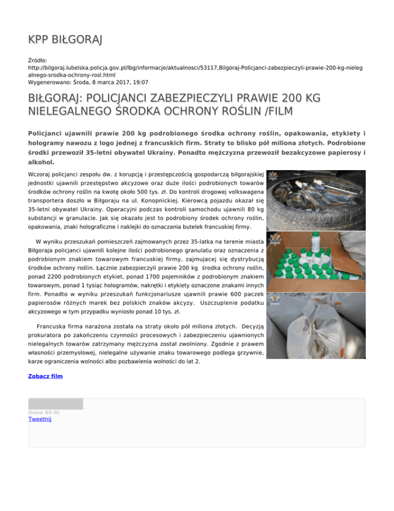 KPP BIŁGORAJ Źródło: http://bilgoraj.lubelska.policja.gov.pl/lbg/informacje/aktualnosci/53117,Bilgoraj-Policjanci-zabezpieczyli-prawie-200-kg-nieleg alnego-srodka-ochrony-rosl.html Wygenerowano: Środa, 8 marca 2017, 19:07 BIŁGORAJ: POLICJANCI ZABEZPIECZYLI PRAWIE 200 KG NIELEGALNEGO ŚRODKA OCHRONY ROŚLIN /FILM Policjanci ujawnili prawie 200 kg podrobionego środka ochrony roślin, opakowania, etykiety i hologramy nawozu z logo jednej z francuskich firm. Straty to blisko pół miliona złotych. Podrobione środki przewoził 35-letni obywatel Ukrainy. Ponadto mężczyzna przewoził bezakcyzowe papierosy i alkohol. Wczoraj policjanci zespołu dw. z korupcją i przestępczością gospodarczą biłgorajskiej jednostki ujawnili przestępstwo akcyzowe oraz duże ilości podrobionych towarów środków ochrony roślin na kwotę około 500 tys. zł. Do kontroli drogowej volkswagena transportera doszło w Biłgoraju na ul. Konopnickiej. Kierowcą pojazdu okazał się 35-letni obywatel Ukrainy. Operacyjni podczas kontroli samochodu ujawnili 80 kg substancji w granulacie. Jak się okazało jest to podrobiony środek ochrony roślin, opakowania, znaki holograficzne i naklejki do oznaczania butelek francuskiej firmy. W wyniku przeszukań pomieszczeń zajmowanych przez 35-latka na terenie miasta Biłgoraja policjanci ujawnili kolejne ilości podrobionego granulatu oraz oznaczenia z podrobionym znakiem towarowym francuskiej firmy, zajmujacej się dystrybucją środków ochrony roślin. Łącznie zabezpieczyli prawie 200 kg środka ochrony roślin, ponad 2200 podrobionych etykiet, ponad 1700 pojemników z podrobionym znakiem towarowym, ponad 1 tysiąc hologramów, nakrętki i etykiety oznaczone znakami innych firm. Ponadto w wyniku przeszukań funkcjonariusze ujawnili prawie 600 paczek papierosów różnych marek bez polskich znaków akcyzy. Uszczuplenie podatku akcyzowego w tym przypadku wyniosło ponad 10 tys. zł. Francuska firma narażona została na straty około pół miliona złotych. Decyzją prokuratora po zakończeniu czynności procesowych i zabezpieczeniu ujawnionych nielegalnych towarów zatrzymany mężczyzna został zwolniony. Zgodnie z prawem własności przemysłowej, nielegalne używanie znaku towarowego podlega grzywnie, karze ograniczenia wolności albo pozbawienia wolności do lat 2. Zobacz film Ocena: 0/5 (0) Tweetnij