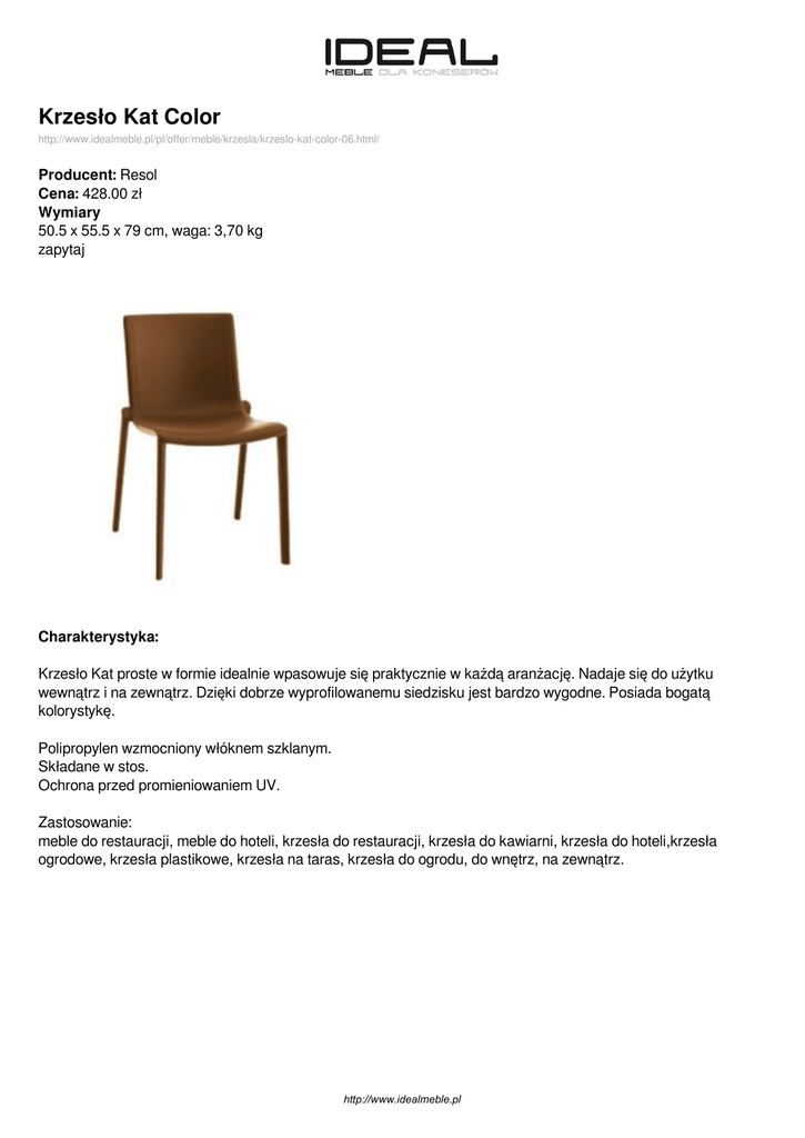 Krzesło Kat Color http://www.idealmeble.pl/pl/offer/meble/krzesla/krzeslo-kat-color-06.html/ Producent: Resol Cena: 428.00 zł Wymiary 50.5 x 55.5 x 79 cm, waga: 3,70 kg zapytaj Charakterystyka: Krzesło Kat proste w formie idealnie wpasowuje się praktycznie w każdą aranżację. Nadaje się do użytku wewnątrz i na zewnątrz. Dzięki dobrze wyprofilowanemu siedzisku jest bardzo wygodne. Posiada bogatą kolorystykę. Polipropylen wzmocniony włóknem szklanym. Składane w stos. Ochrona przed promieniowaniem UV. Zastosowanie: meble do restauracji, meble do hoteli, krzesła do restauracji, krzesła do kawiarni, krzesła do hoteli,krzesła ogrodowe, krzesła plastikowe, krzesła na taras, krzesła do ogrodu, do wnętrz, na zewnątrz. http://www.idealmeble.pl Dostępne wersje produktu: nazwa produktu Krzesło Kat Color warianty kolor ecru cena 428.00zł dostępne Zapytaj Krzesło Kat Color kolor biały 428.00zł Zapytaj Krzesło Kat Color kolor zielony 428.00zł Zapytaj Krzesło Kat Color kolor czarny 428.00zł Zapytaj Krzesło Kat Color kolor pomarańczowy 428.00zł Zapytaj Krzesło Kat Color kolor brąz Zapytaj 428.00zł http://www.idealmeble.pl Zdjęcia produktu: http://www.idealmeble.pl Powered by TCPDF (www.tcpdf.org)