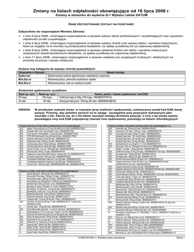Zmiany na listach odpłatności obowiązujące od 16 lipca 2008 r. Zmiany w stosunku do wydania Q-1 Wykazu Leków DATUM DANE PRZYGOTOWANE ZOSTAŁY NA PODSTAWIE: Załączników do rozporządzeń Ministra Zdrowia: ¾ z dnia 9 lipca 2008r. zmieniające rozporządzenie w sprawie wykazu leków podstawowych i uzupełniających oraz wysokości odpłatności za leki uzupełniające; ¾ z dnia 9 lipca 2008r. zmieniające rozporządzenie w sprawie wykazu chorób oraz wykazu leków i wyrobów medycznych, które ze względu na te choroby są przepisywane bezpłatnie, za opłatą ryczałtową lub za częściową odpłatnością; ¾ z dnia 9 lipca 2008r. zmieniające rozporządzenie w sprawie ustalenia limitów cen leków i wyrobów medycznych wydawanych świadczeniobiorcom bezpłatnie, za opłatą ryczałtową lub częściową odpłatnością; ¾ z dnia 11 lipca 2008r. zmieniające rozporządzenie w sprawie ustalenia cen urzędowych hurtowych i detalicznych na produkty lecznicze i wyroby medyczne. Dodano trzy kategorie do wykazu chorób przewlekłych: Oznaczenie w Wykazie Nazwa choroby Epider.bul Epidermolysis bullosa (pęcherzowe oddzielenie naskórka) Muk.Dys.rz Mukowiscydoza, pierwotna dyskineza rzęsek Muk.Res.tr Mukowiscydoza, stan po resekcji trzustki Zmienione opakowanie ryczałtowe Stare op. rycz. Nowe op. rycz. Nazwa, postać i dawka (opakowanie, kod EAN) 50 kaps. 100 kaps. CellCept kaps.0,25g (100 kaps. 5909990707614) 30 tabl. 60 tabl. Seroquel tabl.powl. 200mg (60 tabl. 5909990428816) UWAGA: W poniższym wykazie zmian, w nawiasie (przy wielkości opakowania), umieszczony został kod EAN danej pozycji. Prosimy, aby państwo zwrócili na to uwagę - szczególnie przy pozycjach wykazanych jako usunięte z list. Zdarza się, że z list leków usunięte zostają określone pozycje, a inne o tej samej nazwie, posiadające inny kod EAN (najczęściej również inne opakowanie), pozostają na listach refundacyjnych. Pozycje dopisane do listy leków podstawowych lub uzupełniających 30% Alugen 10mg tabl.prz.uw.10 mg (30 tabl(3 bl.x10szt) 5909990037933) 50% Cliovelle tabl.1+0,5 mg (28 tabl.(1 blis.) 5909990067794) 30% FLIX aer.nos. 50mcg/daw. (1 but.(120 daw.) 5909990570720) 50% HYPLAFIN tabl.powl.5 mg (30 tabl.(3 blis.) 5909990017997) 50% Indapres tabl.powl.2,5mg (30 tabl. 5909990223121) 50% Ketokonazol tabl. 200mg (10 tabl. 5909991045418) 30% Lantrea kaps.doj.tw.15mg (28 kaps. 5909990017898) 30% Lantrea kaps.doj.tw.30mg (28 kaps. 5909990017850) 30% Lescol XL tabl. o prz.uw. 80mg(28 tabl. 5909990501939) 50% Micardis tabl. 80mg (14 tabl. 5909990440818) 30% Pregnyl pr.+rozp.wstrz.5000 (3amp.+3amp.rozp.1ml 5909990501977) 50% Sumamed tabl.powl.125mg (6 tabl. 5909990501809) R Trandolapril-ratiopharm kaps.tw.2 mg (28 kaps. 5909990055142) R Trandolapril-ratiopharm kaps.tw.4 mg (28 kaps. 5909990055579) R Vermox tabl. 100mg (6 tabl. 5909990500949,6 tabl. 5909990501878) Pozycje usunięte z listy leków podstawowych lub uzupełniających R Abutol tabl.powl. 200mg (20 tabl. 5909990453214) R Amoxicillin Pliva kaps. 250mg (15 kaps. 5909990311712) R Amoxicilline kaps. 250mg (15 kaps. 5909990311712) R Amoxicilline p.ss.250mg/5ml (1 fl.60ml/15g 5909990057610) R Atenolol tabl. 50mg (20 tabl. w fiol. 5909990655533) R Bemecor kr.doust. 0,6mg/ml (1 fl.10ml 5909990174515) R BisoHEXAL 10 tabl.pow. 10 mg (30 tabl. 5909990969210) R BisoHEXAL 5 tabl.pow. 5 mg (30 tabl. 5909990969111) R Bisoprolol tabl.powl. 10mg (30 tabl. 5909991016616) R Bisoprolol tabl.powl. 5mg (30 tabl. 5909991016517) R Captopril tabl. 12,5mg (30 tab.fiol. (Polp.) 5909990655410) 30% Controloc 20 tabl.doj.20mg ( 7 tabl. 5909990478712, 7 tabl.w blis. 5909990478750) R Corinfar draż. 10mg (50 draż. 5909990240418) 30% Cyclo-Menorette tabl.draż. (1 zest.21 tabl.draż. 5909990020614) R Dexamethason 0,1% kr.ocz.zaw.1mg/ml (1 fl.10ml 5909990092314) R Diacordin 90 retard tab.powl.prz.uw.90mg(30 tabl. 5909990729418) 50% Diclac 50 tabl.powl.doj. 50mg (20 tabl. 5909990716616) 50% Dicortineff kr.do ocz.usz.zaw. (1 fl.10ml 5909990243211) 30% Diklonat P inj. 75mg/3ml (5 amp.3ml 5909991018412) 30% Dopanol tabl. 250mg (50 tabl. 5909990109517) R Enazil 10 tabl. 10mg (30 tabl. 5909991018214) R Enazil 20 tabl. 20mg (30 tabl. 5909991018313) R Enazil 5 tabl. 5mg (30 tabl. 5909991018115) Pozycje usunięte z listy leków podstawowych lub uzupełniających c.d. 50% Fenbufen tabl. 300mg (30 tabl. 5909990109616) 30% Fluconazol 150 kaps. 150mg (1 kaps. 5909990960019) 30% Fluconazol 50 kaps. 50mg (14 kaps. 5909990959921) R Gengraf kaps.twar. 100 mg (50 kaps. 5909990930326) R Gengraf kaps.twar. 25 mg (50 kaps. 5909990930128) R Gengraf kaps.twar. 50 mg (50 kaps. 5909990930227) 30% Gentamytrex kr.ocz.5mg/ml (1 fl. 5ml 5909990667710) 30% Glucosum 10% inj. 100mg/ml (10 amp.10ml 5909990203314) R Gopten 1,0 kaps. 1,0mg (28 kaps. 5909991084219) 50% Grofibrat 67 kaps. 67mg (30 kaps. 5909990905911,60 kaps. 5909990905928) 50% Groseptol tabl. 120mg (20 tabl. 5909990118014) 50% Groseptol tabl. 480mg (20 tabl. 5909990118113) 50% Heviran tabl.powl.800mg (30 tabl.w fiol. 5909990840212) 50% Indapen tabl.powl.2,5mg (20 tabl.w poj. 5909990863020,30 tabl. 5909990863037,60 tabl. 5909990863044) 50% Indapres tabl.powl.2,5mg (30 tabl. 5909990900718) 50% Indapsan tabl.powl.2,5mg (30 tabl. 5909990810819,60 tabl. 5909990810826) 50% Ketozol tabl. 200mg (20 tabl. 5909990348213) 50% Lipozil tabl.powl.450mg ( 30 tabl. 5909990355013, 60 tabl. 5909990355020) 30% Losec kaps.20mg ( 7 kaps. but. 5909990193714) 30% Lovasterol tabl.10mg (30 tabl.w fiol. 5909990828418) 30% Lovasterol tabl.40mg (30 tabl.w fiol. 5909990828616) R Methotrexat tabl.10mg (100 tabl. 5909990124114) R Methotrexat tabl.2,5mg (100 tabl. 5909990124015) R Metocard tabl. 100mg (30 tabl.w fiol. 5909990034512) R Metocard tabl. 50mg (30 tabl. 5909990034413) R Metoclopramidum tabl. 10mg (50 tabl.w fiol. 5909990084715) 50% Norbactin tabl.powl.400mg (10 tabl. 5909990088010) R Normocard tabl. 25mg (30 tabl. 5909990932917) 50% Oflodinex tabl.powl.100mg (1