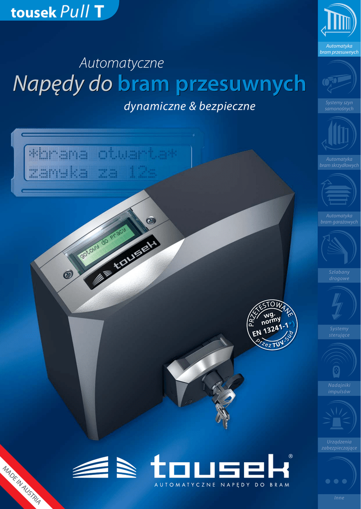tousek Pull T Automatyka bram przesuwnych Automatyczne Napędy do bram przesuwnych dynamiczne & bezpieczne Systemy szyn samonośnych Automatyka bram skrzydłowych Automatyka bram garażowych Szlabany drogowe Systemy sterujące Nadajniki impulsów Urządzenia zabezpieczające E AD M IN IA R ST AU Inne tousek Pull T Napęd dla wszystkich systemów bram przesuwnych każdą bramę dynamicznie wprawi w ruch, zarówno na posesji prywatnej jak i o większej częstotliwości pracy, również dla bram już istniejących Przekładnia z hartowanej stali w kąpieli olejowej Wszystkie modele serii Pull T wyposażone są seryjnie w masywną przekładnię stalową, od modelu T8 nawet dodatkowo hartowaną. Ponadto każda przekładnia pracuje w wysokojakościowej kąpieli olejowej, zapewniającej również przy niskich temperaturach optymalne smarowanie. Rezultat: podwyższona sprawność i jeszcze dłuższa żywotność. Jednoczęściowy korpus (aluminiowy odlew ciśnieniowy) Składa się w całości z odpornego na rdzę i wytrzymałego aluminium. Ponieważ korpus wykonany został jednoczęściowo, osiągnięto znaczne podwyższenie odporności na skręcanie i zginanie. Sensor Kolejną zaletą jest najnowszy sensor obrotów Pulla T. Odbiera on niewyobrażalne 6.200 sygnałów na sekundę! Dzięki temu napęd Pull T samoczynnie i permanentnie reguluje sobie siłę jaką w danym momencie potrzebuje brama. Okresowe ręczne regulacje siły nie są już potrzebne. Technologia ta powoduje, że napęd zwalniając zarówno poprzez miękki stop jak i ewentualne zwolnienie wymuszone przez bramę, nie traci na sile ! Uznane wysokie standardy bezpieczeństwa firmy tousek, przy tej serii napędów zostały jeszcze bardziej podniesione. Oczywiście Pull T spełnia normę europejską wg. EN 13241-1. Akumulator Na życzenie, można zainstalować akumulator bezpośrednio do napędu Pull T24 lub T24speed. Umożliwia to sterowanie bramą również przy braku prądu. Centralka sterująca Samouczące się pozycje krańcowe Bezpiecznie z systemem ARS Softstop (miękki stop) Pod pokrywą tousek Pull T znajduje się innowacyjna centralka sterująca najnowszej generacji. Kostki zaciskowe, bezpieczniki i przyciski programowania dostępne są bez zdejmowania obudowy centralki. W ten sposób płytka elektroniczna podczas uruchomienia i użytkowania pozostaje osłonięta przed deszczem, mechanicznymi uszkodzeniami oraz insektami. Wszystkie modele uczą się samoczynnie pozycji krańcowych podczas instalacji. Dodatkowo pozycje te można dokładniej „doregulować” dopasowując je do własnych potrzeb. Typowe mechaniczne wyłączniki krańcowe, które mogą zimą zamarzać lub podczas wieloletniej eksploatacji ulegać przesunięciom lub uszkodzeniom, po prostu stają się zbędne. ARS – Automatyczny Rewers System. Jeżeli brama najedzie na przeszkodę, napęd zatrzymuje się i zmienia kierunek jazdy, tak aby przeszkodę „uwolnić“. System ten jest niezależny od fotokomórek. Jest to najwyższy stopień bezpieczeństwa. Przy modelu Pull T8 do 800 kg nie jest konieczne stosowanie aktywnej listwy bezpieczeństwa na głównej krawędzi zamykania. W obydwóch kierunkach ruchu napęd zatrzymuje się ze zmniejszoną prędkością. Obok płynnego, harmonicznego ruchu i cichego stopu uzyskano w ten sposób ochronę mechaniki bramy oraz napędu, podnosząc tym samym ich żywotność. Oszczędny Zdejmowalny display PULL T pomaga oszczędzać drogocenną energię i czas. Inteligentna centralka sterująca wyłącza w trybie Sercem urządzenia jest display tekstowy widoczny od zewnątrz. Największa zaleta: jeden rzut oka na wyświetlacz czuwania wszystkie zbędne podzespoły i osiąga w ten sposób ekstremalnie niski pobór prądu w standby: wystarcza, aby dowiedzieć się o aktualnym stanie bramy i zmianach parametrów. Dzięki display’owi urucho- zaledwie ok. 1 Watt! mienie i montaż jak również wszelkie prace serwisowe i konserwacyjne zostają w dużym stopniu uproszczone. Display jest również zdejmowalny, więc nikt nie musi już „kucać” lub klęczeć programując napęd. duży podświetlany zdejmowalny display ciekłokrystaliczny LCD (2x16 znaków) z pełnotekstowym menu w języku polskim, sterowany za pomocą 4 przycisków sensor obrotów programowalna centralka Jeszcze nigdy przedtem programowanie centralki sterującej nie było tak komfortowe i bezpieczne. Poprzez cztery przyciski, duży widoczny od zewnątrz, podświetlany display i pełnotekstowe menu w języku polskim, można w sposób bardzo prosty, przyjazny dla użytkownika i oszczędzający czas, zaprogramować wszystkie potrzebne funkcje. gniazdo dla wpinanego odbiornika radiowego tousek Rolling Code elektroniczne rozpoznawanie pozycji krańcowych Napęd Pull T podczas uruchamiania rozpoznaje automatycznie pozycje krańcowe bramy i zapamiętuje je. Dodatkowo pozycje te można „doregulować” do własnych potrzeb. centralka w kapsule ochronnej regulowane częściowe otwarcie Nie tylko klasyczna funkcja furtki dla pieszych, czyli otwarcie 0,8m jest możliwa, lecz np. częściowe otwarcie dla samochodów osobowych i całkowite dla ciężarowych. Oczywiście obydwie funkcje mogą być realizowane również drogą radiową. zdejmowalne kostki zaciskowe pomoc przy podłączaniu Display „prowadzi dialog” z użytkownikiem, prowadząc go przez programowanie podstawowe, pomagając tym samym oszczędzać drogocenny czas. duża ilość miejsca dla kabli elektrycznych, dławiki gumowe listwa kontaktowa bezpieczeństwa przekładnia (ślimak i koło zębate) z hartowanej stali* jednoczęściowy korpus z aluminium (ciśnieniowy odlew) odryglowanie awaryjne zamykane na wkładkę patentową (pewne otwarcie również w zimie!) Do centralki Pull T można bezpośrednio podłączyć listwy kontaktowe 8,2 kOhm, oddzielnie dla głównej i bocznej krawędzi zamykania. W ten sposób odpada stosowanie kosztownej elektroniki sterującej listwą. Najechanie listwy na przeszkodę 