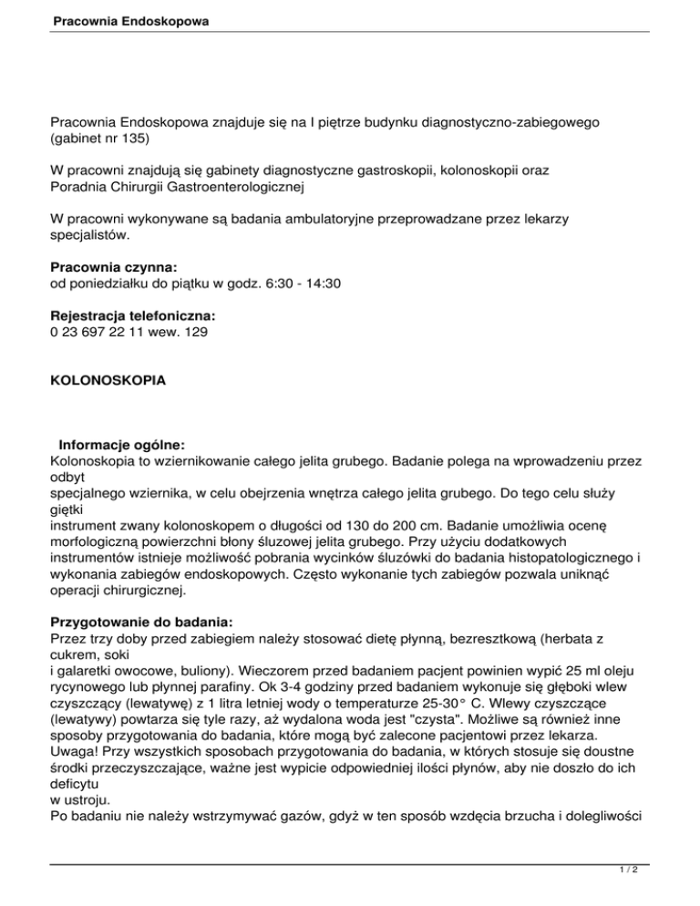 Pracownia Endoskopowa Pracownia Endoskopowa znajduje się na I piętrze budynku diagnostyczno-zabiegowego (gabinet nr 135) W pracowni znajdują się gabinety diagnostyczne gastroskopii, kolonoskopii oraz Poradnia Chirurgii Gastroenterologicznej W pracowni wykonywane są badania ambulatoryjne przeprowadzane przez lekarzy specjalistów. Pracownia czynna: od poniedziałku do piątku w godz. 6:30 - 14:30 Rejestracja telefoniczna: 0 23 697 22 11 wew. 129 KOLONOSKOPIA Informacje ogólne: Kolonoskopia to wziernikowanie całego jelita grubego. Badanie polega na wprowadzeniu przez odbyt specjalnego wziernika, w celu obejrzenia wnętrza całego jelita grubego. Do tego celu służy giętki instrument zwany kolonoskopem o długości od 130 do 200 cm. Badanie umożliwia ocenę morfologiczną powierzchni błony śluzowej jelita grubego. Przy użyciu dodatkowych instrumentów istnieje możliwość pobrania wycinków śluzówki do badania histopatologicznego i wykonania zabiegów endoskopowych. Często wykonanie tych zabiegów pozwala uniknąć operacji chirurgicznej. Przygotowanie do badania: Przez trzy doby przed zabiegiem należy stosować dietę płynną, bezresztkową (herbata z cukrem, soki i galaretki owocowe, buliony). Wieczorem przed badaniem pacjent powinien wypić 25 ml oleju rycynowego lub płynnej parafiny. Ok 3-4 godziny przed badaniem wykonuje się głęboki wlew czyszczący (lewatywę) z 1 litra letniej wody o temperaturze 25-30° C. Wlewy czyszczące (lewatywy) powtarza się tyle razy, aż wydalona woda jest "czysta". Możliwe są również inne sposoby przygotowania do badania, które mogą być zalecone pacjentowi przez lekarza. Uwaga! Przy wszystkich sposobach przygotowania do badania, w których stosuje się doustne środki przeczyszczające, ważne jest wypicie odpowiedniej ilości płynów, aby nie doszło do ich deficytu w ustroju. Po badaniu nie należy wstrzymywać gazów, gdyż w ten sposób wzdęcia brzucha i dolegliwości 1/2 Pracownia Endoskopowa bólowe ustąpią o wiele szybciej. Może wystąpić niewielkie krwawienie, nie wymagające leczenia. Czas badania: do kilkudziesięciu minut Badanie jest wykonywane na zlecenie lekarza. Może być wykonywane u pacjentów w każdym wieku i powtarzane wielokrotnie. 2/2
