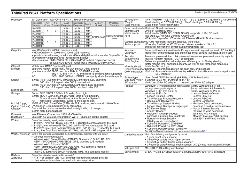 ThinkPad W541 Platform Specifications - PSRef`s