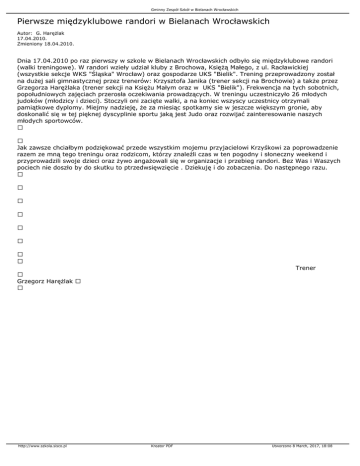 Gminny Zespół Szkół w Bielanach Wrocławskich Pierwsze międzyklubowe randori w Bielanach Wrocławskich Autor: G. Harężlak 17.04.2010. Zmieniony 18.04.2010. Dnia 17.04.2010 po raz pierwszy w szkole w Bielanach Wrocławskich odbyło się międzyklubowe randori (walki treningowe). W randori wzieły udział kluby z Brochowa, Księżą Małego, z ul. Racławickiej (wszystkie sekcje WKS "Śląska" Wrocław) oraz gospodarze UKS "Bielik". Trening przeprowadzony został na dużej sali gimnastycznej przez trenerów: Krzysztofa Janika (trener sekcji na Brochowie) a także przez Grzegorza Harężlaka (trener sekcji na Księżu Małym oraz w UKS "Bielik"). Frekwencja na tych sobotnich, popołudniowych zajęciach przerosła oczekiwania prowadzących. W treningu uczestniczyło 26 młodych judoków (młodzicy i dzieci). Stoczyli oni zacięte walki, a na koniec wszyscy uczestnicy otrzymali pamiątkowe dyplomy. Miejmy nadzieję, że za miesiąc spotkamy sie w jeszcze większym gronie, aby doskonalić się w tej pięknej dyscyplinie sportu jaką jest Judo oraz rozwijać zainteresowanie naszych młodych sportowców. Jak zawsze chciałbym podziękować przede wszystkim mojemu przyjacielowi Krzyśkowi za poprowadzenie razem ze mną tego treningu oraz rodzicom, którzy znaleźli czas w ten pogodny i słoneczny weekend i przyprowadzili swoje dzieci oraz żywo angażowali się w organizacje i przebieg randori. Bez Was i Waszych pociech nie doszło by do skutku to ptrzedwsięwzięcie . Dziekuję i do zobaczenia. Do następnego razu. Trener Grzegorz Harężlak http://www.szkola.sisco.pl Kreator PDF Utworzono 8 March, 2017, 18:08