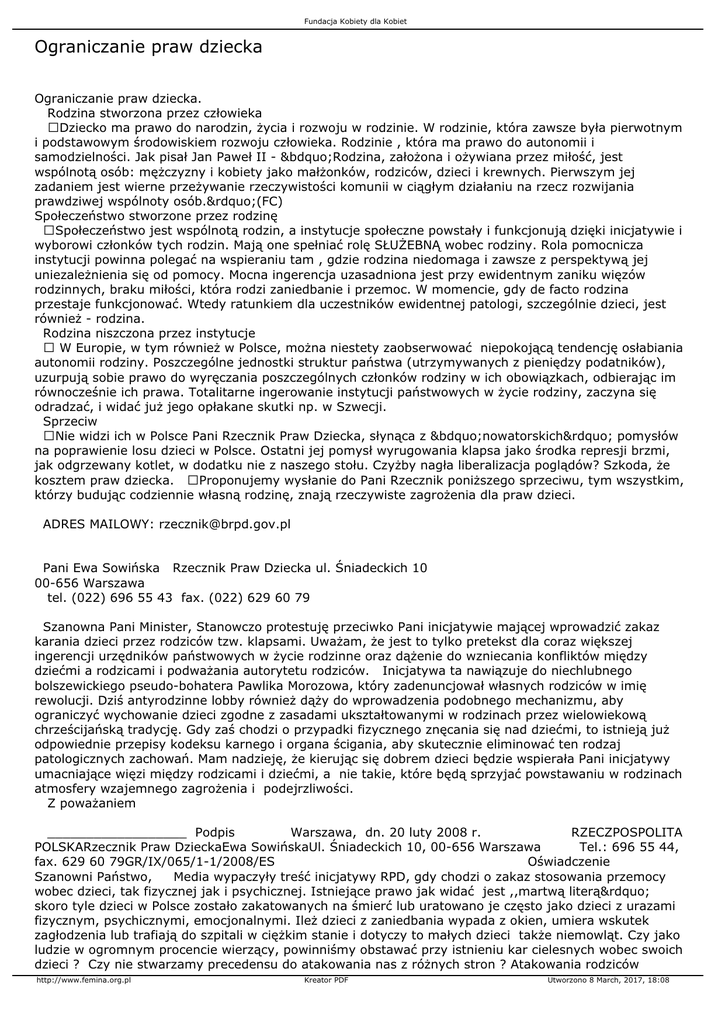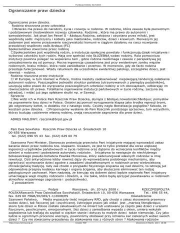 Fundacja Kobiety dla Kobiet Ograniczanie praw dziecka Ograniczanie praw dziecka. Rodzina stworzona przez człowieka Dziecko ma prawo do narodzin, życia i rozwoju w rodzinie. W rodzinie, która zawsze była pierwotnym i podstawowym środowiskiem rozwoju człowieka. Rodzinie , która ma prawo do autonomii i samodzielności. Jak pisał Jan Paweł II - „Rodzina, założona i ożywiana przez miłość, jest wspólnotą osób: mężczyzny i kobiety jako małżonków, rodziców, dzieci i krewnych. Pierwszym jej zadaniem jest wierne przeżywanie rzeczywistości komunii w ciągłym działaniu na rzecz rozwijania prawdziwej wspólnoty osób.”(FC) Społeczeństwo stworzone przez rodzinę Społeczeństwo jest wspólnotą rodzin, a instytucje społeczne powstały i funkcjonują dzięki inicjatywie i wyborowi członków tych rodzin. Mają one spełniać rolę SŁUŻEBNĄ wobec rodziny. Rola pomocnicza instytucji powinna polegać na wspieraniu tam , gdzie rodzina niedomaga i zawsze z perspektywą jej uniezależnienia się od pomocy. Mocna ingerencja uzasadniona jest przy ewidentnym zaniku więzów rodzinnych, braku miłości, która rodzi zaniedbanie i przemoc. W momencie, gdy de facto rodzina przestaje funkcjonować. Wtedy ratunkiem dla uczestników ewidentnej patologi, szczególnie dzieci, jest również - rodzina. Rodzina niszczona przez instytucje W Europie, w tym również w Polsce, można niestety zaobserwować niepokojącą tendencję osłabiania autonomii rodziny. Poszczególne jednostki struktur państwa (utrzymywanych z pieniędzy podatników), uzurpują sobie prawo do wyręczania poszczególnych członków rodziny w ich obowiązkach, odbierając im równocześnie ich prawa. Totalitarne ingerowanie instytucji państwowych w życie rodziny, zaczyna się odradzać, i widać już jego opłakane skutki np. w Szwecji. Sprzeciw Nie widzi ich w Polsce Pani Rzecznik Praw Dziecka, słynąca z „nowatorskich” pomysłów na poprawienie losu dzieci w Polsce. Ostatni jej pomysł wyrugowania klapsa jako środka represji brzmi, jak odgrzewany kotlet, w dodatku nie z naszego stołu. Czyżby nagła liberalizacja poglądów? Szkoda, że kosztem praw dziecka. Proponujemy wysłanie do Pani Rzecznik poniższego sprzeciwu, tym wszystkim, którzy budując codziennie własną rodzinę, znają rzeczywiste zagrożenia dla praw dzieci. ADRES MAILOWY: [email protected] Pani Ewa Sowińska Rzecznik Praw Dziecka ul. Śniadeckich 10 00-656 Warszawa tel. (022) 696 55 43 fax. (022) 629 60 79 Szanowna Pani Minister, Stanowczo protestuję przeciwko Pani inicjatywie mającej wprowadzić zakaz karania dzieci przez rodziców tzw. klapsami. Uważam, że jest to tylko pretekst dla coraz większej ingerencji urzędników państwowych w życie rodzinne oraz dążenie do wzniecania konfliktów między dziećmi a rodzicami i podważania autorytetu rodziców. Inicjatywa ta nawiązuje do niechlubnego bolszewickiego pseudo-bohatera Pawlika Morozowa, który zadenuncjował własnych rodziców w imię rewolucji. Dziś antyrodzinne lobby również dąży do wprowadzenia podobnego mechanizmu, aby ograniczyć wychowanie dzieci zgodne z zasadami ukształtowanymi w rodzinach przez wielowiekową chrześcijańską tradycję. Gdy zaś chodzi o przypadki fizycznego znęcania się nad dziećmi, to istnieją już odpowiednie przepisy kodeksu karnego i organa ścigania, aby skutecznie eliminować ten rodzaj patologicznych zachowań. Mam nadzieję, że kierując się dobrem dzieci będzie wspierała Pani inicjatywy umacniające więzi między rodzicami i dziećmi, a nie takie, które będą sprzyjać powstawaniu w rodzinach atmosfery wzajemnego zagrożenia i podejrzliwości. Z poważaniem __________________ Podpis Warszawa, dn. 20 luty 2008 r. RZECZPOSPOLITA POLSKARzecznik Praw DzieckaEwa SowińskaUl. Śniadeckich 10, 00-656 Warszawa Tel.: 696 55 44, fax. 629 60 79GR/IX/065/1-1/2008/ES Oświadczenie Szanowni Państwo, Media wypaczyły treść inicjatywy RPD, gdy chodzi o zakaz stosowania przemocy wobec dzieci, tak fizycznej jak i psychicznej. Istniejące prawo jak widać jest ,,martwą literą” skoro tyle dzieci w Polsce zostało zakatowanych na śmierć lub uratowano je często jako dzieci z urazami fizycznym, psychicznymi, emocjonalnymi. Ileż dzieci z zaniedbania wypada z okien, umiera wskutek zagłodzenia lub trafiają do szpitali w ciężkim stanie i dotyczy to małych dzieci także niemowląt. Czy jako ludzie w ogromnym procencie wierzący, powinniśmy obstawać przy istnieniu kar cielesnych wobec swoich dzieci ? Czy nie stwarzamy precedensu do atakowania nas z różnych stron ? Atakowania rodziców http://www.femina.org.pl Kreator PDF Utworzono 8 March, 2017, 18:08 Fundacja Kobiety dla Kobiet wychowujących swoje dzieci w poszanowaniu ich godności, wychowujących do wartości i ku dobru. Trzeba pokazać że to nie w zdrowych, tradycyjnych rodzinach tkwi zjawisko ,,krzywdzenia dzieci”. Dobrze wiemy gdzie i z jakich powodów ten problem istnieje. Możemy i musimy go zidentyfikować. Dajemy przykład rodzicielskiego trudu, miłości która wszystko znosi, wszystkiemu wierzy i we wszystkim pokłada nadzieję. Przykład rodziców jest i będzie dla dzieci wzorem w każdym wymiarze choćby nawet w tak wydawałoby się ,,przyziemnych” sprawach jak wrażliwość, pracowitość, uczciwość, oszczędność, ambicje, zainteresowania lub podziw wobec otaczającego nas świata przyrody. ,,Przyspieszenie świata” nie może w nas zniszczyć i osłabić czujności oraz pozbawić nas ideałów. Czy można swojej rodzinie nie służyć z radością w potrzebie, nie ofiarować czasu ? Czasu, który jest miłością wysłuchaniem, zrozumieniem ? Nigdy nie stracimy kontaktu z własnymi dziećmi, jeżeli będą wiedziały i czuły że mogą nam zaufać. Zatroskana, zasmucona twarz matki czy ojca, wymowne milczenie, to czytelne sygnały dla dzieci. Sygnały że postąpiły wbrew oczekiwaniom rodziców, że spotkał ich zawód, że potrzeba refleksji, pr