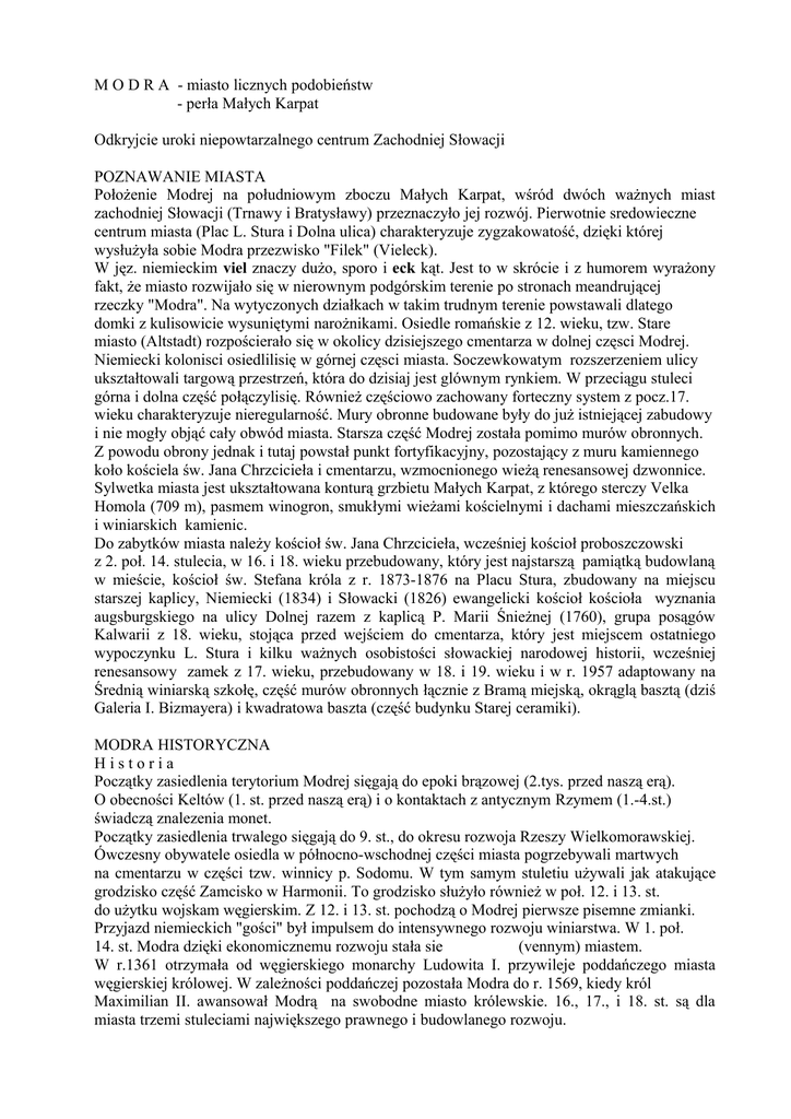 M O D R A - miasto licznych podobieństw - perła Małych Karpat Odkryjcie uroki niepowtarzalnego centrum Zachodniej Słowacji POZNAWANIE MIASTA Położenie Modrej na południowym zboczu Małych Karpat, wśród dwóch ważnych miast zachodniej Słowacji (Trnawy i Bratysławy) przeznaczyło jej rozwój. Pierwotnie sredowieczne centrum miasta (Plac L. Stura i Dolna ulica) charakteryzuje zygzakowatość, dzięki której wysłużyła sobie Modra przezwisko "Filek" (Vieleck). W jęz. niemieckim viel znaczy dużo, sporo i eck kąt. Jest to w skrócie i z humorem wyrażony fakt, że miasto rozwijało się w nierownym podgórskim terenie po stronach meandrującej rzeczky "Modra". Na wytyczonych działkach w takim trudnym terenie powstawali dlatego domki z kulisowicie wysuniętymi narożnikami. Osiedle romańskie z 12. wieku, tzw. Stare miasto (Altstadt) rozpościerało się w okolicy dzisiejszego cmentarza w dolnej częsci Modrej. Niemiecki kolonisci osiedlilisię w górnej częsci miasta. Soczewkowatym rozszerzeniem ulicy ukształtowali targową przestrzeń, która do dzisiaj jest glównym rynkiem. W przeciągu stuleci górna i dolna część połączylisię. Również częściowo zachowany forteczny system z pocz.17. wieku charakteryzuje nieregularność. Mury obronne budowane były do już istniejącej zabudowy i nie mogły objąć cały obwód miasta. Starsza część Modrej została pomimo murów obronnych. Z powodu obrony jednak i tutaj powstał punkt fortyfikacyjny, pozostający z muru kamiennego koło kościela św. Jana Chrzcicieła i cmentarzu, wzmocnionego wieżą renesansowej dzwonnice. Sylwetka miasta jest ukształtowana konturą grzbietu Małych Karpat, z którego sterczy Velka Homola (709 m), pasmem winogron, smukłymi wieżami kościelnymi i dachami mieszczańskich i winiarskich kamienic. Do zabytków miasta należy kościoł św. Jana Chrzcicieła, wcześniej kościoł proboszczowski z 2. poł. 14. stulecia, w 16. i 18. wieku przebudowany, który jest najstarszą pamiątką budowlaną w mieście, kościoł św. Stefana króla z r. 1873-1876 na Placu Stura, zbudowany na miejscu starszej kaplicy, Niemiecki (1834) i Słowacki (1826) ewangelicki kościoł kościoła wyznania augsburgskiego na ulicy Dolnej razem z kaplicą P. Marii Śnieżnej (1760), grupa posągów Kalwarii z 18. wieku, stojąca przed wejściem do cmentarza, który jest miejscem ostatniego wypoczynku L. Stura i kilku ważnych osobistości słowackiej narodowej historii, wcześniej renesansowy zamek z 17. wieku, przebudowany w 18. i 19. wieku i w r. 1957 adaptowany na Średnią winiarską szkołę, część murów obronnych łącznie z Bramą miejską, okrąglą basztą (dziś Galeria I. Bizmayera) i kwadratowa baszta (część budynku Starej ceramiki). MODRA HISTORYCZNA Historia Początky zasiedlenia terytorium Modrej sięgają do epoki brązowej (2.tys. przed naszą erą). O obecności Keltów (1. st. przed naszą erą) i o kontaktach z antycznym Rzymem (1.-4.st.) świadczą znalezenia monet. Początky zasiedlenia trwalego sięgają do 9. st., do okresu rozwoja Rzeszy Wielkomorawskiej. Ówczesny obywatele osiedla w północno-wschodnej części miasta pogrzebywali martwych na cmentarzu w części tzw. winnicy p. Sodomu. W tym samym stuletiu używali jak atakujące grodzisko część Zamcisko w Harmonii. To grodzisko służyło również w poł. 12. i 13. st. do użytku wojskam węgierskim. Z 12. i 13. st. pochodzą o Modrej pierwsze pisemne zmianki. Przyjazd niemieckich "gości" był impulsem do intensywnego rozwoju winiarstwa. W 1. poł. 14. st. Modra dzięki ekonomicznemu rozwoju stała sie (vennym) miastem. W r.1361 otrzymała od węgierskiego monarchy Ludowita I. przywileje poddańczego miasta węgierskiej królowej. W zależności poddańczej pozostała Modra do r. 1569, kiedy król Maximilian II. awansował Modrą na swobodne miasto królewskie. 16., 17., i 18. st. są dla miasta trzemi stuleciami największego prawnego i budowlanego rozwoju. Są związane z trzemi austriacko-węgierskimi cesarzami - Maximilianem II., Rudolfem II. i Matthiasem. Obywatele Modrej nazwali ich "ojcami miasta". Z ich bezpośredniego impulsu Modra powinna była dostosować się do reszty węgierskich królewskich miast "obwarowaniem murami, fortyfikacją i przyozdobieniem wieżami i bramami". Kolejnym obowiązkiem było założenie poddańczej osady (dzisiejsza miejscowa część "Kralowa"). Miasto nabyło nowe terytorialne podzielenie, które zachowało się do dzisiaj. Wewnętrzne miasto rozszerzone o nowe ulice w zachodniej części (centrum stanowiła dzisiejsza Dukelska ulica) było otoczone murami, wałem i fosą. Trzy nowozbudowane bramy - Dolna, Horna i Pezinska oddzielały trzy przedmieścia. Mury były umocnione dwiema basztami. Na rynku była zbudowana wież, która jest dzisiaj wieżą kościelna - kościoła św. Stefana króla, ratusz, w którym jest obecnie Muzeum L. Stura. Renesansowa przebudowa miasta dotknęła również winiarskich kamienic. W terytorium rynku były przebudowane na piętrowe mieszczańskie kamienice. Miasto nabyło nowej wartości. Ten rozwoj jednak nie był skończony z powodu sytuacje politycznej. Ostatnim budynkiem dokumentującym monumentalne architektoniczne tendencje Austrio-Węgierskiej monarchie jest budynek Seminarium nauczycielskiego, zbudowanego w latach 1884-1887. Dziś jest siedzibą Pedagogicznej i kulturnej akademii. MODRA - MIASTO WINOGRONA I WINIARSTWA Początki uprawiania winorogrona w Modrej niestety ciągle jeszcze nie znamy do końca. Pierwsze pisemne wzmianki są dopiero z 14. wieku. Tymczasem dochody z sprzedaży wina stanowili podstawę gospodarności. Szczyt winiarstwa w Modrej nastąpil, kiedy wojska tureckie zabłokowali drogi targowe w południowych częściach Węgier. Z tej sytuacji potrafiła Modra skorzystać. Pomyślną sprzedaża wina i rzemieslniczych produktów zaliczyła się Modra nie tylko do najważniejszych miast królewskich Węgier, ale też do najwięks