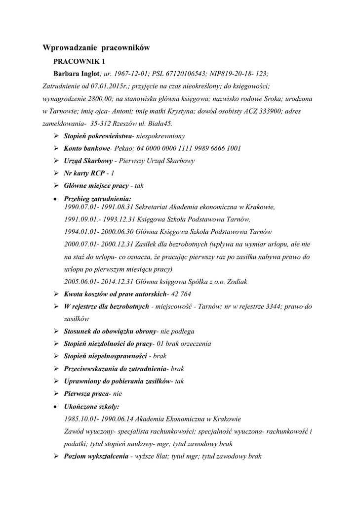 Wprowadzanie pracowników PRACOWNIK 1 Barbara Inglot; ur. 1967-12-01; PSL 67120106543; NIP819-20-18- 123; Zatrudnienie od 07.01.2015r.; przyjęcie na czas nieokreślony; do księgowości; wynagrodzenie 2800,00; na stanowisku główna księgowa; nazwisko rodowe Sroka; urodzona w Tarnowie; imię ojca- Antoni; imię matki Krystyna; dowód osobisty ACZ 333900; adres zameldowania- 35-312 Rzeszów ul. Biała45. Stopień pokrewieństwa- niespokrewniony Konto bankowe- Pekao; 64 0000 0000 1111 9989 6666 1001 Urząd Skarbowy - Pierwszy Urząd Skarbowy Nr karty RCP - 1 Główne miejsce pracy - tak Przebieg zatrudnienia: 1990.07.01- 1991.08.31 Sekretariat Akademia ekonomiczna w Krakowie, 1991.09.01.- 1993.12.31 Księgowa Szkoła Podstawowa Tarnów, 1994.01.01- 2000.06.30 Główna Księgowa Szkoła Podstawowa Tarnów 2000.07.01- 2000.12.31 Zasiłek dla bezrobotnych (wpływa na wymiar urlopu, ale nie na staż do urlopu- co oznacza, że pracując pierwszy raz po zasiłku nabywa prawo do urlopu po pierwszym miesiącu pracy) 2005.06.01- 2014.12.31 Główna księgowa Spółka z o.o. Zodiak Kwota kosztów od praw autorskich- 42 764 W rejestrze dla bezrobotnych - miejscowość - Tarnów; nr w rejestrze 3344; prawo do zasiłków Stosunek do obowiązku obrony- nie podlega Stopień niezdolności do pracy- 01 brak orzeczenia Stopień niepełnosprawności - brak Przeciwwskazania do zatrudnienia- brak Uprawniony do pobierania zasiłków- tak Pierwsza praca- nie Ukończone szkoły: 1985.10.01- 1990.06.14 Akademia Ekonomiczna w Krakowie Zawód wyuczony- specjalista rachunkowości; specjalność wyuczona- rachunkowość i podatki; tytuł stopień naukowy- mgr; tytuł zawodowy brak Poziom wykształcenia - wyższe 8lat; tytuł mgr; tytuł zawodowy brak Ukończone kursy 1) Rodzaj- Obsługa programów Finansowo- Księgowych; nazwa- Symfonia; Insert - termin zakończenia 2006.03.23; 2) Rodzaj- Kadry i Płace; nazwa - zakończenie 2008.11.10. Specjalności i uprawnienia Biegły rewident nr 123451 Języki obce 1) nazwa- niemiecki; w mowie-dobrze; w piśmie-słabo 2) nazwa -francuski; w mowie-słabo; w piśmie-słabo Dodatkowe umiejętności Gra na fortepianie Prawo jazdy Tak; kategoria B Potomstwo Konrad Inglot; ur. 1989.08.01; Tarnów Karol Inglot; ur. 1997.09.24; Rzeszów Współmałżonek Jan Inglot; ur. 1967.10.02; data ślubu 1987.07.11; Tarnów; nr 77/1987; pozostawanie we wspólnym gospodarstwie - tak Osobę, którą należy powiadomić- Jan Inglot- adres wpiszemy w terminie późniejszym Zgłoszenie do ubezpieczeń ubezp. Społ. i zdrowotne Tytuł ubezpieczenia- 0110 Ustalone prawo do emerytury - bez ustalonego prawa Stopień niepełnosprawności- brak Obowiązkowe ubezpieczenie społeczne i zdrowotne- emeryt.- tak; rentowe -tak; chorobowe- tak; wypadkowe- tak; data ubezp. społecznego 2015-01-07 - od daty zatrudnienia; ubezpieczenia zdrowotnego- 2015-01-07- od daty zatrudnienia Wykonywany zawód- ekonomista- specjalista rachunkowości Dane o kasie chorych- od kiedy opłacane są składki na ubezpieczenie zdrowotnepracodawca zgłasza pracownika i jego rodzinę Dobowa norma czasu pracy- 8h Tygodniowa - 40h Sposób wypłaty wynagrodzenia- przelewem na konto Bilans dodatku stażowego- w dacie od początku - data zatrudnienia w obecnej firmieprogram automatycznie wylicza lata i miesiąc i dni- 2015-01-07 Zbiorowy układ pracy- regulamin pracy Sposób potwierdzenia przybycia do pracy- podpisem na liście… Umowa o pracę- w większej części jest już wypełniona; należy uzupełnić - okres wypowiedzenia, ale wówczas kiedy jest znany np. przy umowie na czas określony; na czas nieokreślony zależy od czasu przepracowanego - data wydrukowania umowy- 2015-01-12 - nr umowy- 1/01/2015 - firma reprezentowana jest- prezesa Halina Kowalska Szkolenie BHP Ważne od 2015.01.07 do 2016.01.07 (0d początku do końca, czyli ważność szkolenia) Dzień szkolenia- data od 2015.01.07. data do 2015.01.07 Rodzaj instruktażu - ogólny Instruktor- As Marian Uaktywnienie bilansów urlopowych i chorobowych 1. Samodzielne wprowadzanie PRACOWNIK 2 Bąk Ewelina , przypisana do sekretariatu ,ur. 1967.03.08 , PSL 67030808967 ,NIP 819-12-13-123,Nr ewidencyjny 2, nr w FK 2, Zatrudnienie - 08.01.2015 r., czas nieokreślony, sekretarka, wynagrodzenie zasadnicze 2500, 00 nazwisko rodowe Staszic; urodzona w Rzeszowie; imię ojca Waldemar; matki Zuzanna; dowód osobisty AZZ 123900; zameldowanie: ul. Podwisłocze 12/98; Rzeszów 35-310; konto Millenium Bank 23 1234 6666 7777 8989 5666 0023; pierwszy urząd skarbowy. Stopień pokrewieństwa- niespokrewniony Konto bankowe- Millenium Bank 23 1234 6666 7777 8989 5666 0023; Urząd Skarbowy - Pierwszy Urząd Skarbowy Nr karty RCP - 2 Główne miejsce pracy - tak Zatrudnienie u poprzednich pracodawców : - 1987-01-10 do 2000-02-05 Szkoła Podstawowa , sekretarka, Rzeszów - 2000-10-01 do 2014-12-31 Liceum Ogólnokształcące, sekretarka, Rzeszów Kwota kosztów od praw autorskich- 42 764 Stosunek do obowiązku obrony- nie podlega Stopień niezdolności do pracy- 01 brak orzeczenia Stopień niepełnosprawności - brak Przeciwwskazania do zatrudnienia- brak Uprawniony do pobierania zasiłków- tak Pierwsza praca- nie Okres nauki : - 1982-10-01 do 1987.09.15 Akademia Ekonomiczna, Kraków Zawód wyuczony -ekonomista administracyjny; specjalność - administracja; tytuł stopień naukowy- mgr; tytuł zawodowy brak Poziom wykształcenia - wyższe 8lat; tytuł mgr; tytuł zawodowy brak Ukończone kursy: rodzaj-profesjonalna sekretarka; nazwa- pracownik administracyjny; rok ukończenia 2011.09.25 Języki obce : angielski, w mowie -bardzo dobrze, w piśmie - dobrze Potomstwo - Anna Bąk ur. 1997-02-02, Rzeszów; Marek Bąk ur. 2005 -05-03, Rzeszów . Współmałżonek - Michał Bąk, data ślubu 1987-07-09; nr aktu 1234; Rzeszów pozostawanie we wspólnym gospodarstwie - tak Osobę, którą należy powiadomić- Michał Bąk -wpisać adres zameldowania Zgłoszenie do ubezpieczeń ubezp. Społ. i zdrowotne Tytuł u