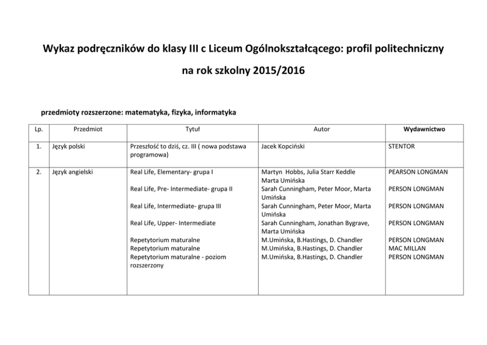 Wykaz podręczników do klasy III c Liceum Ogólnokształcącego: profil politechniczny na rok szkolny 2015/2016 przedmioty rozszerzone: matematyka, fizyka, informatyka Lp. Przedmiot Tytuł Autor Wydawnictwo 1. Język polski Przeszłośd to dziś, cz. III ( nowa podstawa programowa) Jacek Kopcioski STENTOR 2. Język angielski Real Life, Elementary- grupa I Martyn Hobbs, Julia Starr Keddle Marta Umioska Sarah Cunningham, Peter Moor, Marta Umioska Sarah Cunningham, Peter Moor, Marta Umioska Sarah Cunningham, Jonathan Bygrave, Marta Umioska M.Umioska, B.Hastings, D. Chandler M.Umioska, B.Hastings, D. Chandler M.Umioska, B.Hastings, D. Chandler PEARSON LONGMAN Real Life, Pre- Intermediate- grupa II Real Life, Intermediate- grupa III Real Life, Upper- Intermediate Repetytorium maturalne Repetytorium maturalne Repetytorium maturalne - poziom rozszerzony PERSON LONGMAN PERSON LONGMAN PERSON LONGMAN PERSON LONGMAN MAC MILLAN PERSON LONGMAN 3. Język niemiecki Welttour 2 i 3. 4. Język rosyjski Nowyje wstrieczi. 5. 6. Język hiszpaoski Matematyka 7. Historia i społeczeostwo 8. 9. Fizyka Informatyka 10. Wychowanie do życia w rodzinie Religia 11. Sylwia Dwornikowska, Katarzyna Szachowska Mirosław Zybert, Halina Dąbrowska NOWA ERA Espagnol. Lengu viva, cz. 1-4. Matematyka. Poziom rozszerzony. Zbiór zadao. Zakres rozszerzony. Poznad przeszłośd. Historia i społeczeostwo. Cz.III Wojna i wojskowośd (Icz. IV). Z fizyką w przyszłóśd Informatyka dla szkół ponadgimnazjalnych. Zakres rozszerzony. Wędrując ku dorosłości M. T. Martin, L. Perez, J. Ramos M. Kurczab, Świda M. Kurczab, Świda J. Centek PWN Pazdro Pazdro NOWA ERA M. Fijałkowska, B. Sagnowska, J. Salad Grażyna Koba ZAMKOR MiGra Pod red. T. Król, M. Ryś RUBIKON W bogactwie miłośd. E. Kondrak, ks. J Czerkawski, B. Nosek JEDNOŚD WSiP