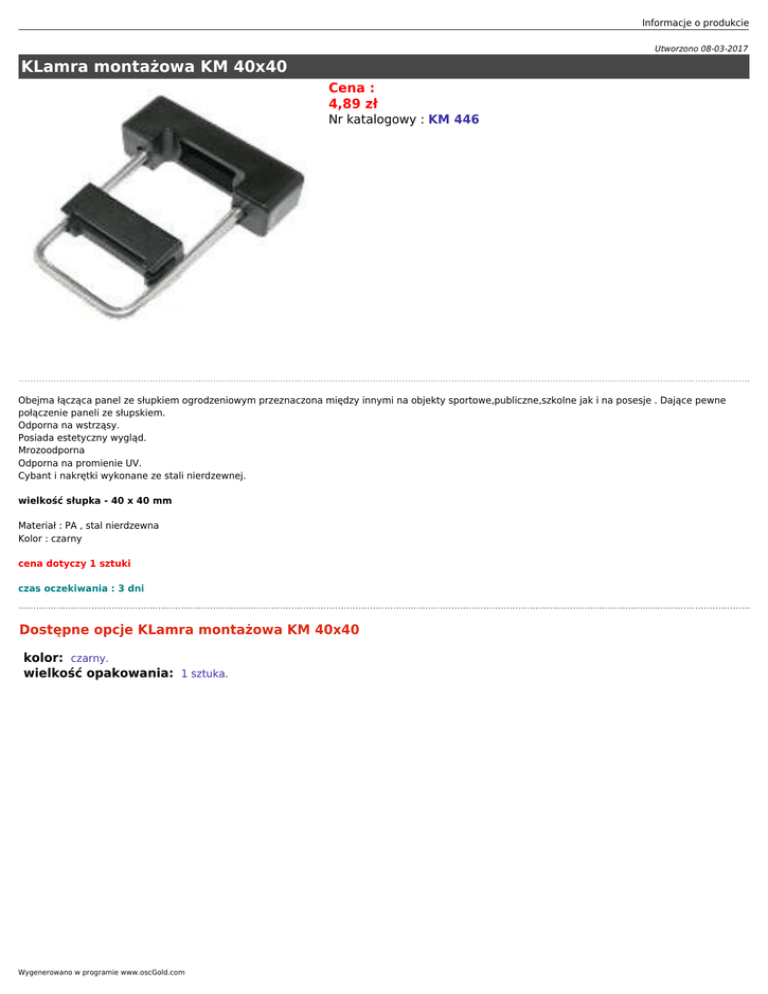 Informacje o produkcie Utworzono 08-03-2017 KLamra montażowa KM 40x40 Cena : 4,89 zł Nr katalogowy : KM 446 Obejma łącząca panel ze słupkiem ogrodzeniowym przeznaczona między innymi na objekty sportowe,publiczne,szkolne jak i na posesje . Dające pewne połączenie paneli ze słupskiem. Odporna na wstrząsy. Posiada estetyczny wygląd. Mrozoodporna Odporna na promienie UV. Cybant i nakrętki wykonane ze stali nierdzewnej. wielkość słupka - 40 x 40 mm Materiał : PA , stal nierdzewna Kolor : czarny cena dotyczy 1 sztuki czas oczekiwania : 3 dni Dostępne opcje KLamra montażowa KM 40x40 kolor: czarny. wielkość opakowania: 1 sztuka. Wygenerowano w programie www.oscGold.com