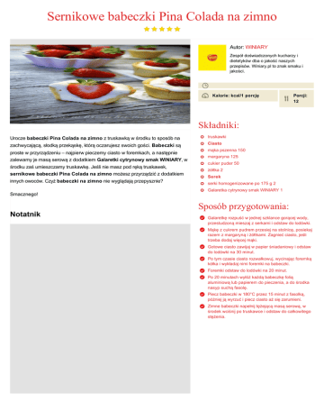 Sernikowe babeczki Pina Colada na zimno Autor: WINIARY Zespół doświadczonych kucharzy i dietetyków dba o jakość naszych przepisów. Winiary.pl to znak smaku i jakości. Kalorie: kcal/1 porcję Porcji: 12 Składniki: Urocze babeczki Pina Colada na zimno z truskawką w środku to sposób na truskawki zachwycającą, słodką przekąskę, którą oczarujesz swoich gości. Babeczki są Ciasto proste w przyrządzeniu – najpierw pieczemy ciasto w foremkach, a następnie zalewamy je masą serową z dodatkiem Galaretki cytrynowy smak WINIARY, w środku zaś umieszczamy truskawkę. Jeśli nie masz pod ręką truskawek, sernikowe babeczki Pina Colada na zimno możesz przyrządzić z dodatkiem innych owoców. Czyż babeczki na zimno nie wyglądają przepysznie? mąka pszenna 150 margaryna 125 cukier puder 50 żółtka 2 Serek serki homogenizowane po 175 g 2 Galaretka cytrynowy smak WINIARY 1 Smacznego! Sposób przygotowania: Notatnik Galaretkę rozpuść w jednej szklance gorącej wody, przestudzoną mieszaj z serkami i odstaw do lodówki. Mąkę z cukrem pudrem przesiej na stolnicę, posiekaj razem z margaryną i żółtkami. Zagnieć ciasto, jeśli trzeba dodaj więcej mąki. Gotowe ciasto zawijaj w papier śniadaniowy i odstaw do lodówki na 30 minut. Po tym czasie ciasto rozwałkowuj, wycinając foremką kółka i wykładaj nimi foremki na babeczki. Foremki odstaw do lodówki na 20 minut. Po 20 minutach wyłóż każdą babeczkę folią aluminiową lub papierem do pieczenia, a do środka nasyp suchą fasolę. Piecz babeczki w 180°C przez 15 minut z fasolką, później ją wyrzuć i piecz ciasto aż się zarumieni. Zimne babeczki napełnij tężejącą masą serową, w środek wciśnij po truskawce i odstaw do całkowitego stężenia.