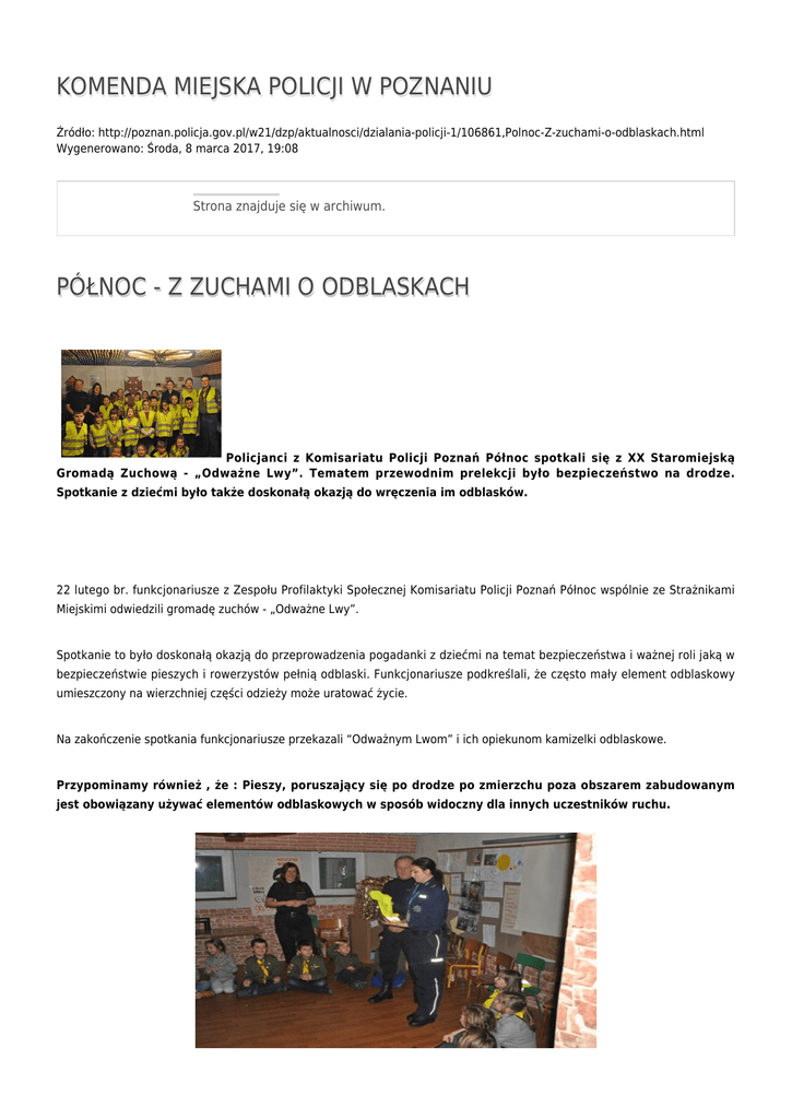 KOMENDA MIEJSKA POLICJI W POZNANIU Źródło: http://poznan.policja.gov.pl/w21/dzp/aktualnosci/dzialania-policji-1/106861,Polnoc-Z-zuchami-o-odblaskach.html Wygenerowano: Środa, 8 marca 2017, 19:08 Strona znajduje się w archiwum. PÓŁNOC - Z ZUCHAMI O ODBLASKACH Policjanci z Komisariatu Policji Poznań Północ spotkali się z XX Staromiejską Gromadą Zuchową - „Odważne Lwy”. Tematem przewodnim prelekcji było bezpieczeństwo na drodze. Spotkanie z dziećmi było także doskonałą okazją do wręczenia im odblasków. 22 lutego br. funkcjonariusze z Zespołu Profilaktyki Społecznej Komisariatu Policji Poznań Północ wspólnie ze Strażnikami Miejskimi odwiedzili gromadę zuchów - „Odważne Lwy”. Spotkanie to było doskonałą okazją do przeprowadzenia pogadanki z dziećmi na temat bezpieczeństwa i ważnej roli jaką w bezpieczeństwie pieszych i rowerzystów pełnią odblaski. Funkcjonariusze podkreślali, że często mały element odblaskowy umieszczony na wierzchniej części odzieży może uratować życie. Na zakończenie spotkania funkcjonariusze przekazali “Odważnym Lwom” i ich opiekunom kamizelki odblaskowe. Przypominamy również , że : Pieszy, poruszający się po drodze po zmierzchu poza obszarem zabudowanym jest obowiązany używać elementów odblaskowych w sposób widoczny dla innych uczestników ruchu. Ocena: 0/5 (0) Tweetnij