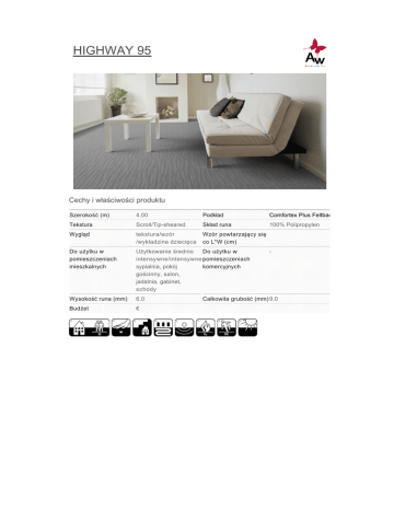 HIGHWAY 95 Cechy i właściwości produktu Szerokość (m) 4.00 Podkład Comfortex Plus Feltbac Tekstura Scroll/Tip-sheared Skład runa 100% Polipropylen Wygląd tekstura/wzór /wykładzina dziecięca Wzór powtarzający się co L*W (cm) Do użytku w pomieszczeniach mieszkalnych Użytkowanie średnio Do użytku w intensywne/intensywne:pomieszczeniach sypialnia, pokój komercyjnych gościnny, salon, jadalnia, gabinet, schody Wysokość runa (mm) 6.0 Budżet € - Całkowita grubość (mm) 9.0 Dostępna gama kolorystyczna HIGHWAY 95 HIGHWAY 49 HIGHWAY 44 HIGHWAY 40 HIGHWAY 30 AWE -IZ “Klein Frankrijk”, Weverijstraat 1 - 9600 Ronse Belgium - Tel + 32 55 23 02 11 - www.carpetyourlife.com The Associated Weavers Company reserves the right to modify the characteristics of products while keeping the same technical properties. We strongly recommend the use of darker colours for heavy traffic areas. - This document may contain typographical errors. The product images used are a general guide and, in reality, the colours may deviate slightly due to limitations of the printing process used.