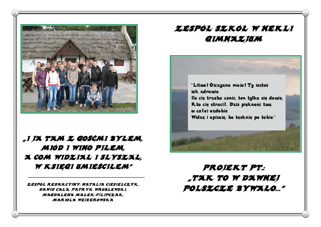 ZESPÓŁ SZKÓŁ W NEKLI GIMNAZJUM „I JA TAM Z GOŚĆMI BYŁEM, MIÓD I WINO PIŁEM, A COM WIDZIAŁ I SŁYSZAŁ, UMIEŚCIŁEM”” W KSIĘGI UMIEŚCIŁEM ZESPÓŁ REDAKCYJNY: NATALIA CIESIELCZYK, DAWID CAŁA, PATRYK WRÓBLEWSKI, MAGDALENA MAŁEK-FILIPCZAK, MARIOLA WEJHEROWSKA PROJE PT.:: PROJ EKT PT. „TAK TO W DAWNEJ POLSZCZE BYWAŁO…” WYJAZD DO SOPLICOWA Na miejsce dojechaliśmy około godziny 8:30 i od razu mieliśmy pierwsze zajęcia. Rozpoczęliśmy od poloneza, który nie jest prostym tańcem, o czym przekonaliśmy się juŜ po wejściu na parkiet. Próbowaliśmy wykonać mało skomplikowane układy, lecz i one były dla nas duŜym wyzwaniem, wcale nie było lekko. Po godzinie wyczerpujących zajęć podziękowaliśmy naszej instruktorce brawami. Nastąpiła krótka przerwa i wówczas mogliśmy zwiedzić teren, na którym znajdują się zabudowania wykorzystane w filmie Andrzeja Wajdy „Pan Tadeusz”. Po przerwie podzieleni zostaliśmy na dwie grupy: dziewczyny poszły na zajęcia ze śpiewu, a chłopcy na naukę gry na instrumentach - i znowu wymagało to od nas duŜego wysiłku. Musieliśmy wykonać poloneza, lecz nie było to takie łatwe, jak nam się na początku wydawało. Bardzo często zaczynaliśmy grać w złych momentach. KaŜdy miał szansę spróbować swych sił. Gdy juŜ nauczyliśmy się rytmu, nastąpiła zamiana, chłopcy poszli śpiewać, a dziewczyny grać. Pani, ucząca śpiewu, trochę się przeraziła, jak zobaczyła grupę około 50 chłopaków (razem z nami byli uczniowie z Zasutowa, Targowej Górki i śydowa). Jak się po chwili okazało, nie było problemów z zapamiętaniem tekstu i spotkanie zakończyliśmy wspólnym śpiewem. RECYTACJA KSI&ŻKI RECYTA CJA FRAGMENTÓW KSI&Ż KI PT.: „PAN TADEUSZ” Uczniowie klasy IIB na lekcji języka polskiego recytowali wybrane fragmenty epopei. Długość takiego tekstu nie przekraczała 25 wersów. Na opanowanie pamięciowe mieliśmy tydzień. Prezentacje odbywały się podczas lekcji języka polskiego. Po cięŜkiej godzinie odpytywań kaŜdy uczeń dostał ocenę, na jaką zasłuŜył. Wszyscy byli zadowoleni, Ŝe poznali choć namiastkę wielkiego dzieła Adama Mickiewicza. Na pewno zapamiętamy te fragmenty jeszcze jakiś czas. TAŃCZYMY I ŚPIEWAMY IP--Y CZYTAJ& „PANA TADEUSZA” VIP VIP-y wybrały swoje ulubione fragmenty, a przed prezentacją podzielili się wspomnieniami związanymi z "Panem Tadeuszem". "Muszę przyznać, Ŝe tego fragmentu musiałem nauczyć się w szkole na pamięć"- przyznał z sentymentem dyrektor szkoły w Nekli. Właścicielka kościółka w Nekielce wybrała wątek, który przedstawiał przyjście urodziwej Telimeny na ucztę w zamku. Te wersy przypadły do gustu kobiecej części widowni. KaŜdy przeczytany fragment został nagrodzony gromkimi oklaskami i symbolicznym kwiatem. Uczniowie w ciszy i w skupieniu, która rzadko u nich gości, słuchali fragmentów epopei, co pomogło im w przeniesieniu się w magiczny świat ksiąŜki. KONKURS RECYTATORSKI Wszyscy uczestnicy prezentowali róŜne fragmenty „Pana Tadeusza”. Poziom był wysoki. Jury wytypowało do prezentacji w Zasutowie Izabelę Suchorską, uczennicę klasy IIb. KREW, POT I ŁZY - czyli lekcja plastyki z panią dyrektor Aldoną Kubacką. Klasa IIB, przygotowująca się do kolejnego etapu prezentacji, wykonywała ilustracje do wybranych fragmentów epopei Adama Mickiewicza. Pod twórczym okiem nauczycielki plastyki poświęciliśmy kilka godzin lekcyjnych na ich rysowanie. Pani Kubacka cały czas podstawiała uczniom nowe pomysły, a ci wykorzystywali je w swych pracach. Po ocenieniu zostały zebrane w formę albumu. Trzy najciekawsze zostaną zaprezentowane podczas podsumowania projektu w Zasutowie. Reasumując: po trzech godzinach lekcyjnych malowania, cięŜkiej artystycznej pracy, pani Aldona straciła głos a klasie IIB ubyło łącznie 5 litrów krwi i 11 kilogramów. MULTIMEDIALNE PREZENTACJE MULTIMED IALNE Na jednej z lekcji historii z panią Urszulą Adamczyk przedstawiliśmy nasze prezentacje multimedialne dotyczące, m.in.: wielkich Polaków drugiej połowy osiemnastego wieku, dworów i dworków szlacheckich, Ŝycia Adama Mickiewicza. Siedem grup przedstawiło trudy swojej pracy, po czym kaŜda z nich została oceniona. Najciekawsze prace zaprezentujemy w Zasutowie. PODSUMOWANIE MIAŁO UROCZYSTE PODSU MOWANIE PROJEKTU MIA ŁO ZASUTOWIE MIEJSCE 18 LUTEGO W ZESPOLE SZKÓŁ W ZASU TOWIE