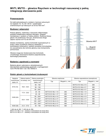 MVTI, MVTO - głowice Raychem w technologii nasuwanej z pełną integracją sterowania pola Przeznaczenie Do kabli jednożyłowych o izolacji z tworzyw sztucznych na napięcie 10, 15, 20 i 30 kV, i przekrojach znamionowych żył roboczych od 35 do 400 mm2. Budowa i własności Korpus głowicy, wykonany z kauczuku silikonowego, posiada zintegrowany element sterujący. Długość montażową L1 podano w Tablicy doboru. Średnica kloszy głowic nie przekracza 102 mm. Znamionowa droga upływu wynosi od 412 do 676 mm. Głowice MVT Zestaw montażowy, oprócz końcówek wyposażonych w śruby z łbem zrywalnym (dotyczy zestawów z końcówkami śrubowymi), zawiera szczeliwo zimnotopliwe do uszczelniania obu końców głowicy oraz komponenty pomocnicze. L1 - długość montażowa Głowice mogą być dostarczane bez końcówek, umożliwiając stosowanie lokalnie zaaprobowanej technologii prasowania. Badania i zgodność z normami Badania głowic wykonane w akredytowanych laboratoriach potwierdzają zgodność z wymaganiami norm PN-HD 629.1.S2 i IEC 60502-4. Dobór głowic z końcówkami śrubowymi Napięcie Zakres średnic Zakres przekrojów znamionowe na izolacji, mm znamionowych kabla, kV 6/10 (12) Długość L1, mm 95 – 150 MVTO-3131-ML-2-13 265 95 – 150 MVTO-3131-ML-2-17 265 Typ 2 Długość L1, mm 95 – 240* 17,9 – 25,0 12/20 (24) 23,5 – 34,6 18/30 (36) 21,0 – 37,0 Głowice napowietrzne (zewnętrzne) Typ kabla, mm 18,6 – 30,4 Głowice wnętrzowe MVTO-3131-ML-4-17 265 25 – 95 MVTI-5121-ML-1-13 265 MVTO-5121-ML-1-13 345 25 – 95 MVTI-5121-ML-1-17 265 MVTO-5121-ML-1-17 345 95 – 240* MVTI-5131-ML-4-13 285 MVTO-5131-ML-4-13 365 95 – 240* MVTI-5131-ML-4-17 285 MVTO-5131-ML-4-17 365 120 – 240** MVTI-5131-ML-5-13 285 MVTO-5131-ML-5-13 365 120 – 240** MVTI-5131-ML-5-17 285 MVTO-5131-ML-5-17 365 35 – 150 MVTI-6121-ML-2-13 365 *) 300 dla AL RE; **) 300 dla AL RM. MVTx-x1x1-ML-x-13 – zestawy z końcówkami do śruby M12. MVTx-x1x1-ML-x-17 – zestawy z końcówkami do śruby M16. Dobór głowic bez końcówek Napięcie znamionowe kabla, kV 6/10 (12) 12/20 (24) 18/30 (36) Zakres średnic na izolacji, mm Zakres przekrojów znamionowych 2 kabla, mm Głowice wnętrzowe Typ Długość L1, mm Głowice napowietrzne (zewnętrzne) Typ * Długość L1 , mm 13,7-20,8 25-95 MVTI-3121 240 MVTO-3121 285 18,6-30,4 95-240 MVTI-3131 260 MVTO-3131 305 17,9-25 25-95 MVTI-5121 285 MVTO-5121 365 23,5-34,6 95-300 MVTI-5131 305 MVTO-5131 385 24,0-33,5 35-150 MVTI-6121 385 - - 27,8-42,8 95-400 MVTI-6141 475 MVTO-6141 680 *) Podana długość głowicy jest długością orientacyjną. Rzeczywista długość uzależniona jest od typu zastosowanej końcówki prasowanej. Chociaż firma TE Connectivity (TE) dołożyła wszelkich uzasadnionych starań, aby zapewnić dokładność informacji zawartych w niniejszym katalogu, TE nie gwarantuje, że jest on wolny od błędów, ani nie składa żadnych innych oświadczeń, gwarancji ani poręczeń, że informacje te są dokładne, poprawne, wiarygodne i aktualne. TE zastrzega sobie prawo do dokonywania zmian informacji zawartych w niniejszym katalogu w dowolnym momencie bez wcześniejszego powiadomienia. TE wyraźnie zrzeka się odpowiedzialności z tytułu wszelkich dorozumianych gwarancji w odniesieniu do informacji zawartych w niniejszym dokumencie, w tym między innymi wszelkich dorozumianych gwarancji przydatności handlowej lub przydatności do danego celu. Wymiary podane w niniejszym katalogu służą wyłącznie jako odniesienie i mogą ulec zmianie bez wcześniejszego powiadomienia. Specyfikacje mogą ulec zmianie bez wcześniejszego powiadomienia. Aby uzyskać informacje o najnowszych wymiarach i specyfikacjach projektów, należy skontaktować się z TE. Raychem, TE Connectivity oraz logo TE connectivity stanowią znaki handlowe. Inne logo, nazwy produktów i spółek wymienione w niniejszym dokumencie mogą być znakami handlowymi ich odpowiednich właścicieli. Tyco Electronics Polska Sp. z o.o. – Dział Energetyki ul. Cybernetyki 19 · 02-677 Warszawa · Tel. +48 22 457 6750 · Fax +48 22 457 6760 [email protected] http://energy.te.com