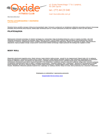 http://www.oxide.com.pl Formy prozdrowotne i mentalne 2015-06-28 10:18:43 Mentalne formy aerobiku znacząco różnią się od pozostałych zajęć. Ćwiczenia w połączeniu ze świadomym oddechem pozwalają zachować równowagę pomiędzy sferą duchową sferą fizyczną. Zaletą zajęć mentalnych jest to, iż może wykonywać je każdy bez względu na wiek czy stan zdrowia. PILATES&JOGA Wykonywane ćwiczenia sprawiają, że mięśnie rozciągają się, wzmacniają i stają się bardziej elastyczne, przez co czujemy się lekko, całe ciało odzyskuje sprężystość, poprawia się sylwetka, figura staję się smukła, a brzuch płaski. Podczas zajęć pracujemy nad powiększeniem zakresu ruchliwości w stawach, wydłużeniem mięśni i ścięgien, prawidłowym przebiegiem faz oddychania. Zajęcia te uwalniają od napięć, dają psychiczne odprężenie, lepszy przepływ energii, oczyszczenie i wzmocnienie układu nerwowego. Zajęcia polecane dla każdego bez względu na wiek. BODY ROLL Wspaniałe zakończenie tygodnia pracy. Kiedy ćwiczysz, twoje mięśnie ciężko pracują – pozwól im się zregenerować! Zajęcia body roll, to najlepsza forma rozciągnięcia i rozluźnienia przykurczonych mięśni. niepozorny wałek łagodzi wszelakie napięcia i bóle mięśniowe zapobiegając ich powrotom. Zwiększa wydajność mięśni, przyspiesza ich regenerację, a ponadto poprawia krążenie krwi i pobudza tkanki łączne. Wszechstronna forma automasażu, prowadzona przy użyciu masażera pozwoli Ci się zrelaksować, rozładować napięcie, poprawić mobilność całego ciała. Ćwiczenia polegają na położeniu wybranej partii ciała na wałku, a następnie przesuwanie – rolowanie mięśnia „tam i z powrotem". Wystarczy 8-10 powtórzeń na każdą partię mięśniową, aby poczuć widoczne efekty w postaci lepiej rozluźnionych i bardziej gibkich mięśni. Efekty rollowania są zbliżone do efektów masażu. Dodatkowo rollowanie pobudza krążenie krwi, wpływając na redukcję cellulitu. Dołącz do osób, które przekonały się o słuszności rollowania! Dziękujemy za odwiedziny i zapraszamy ponownie bezpośredni link do strony www strona 1/1 Powered by TCPDF (www.tcpdf.org)