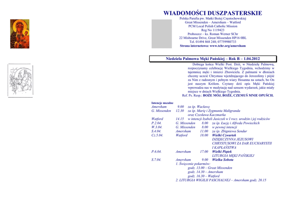 WIADOMOŚCI DUSZPASTERSKIE Polska Parafia pw. Matki Bożej Częstochowskiej Great Missenden – Amersham – Watford PCM Local Polish Catholic Mission Reg No 1119423 Proboszcz – ks. Roman Werner SChr 22 Misbourne Drive, Great Missenden HP16 0BL Tel. 01494 868 248; 07759980733 Strona internetowa: www.tchr.org/amersham Niedziela Palmowa Męki Pańskiej – Rok B – 1.04.2012 Dobiega końca Wielki Post. Dziś, w Niedzielę Palmową, rozpoczynamy celebrację Wielkiego Tygodnia, wchodzimy w tajemnicę męki i śmierci Zbawiciela. Z palmami w dłoniach chcemy uczcić Chrystusa wjeżdżającego do Jerozolimy i pójść za Nim z radosnym i pełnym wiary Hosanna na ustach, bo On jest naszym Królem. Czytany dziś opis Męki Pańskiej wprowadza nas w medytację nad sensem wydarzeń, jakie miały miejsce w dniach Wielkiego Tygodnia. Ref. Ps. Resp.: BOŻE MÓJ, BOŻE, CZEMUŚ MNIE OPUŚCIŁ Intencje mszalne Amersham G. Missenden Watford P.2.04. W.3.04. S.4.04. Cz.5.04. P.6.04. S.7.04. za śp. Wacławę za śp. Marię i Zygmunta Maligranda oraz Czesława Kaczmarka 14.15 w intencji Izabeli Jasiczek w I rocz. urodzin i jej rodziców G. Missenden 8.00 za śp. Łucję i Alfreda Powieckich G. Missenden 8.00 w pewnej intencji Amersham 11.00 za śp. Zbigniewa Sendur Watford 18.00 Wielki Czwartek DZIĘKCZYNNA JEZUSOWI CHRYSTUSOWI ZA DAR EUCHARYSTII I KAPŁAŃSTWA Amersham 17.00 Wielki Piątek LITURGIA MĘKI PAŃSKIEJ Amersham 9.00 Wielka Sobota 1. Święcenie pokarmów: godz. 13.00 – Great Missenden godz. 14.30 – Amersham godz. 16.30 – Watford 2. LITURGIA WIGILII PASCHALNEJ – Amersham godz. 20.15 9.00 12.30 Uroczystość Zmartwychwstania Pańskiego – Rok B – 8.04.2012 Jesteśmy świadkami największego cudu, jakiego dokonał Chrystus – po swojej śmierci na krzyżu na trzeci dzień powstał z martwych. I właśnie dzisiaj jest największe święto chrześcijaństwa – uroczystość Zmartwychwstania Pańskiego. Uczestniczymy w radosnej liturgii, która uobecnia tamte wydarzenia zbawcze. Tajemnica ta otwiera się w naszych sercach i umysłach, dlatego każdy z nas jest świadkiem zmartwychwstania. Ref. Ps. Resp.: W TYM DNIU WSPANIAŁYM WSZYSCY SIĘ WESELMY Intencje mszalne Watford 6.30 Msza św. Rezurekcyjna Amersham 9.00 w intencji Parfii i Parafian G. Missenden 12.30 za śp. Edwarda Tramp (kol. rocz.) Watford 14.15 za śp. Marię Kubacką (7 rocz.) P.9.04. – II Święto Wielkanocne Amersham 11.00 za zmarłych rodziców, braci – od rodziny G. Missenden 12.30 za dusze w czyśćcu cierpiące Watford 14.15 w intencji żyjących i zmarłych przyjaciół i dobrodziejów Towarzystwa Chrystusowego dla Polonii Zagranicznej W.10.04.- S.14.04. – NIE MA MSZY ŚW. II Niedziela Wielkanocna – Miłosierdzia Bożego Rok B – 15.04.2012 Obchodzimy dzisiaj niedzielę Miłosierdzia Bożego. Kierujemy nasze serca ku tajemnicy, jaką Bóg objawił świętej siostrze Faustynie. Pomaga nam w tym łaska i przeżywanie tajemnicy zmartwychwstania Chrystusa. Zawierzajmy Bożemu miłosierdziu wszystkie nasze sprawy indywidualne, rodzinne, wspólnotowe, zawodowe. Rok temu, w uroczystość Bożego Miłosierdzia radowaliśmy się beatyfikacją Jana Pawła II. Ref. Ps. Resp.: DZIĘKUJCIE PANU, BO JEST MIŁOSIERNY Intencje mszalne Amersham G. Missenden Watford P.16.04. W.17.04. S.18.04. Cz.19.04. P.20.04. S.21.04. 9.00 12.30 14.15 dziękczynna za dar Miłosierdzia Bożego za śp. Jana Samek (12 rocz.) za śp. Halinę i Marcina Czerniawskich (kol. rocz.) oraz Jadwigę i Ignacego G. Missenden 8.00 za śp. Annę Wiwczar G. Missenden 8.00 za śp. Wacławę Amersham 11.00 w pewnej intencji Watford 19.00 za śp. Marię Amersham 19.00 za śp. Marię i Michała Amersham 9.00 w pewnej intencji III Niedziela Wielkanocna – Rok B – 22.04.2012 Każda niedziela to dzień świętowania zmartwychwstania Chrystusa. Przychodzimy do świątyni, by we wspólnocie, którą tworzymy jako Kościół i jako parafia, radować się obecnością i miłością Jezusa zmartwychwstałego. To On gromadzi nas wokół siebie. To Jego słowa będziemy słuchać; to Jego Ciało i Krew chcemy przyjąć. Pozwólmy, by Pan Jezus wypełnił nasze serca swoją miłością. Ref. Ps. Resp.: WZNIEŚ PONAD NAMI ŚWIATŁOŚĆ TWOJĄ, PANIE Intencje mszalne Amersham G. Missenden Watford P.23.04. W. 24.04. S. 25.04. Cz.26.04. P.27.04. S.28.04. 9.00 za śp. Wacławę 12.30 za zmarłych z rodziny Bartkiewicz i Szeliga 14.15 za śp. Stanisława Hadriana (dz. urodz.) G. Missenden 8.00 za śp. Wacławę NIE MA MSZY ŚW. Amersham 11.00 w pewnej intencji Watford 19.00 za zmarłych Amersham 19.00 za śp. Marię Amersham 9.00 IV Niedziela Wielkanocna – Rok B – 29.04.2012 Dzisiejsza niedziela nazywana jest Niedzielą Dobrego Pasterza. Sam Jezus przedstawia się jako Dobry Pasterz; jako ten, który zna swoje owce, woła je po imieniu i prowadzi bezpiecznie po drogach życia. Przychodząc na Eucharystię, uświadamiamy sobie, że to my, jako wspólnota Kościoła, jesteśmy tymi owcami, że to nas zna i wzywa zmartwychwstały Pan, abyśmy szli za Nim. Niech więc to eucharystyczne spotkanie pobudzi naszą wiarę i ufność w Bogu, abyśmy się nie bali iść drogą, którą proponuje nam Jezus. Ref. Ps. Resp.: KAMIEŃ WZGARDZONY STAŁ SIĘ FUNDAMENTEM Intencje mszalne Amersham G. Missenden Watford P.30.04. W.1.05. S.2.05. Cz.3.05. P.4.05. S.5.05. za śp. Helenę Kamińską (kol. rocz.) za śp. Marię i Zygmunta Maligranda oraz Czesława Kaczmarka 14.15 w intencji Katarzyny – Elżbiety i jej rodziców G. Missenden 8.00 w pewnej intencji G. Missenden 8.00 za śp. Wacławę Amersham 11.00 za śp. Marię Watford 19.00 w intencji Ojczyzny Amersham 19.00 za zmarłych Amersham 9.00 9.00 12.30 KRONIKA PARAFIALNA CHRZEST: W naszej Wspólnocie Parafialnej został ochrzczony Edwdard James Manners, s. Kevin i Anny. Niech wzrasta w łasce u Boga i ludzi! ZAPOWIEDZI: Do sakramentu małżeństwa przygotowują się: 1/ Andrzej Zieliński i Karolina Chrzanowska; 2/ Karol Sikorski