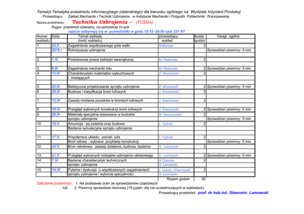 Tematyka Tematyka przedmiotu przedmiotu informacyjnego informacyjnego (obieralnego) (obieralnego) dla kierunku dla kierunku ogólnegoogólnego na Wydziale na Wydziale InżynieriiInżynierii ProdukcjiProdukcji Prowadzący: Nazwa przedmiotu: Zakład Mechaniki i Technik Uzbrojenia w Instytucie Mechaniki i Poligrafii Politechniki Warszawskiej Technika Uzbrojenia -- (TUZBA) Rygor: przedmiot obieralny na semestrze IV-tym zajęcia odbywają się w: poniedziałki w godz.18.15 -20.00 sala 321 NT Numer Data Temat wykładu prowadzący wykładu (treść wykładu) wykład 1. 22.II Zagadnienia współczesnego pola walki M.Bossak 2010 r Robotyzacja uzbrojenia liczba godzin 2 Uwagi ogólne Sprawdzian pisemny- 5 min 2. 1.III Podstawowe prawa balistyki wewnętrznej M. Radomski 2 3. 4. 8.III 15.III Zagadnienia mechaniki lotu Charakterystyki materiałów wybuchowych i miotających M. Radomski 2 Sprawdzian pisemny- 5 min 2 5. 6. 22.III 29.III Balistyczne projektowanie sprzętu uzbrojenia Budowa i klasyfikacja broni lufowych Z. Wrzesiński J. Ewertowski 2 Sprawdzian pisemny- 5 min 2 7. 12.IV Zasady miotania pocisków w broniach lufowych J. Ewertowski 2 8. 9. 19.IV 26.IV J. Ewertowski 10. 10.V Przegląd wybranych konstrukcji broni lufowych Materiały specjalne stosowane w budowie sprzętu uzbrojenia Amunicja - jej zadania oraz budowa Badania symulacyjne sprzętu uzbrojenia L. Cybula 2 Sprawdzian pisemny- 5 min 2 Sprawdzian pisemny- 5 min 2 11. 17.V L. Cybula 2 12. 24.V Współpraca układu: pocisk- lufa Broń lufowa - wybrane przykłady konstrukcji Bron rakietowa: zasady działania, budowa, badania S. Lamowski 2 13. 14. 31.V 7.VI S. Lamowski 2 Sprawdzian pisemny- 5 min 2 15. 14.VI Przegląd wybranych rodzajów uzbrojenia rakietowego Badanie charakterystyk technicznych sprzętu uzbrojenia Pytania i dyskusja o współczesnych zagadnieniach sprzętu uzbrojenia i wyborze specjalności Z. Wrzesiński M Kaczorowski Sprawdzian pisemny- 5 min A.Czarnak S. Lamowski L. Cybula, J Ewertowski, 2 S. Lamowski Razem godzin 30 Zaliczenie przedmiotu: 1. Na podstawie ocen ze sprawdzianów cząstowych lub lub 2.2.Pisemny Pisemnysprawdzian sprawdziankońcowy końcowy(15 (15pytańpytań-dla dlanie nieuczestniczących uczestniczącychwwwykładach) wykładach) Prowadzący przedmiot: prof. dr hab.inż. Sławomir. Lamowski