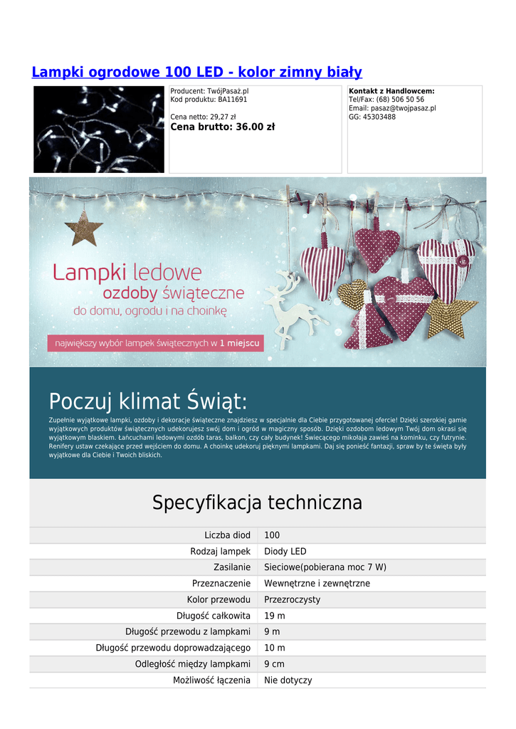 Lampki ogrodowe 100 LED - kolor zimny biały Producent: TwójPasaż.pl Kod produktu: BA11691 Kontakt z Handlowcem: Tel/Fax: (68) 506 50 56 Email: [email protected] GG: 45303488 Cena netto: 29,27 zł Cena brutto: 36.00 zł Poczuj klimat Świąt: Zupełnie wyjątkowe lampki, ozdoby i dekoracje świąteczne znajdziesz w specjalnie dla Ciebie przygotowanej ofercie! Dzięki szerokiej gamie wyjątkowych produktów świątecznych udekorujesz swój dom i ogród w magiczny sposób. Dzięki ozdobom ledowym Twój dom okrasi się wyjątkowym blaskiem. Łańcuchami ledowymi ozdób taras, balkon, czy cały budynek! Świecącego mikołaja zawieś na kominku, czy futrynie. Renifery ustaw czekające przed wejściem do domu. A choinkę udekoruj pięknymi lampkami. Daj się ponieść fantazji, spraw by te święta były wyjątkowe dla Ciebie i Twoich bliskich. Specyfikacja techniczna Liczba diod Rodzaj lampek Zasilanie Przeznaczenie Kolor przewodu Długość całkowita Długość przewodu z lampkami 100 Diody LED Sieciowe(pobierana moc 7 W) Wewnętrzne i zewnętrzne Przezroczysty 19 m 9m Długość przewodu doprowadzającego 10 m Odległość między lampkami 9 cm Możliwość łączenia Nie dotyczy Kolor lampek Biały zimny Programator Nie dotyczy Wymienne żarówki Zasilacz Nie Nie dotyczy(24V; 4,5 - 6,8 W) Pozostałe informacje Łączenie równoległe - Uszkodzenie jednej diody nie wygasza zestawu Spełniają normy GS/CE Klasa ochrony IP44 Parametry 1 lampka moc 0,045 - 0,068 W, zasilanie: 230 V 50 Hz Średnica żarówki 4 mm Lampki świąteczne białe - LED wysoka jakość wykonania wodoodporność : IP44 energooszczędne spełniają normy GS/CE długi kabel zasilający wymienny zasilacz Główne cechy prezentowanych lampek Energooszczędne Wysoka jakość Do lampek użyto żarówek LEDowych, które Lampki wykonano z najlepszej jakości materiałów i pobierają znacznie mniej prądu niż tradycyjne użyto odpowiednich żarówek LED tak aby lampki lampki. W przeliczeniu 1Watt to ok. 15 diod mogły służyć przez wiele lat. ledowych. Bezpieczne - Certyfikaty GS i CE Certyfikaty potwierdzają brak substancji szkodliwych. Znak CE potwierdza, że dany produkt spełnia unijne normy bezpieczeństwa i higieny. Możliwości stosowania Lampki z powodzeniem można stosować wewnątrz i na zewnątrz domu. Uniwersalny kształt żarówek pozwala na używanie ich jako ozdoba przez cały rok. Galeria Kod produktu:BA11691 ID produktu:1740 Granos Group sp. z o.o. ul. Sulechowska 4a budynek 45 65-001 Zielona Góra
