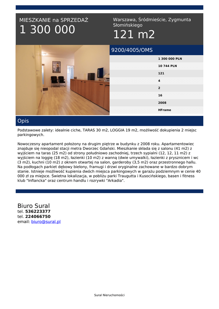 MIESZKANIE na SPRZEDAŻ 1 300 000 Warszawa, Śródmieście, Zygmunta Słomińskiego 121 m2 9200/4005/OMS 1 300 000 PLN 10 744 PLN 121 4 2 16 2008 HFrame Opis Podstawowe zalety: idealnie ciche, TARAS 30 m2, LOGGIA 19 m2, możliwość dokupienia 2 miejsc parkingowych. Nowoczesny apartament położony na drugim piętrze w budynku z 2008 roku. Apartamentowiec znajduje się nieopodal stacji metra Dworzec Gdański. Mieszkanie składa się z salonu (41 m2) z wyjściem na taras (25 m2) od strony południowo zachodniej, trzech sypialni (12, 12, 11 m2) z wyjściem na loggię (18 m2), łazienki (10 m2) z wanną (dwie umywalki), łazienki z prysznicem i wc (3 m2), kuchni (10 m2) z oknem otwartej na salon, garderoby (3,5 m2) oraz przestronnego hallu. Na podłogach parkiet dębowy bielony, framugi i drzwi oryginalne zachowane w bardzo dobrym stanie. Istnieje możliwość kupienia dwóch miejsca parkingowych w garażu podziemnym w cenie 40 000 zł za miejsce. Świetna lokalizacja, w pobliżu parki Traugutta i Kusocińskiego, basen i fitness klub "Inflancka" oraz centrum handlu i rozrywki "Arkadia". Biuro Sural tel. 536223377 tel. 224066750 email: [email protected] Sural Nieruchomości Powered by TCPDF (www.tcpdf.org)
