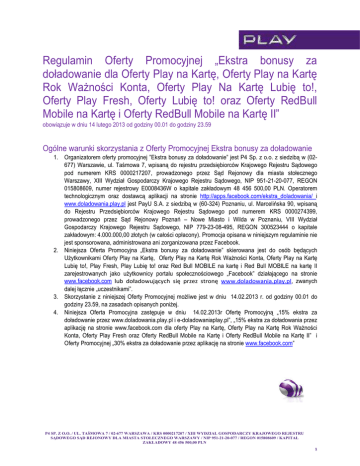 Regulamin Oferty Promocyjnej „Ekstra bonusy za doładowanie dla Oferty Play na Kartę, Oferty Play na Kartę Rok Ważności Konta, Oferty Play Na Kartę Lubię to!, Oferty Play Fresh, Oferty Lubię to! oraz Oferty RedBull Mobile na Kartę i Oferty RedBull Mobile na Kartę II” obowiązuje w dniu 14 lutego 2013 od godziny 00.01 do godziny 23.59 Ogólne warunki skorzystania z Oferty Promocyjnej Ekstra bonusy za doładowanie 1. Organizatorem oferty promocyjnej ”Ekstra bonusy za doładowanie” jest P4 Sp. z o.o. z siedzibą w (02677) Warszawie, ul. Taśmowa 7, wpisaną do rejestru przedsiębiorców Krajowego Rejestru Sądowego pod numerem KRS 0000217207, prowadzonego przez Sąd Rejonowy dla miasta stołecznego Warszawy, XIII Wydział Gospodarczy Krajowego Rejestru Sądowego, NIP 951-21-20-077, REGON 015808609, numer rejestrowy E0008436W o kapitale zakładowym 48 456 500,00 PLN. Operatorem technologicznym oraz dostawcą aplikacji na stronie http://apps.facebook.com/ekstra_doladowania/ i www.doladowania.play.pl jest PayU S.A. z siedzibą w (60-324) Poznaniu, ul. Marcelińska 90, wpisaną do Rejestru Przedsiębiorców Krajowego Rejestru Sądowego pod numerem KRS 0000274399, prowadzonego przez Sąd Rejonowy Poznań – Nowe Miasto i Wilda w Poznaniu, VIII Wydział Gospodarczy Krajowego Rejestru Sądowego, NIP 779-23-08-495, REGON 300523444 o kapitale zakładowym: 4.000.000,00 złotych (w całości opłacony). Promocja opisana w niniejszym regulaminie nie jest sponsorowana, administrowana ani zorganizowana przez Facebook. 2. Niniejsza Oferta Promocyjna „Ekstra bonusy za doładowanie” skierowana jest do osób będących Użytkownikami Oferty Play na Kartę, Oferty Play na Kartę Rok Ważności Konta, Oferty Play na Kartę Lubię to!, Play Fresh, Play Lubię to! oraz Red Bull MOBILE na kartę i Red Bull MOBILE na kartę II zarejestrowanych jako użytkownicy portalu społecznościowego „Facebook” działającego na stronie www.facebook.com lub doładowujących się przez stronę www.doladowania.play.pl, zwanych dalej łącznie „uczestnikami”. 3. Skorzystanie z niniejszej Oferty Promocyjnej możliwe jest w dniu 14.02.2013 r. od godziny 00.01 do godziny 23.59, na zasadach opisanych poniżej. 4. Niniejsza Oferta Promocyjna zastępuje w dniu 14.02.2013r Ofertę Promocyjną „15% ekstra za doładowanie przez www.doladowania.play.pl i e-doladowaniaplay.pl”, „15% ekstra za doładowania przez aplikację na stronie www.facebook.com dla oferty Play na Kartę, Oferty Play na Kartę Rok Ważności Konta, Oferty Play Fresh oraz Oferty RedBull Mobile na Kartę i Oferty RedBull Mobile na Kartę II” i Oferty Promocyjnej „30% ekstra za doładowanie przez aplikację na stronie www.facebook.com” P4 SP. Z O.O. / UL. TAŚMOWA 7 / 02-677 WARSZAWA / KRS 0000217207 / XIII WYDZIAŁ GOSPODARCZY KRAJOWEGO REJESTRU SĄDOWEGO SĄD REJONOWY DLA MIASTA STOŁECZNEGO WARSZAWY / NIP 951-21-20-077 / REGON 015808609 / KAPITAŁ ZAKŁADOWY 48 456 500,00 PLN 1 Szczegółowe warunki skorzystania z promocji 5. Niniejsza Oferta Promocyjna dotyczy wyłącznie Doładowań dokonanych w dedykowanej aplikacji na stronie internetowej http://apps.facebook.com/ekstra_doladowania/ i przez stronę www.doladowania.play.pl 6. Warunkiem skorzystania z niniejszej Oferty Promocyjnej poprzez Doładowania dokonane w dedykowanej aplikacji na stronie internetowej http://apps.facebook.com/ekstra_doladowania/ jest zostanie fanem profilu Play umieszczonym na stronie www.facebook.com/Play. 7. W okresie obowiązywania niniejszej Oferty Promocyjnej uczestnicy, po każdym jednorazowym Doładowaniu konta za pomocą dedykowanej aplikacji umieszczonej na http://www.facebook.com/Play lub na stronie www.doladowania.play.pl, otrzymają bonusy wg poniższej tabeli (zwany dalej „Bonusem”). Wartość jednorazowego doładowania 5-10 zł 11-50 zł 51 zł i więcej Bonus 15% wartości doładowania 50% wartości doładowania 75% wartości doładowania 8. Bonusy można wykorzystać na krajowe połączenia głosowe, wideo, SMS i MMS do wszystkich sieci komórkowych w Polsce i na krajowe połączenia głosowe do krajowych sieci stacjonarnych, realizowane z Sieci Telekomunikacyjnej P4, z wyłączeniem numerów specjalnych, infolinii i audioteksowych zawartych w Cenniku Oferty Play na Kartę, Cenniku Oferty Play na Kartę Rok Ważności Konta, Cenniku Oferty Play Fresh oraz Cenniku Oferty Red Bull MOBILE na kartę i Cenniku Oferty Red Bull MOBILE na kartę II. 9. Poszczególne Bonusy przyznawane są w ciągu 24 godzin od Doładowania. 10. Poszczególne Bonusy ważne są 30 dni kalendarzowych od dnia ich przyznania. 11. Opłata za przyznanie Bonusu zwarta jest w kwocie Doładowania konta Użytkownika. 12. Stan Bonusu można każdorazowo sprawdzić na www.24.play.pl. lub pod kodem: *101# 13. Bonus przyznawany jest przez P4 sp z o.o. i wszelkie reklamacje dotyczące nieprawidłowości w przyznaniu Bonusa powinny być kierowane do P4, zgodnie z Regulaminem świadczenia Usług Telekomunikacyjnych przez P4 sp z.o.o. dla Użytkowników. Postanowienia końcowe 14. Zasady dokonywania Doładowania konta na stronie http://apps.facebook.com/ekstra_doladowania/ oraz www.doladowania.play.pl są identyczne jak w regulaminie Doładowań opublikowanym na stronie www.doladowania.play.pl. Fakturę za Doładowanie można otrzymać na zasadach opisanych w regulaminie Doładowań na stronie www.doladowania.play.pl 15. Skorzystanie z niniejszej Oferty Promocyjnej nie wyklucza skorzystania z innych Ofert Promocyjnych za wyjątkiem Oferty Promocyjnej opisanej w pkt 4 niniejszego Regulaminu, chyba, że warunki innych Ofert Promocyjnych zawierają odmienne postanowienia. Przyznany Bonus nie wpływa na Okres ważności połączeń wychodzących lub przychodzących. P4 SP. Z O.O. / UL. TAŚMOWA 7 / 02-677 WARSZAWA / KRS 0000217207 / XIII WYDZIAŁ GOSPODARCZY KRAJOWEGO REJESTRU SĄDOWEGO SĄD REJONOWY DLA MIASTA STOŁECZNEGO WARSZAWY / NIP 951-21-20-077 / REGON 015808609 / KAPITAŁ