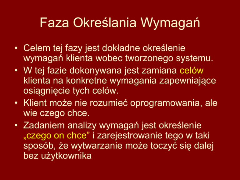 Faza Określania Wymagań • Celem tej fazy jest dokładne określenie wymagań klienta wobec tworzonego systemu. • W tej fazie dokonywana jest zamiana celów klienta na konkretne wymagania zapewniające osiągnięcie tych celów. • Klient może nie rozumieć oprogramowania, ale wie czego chce. • Zadaniem analizy wymagań jest określenie „czego on chce” i zarejestrowanie tego w taki sposób, że wytwarzanie może toczyć się dalej bez użytkownika Faza określania wymagań • Klient rzadko dokładnie wie jakie wymagania zapewniają osiągnięcie jego celów. Proces określania wymagań należy więc rozumieć, nie jako proste zbieranie wymagań klienta, lecz jako proces, w którym klient wspólnie z przedstawicielami producenta konstruuje zbiór wymagań wobec systemu zgodny z postawionymi celami. „Jeśli klient dla którego jest przeznaczone oprogramowanie, nie zostanie wysłuchany i zrozumiany, to prawdopodobnie nie będzie zadowolony z wyniku.” Faza określania wymagań • Podstawowym sposobem pracy jest wykonywanie wywiadów z różnymi osobami ze strony klienta (są to z reguły przyszli użytkownicy systemu) • Przekształcenie wymagane od systemu oprogramowania ma postać wejść i wyjść z systemu. Powinno być określone, który zbiór wejść zostanie przetworzony na który zbiór wyjść. • Nie należy wskazywać jak wejścia zostaną przekształcone na wyjścia. dokumentacja projektowa Trudności określania wymagań • Klient z reguły nie wiem dokładnie w jaki sposób osiągnąć określone cele. A można je osiągnąć na wiele sposobów • Duże systemy są wykorzystywane przez wielu użytkowników. Ich cele są często sprzeczne. Różny użytkownicy mogą posługiwać się różną terminologią mówiąc o tych samych problemach • Zleceniodawcy i użytkownicy to często inne osoby. Głos zleceniodawców może być decydujący w tej fazie, choć nie zawsze potrafią oni przewidzieć rzeczywiste potrzeby użytkowników Dobry opis wymagań Powinien: - Być kompletny oraz niesprzeczny - Opisywać zewnętrzne zachowanie systemu a nie sposób jego realizacji - Obejmować ograniczenia przy jakich musi pracować system - Być łatwy w modyfikacji - Brać pod uwagę przyszłe możliwe zmiany wymagań wobec systemu - Opisywać zachowanie systemu w niepożądanych sytuacjach Typowym błędem jest koncentrowanie się na sytuacjach typowych i pomijanie wyjątków Opis wymagań • Wymaganie powinny zostać zebrane w dokumencie – opisie wymagań. • Dokument ten powinien być podstawą formalnego, szczegółowego kontraktu między klientem a producentem • Powinien być zrozumiały dla obu stron • Producenci oprogramowanie często nie są zainteresowani precyzyjnym opisem wymagań, który pozwoliłby na rzeczywista weryfikację wyprodukowanego systemu Dokument opisujący wymagania Powinien zawierać: - Wprowadzenie – cele, zakres i kontekst systemu. Ta część dokumentu zawiera więc wyniki fazy strategicznej - Opis ewolucji systemu – opis przewidywanych zmian wymagań wobec systemu - Opis wymagań funkcjonalnych – opisują funkcje (Czynności, operacje) wykonywane przez system - Opis wymagań niefunkcjonalnych – opisują ograniczenia, przy zachowaniu których system powinien realizować swoje funkcje - Model systemu - Słownik – pis wymagań może zawierać szereg terminów niezrozumiałych dla jednej ze stron. Opis wymagań Ponadto może zawierać: - Specyfikacja wymagań funkcjonalnych Specyfikacja wymagań niefunkcjonalnych Wymagania sprzętowe Wymagania dot. Bazy danych Indeks Tworząc dokument opisujący wymagania należy przestrzegać następujących zasad: - Wymagania funkcjonalne powinny być oddzielone od wymagań niefunkcjonalnych - Należy rozdzielać opisy poszczególnych wymagań - Dla każdego wymagania należy powinien być podany powód jego wprowadzenia Wymagania funkcjonalne • Opisują funkcje wykonywane przez system. Mogą one być wykonywane przy udziale systemów zewnętrznych • Język naturalny jest bardzo często sposobem opisu wymagań. Ale ma wady: - Niejednoznaczność języka naturalnego, która utrudnia precyzyjny zapis wymagań. Może prowadzić do różnej interpretacji tego samego tekstu przez różne osoby - Elastyczność języka naturalnego, która pozwala te same treści wyrazić na różne sposoby. Utrudnia to wykrycie powiązanych wymagań. Może tez prowadzić do przeoczenia sprzeczności wymagań sformułowanych w różny sposób. Powyższych wad pozbawione są notacje formalne, ale są niezrozumiałe dla klienta Wymagania funkcjonalne • Swego rodzaju kompromisem pomiędzy językiem naturalnym a metodami formalnymi jest stosowanie formularzy opisu wymagań. • Formularze takie wykorzystują język naturalny, jednak zapis jest podzielony na konkretne pola co pozwala uniknąć szeregu błędów. • Definiując wymagania funkcjonalne z reguły podaje się jedynie wymagany efekt realizacji funkcji a nie jej algorytm. • Liczba wymagań funkcjonalnych może być bardzo duża – nawet do 8000. Formularz opisu wymagania przykład Nazwa funkcji Edycja dochodów podatnika Opis Funkcja pozwala edytować łączne dochody podatnika uzyskane w danym roku Dane wejściowe Informacje o dochodach podatnika uzyskanych z różnych źródeł, o zaliczkach na poczet podatku, o dokumentach opisujących dochody Źródło danych wejściowych Dokumenty oraz informacje dostarczane przez podatnika. Dane wpisywane są przez pracownika firmy Wynik Warunek wstępny Warunek końcowy Efekty uboczne Powód Hierarchia wymagań funkcjonalnych • Pewne funkcje wykonywane przez system są składowymi (podfunkcjami) innych bardziej ogólnych funkcji. • Proponuje się, aby wymagania funkcjonalne zapisywać w formie hierarchicznej. • Dana funkcja powinna być dekomponowana na wszystkie, i wyłącznie te funkcje, które są niezbędne dla jej wykonania. • Kolejność funkcji składowych nie ma znaczenia • Wykonanie funkcj