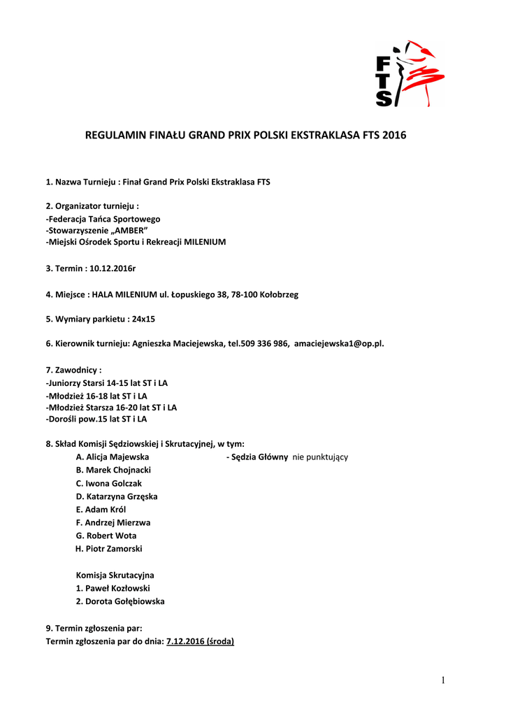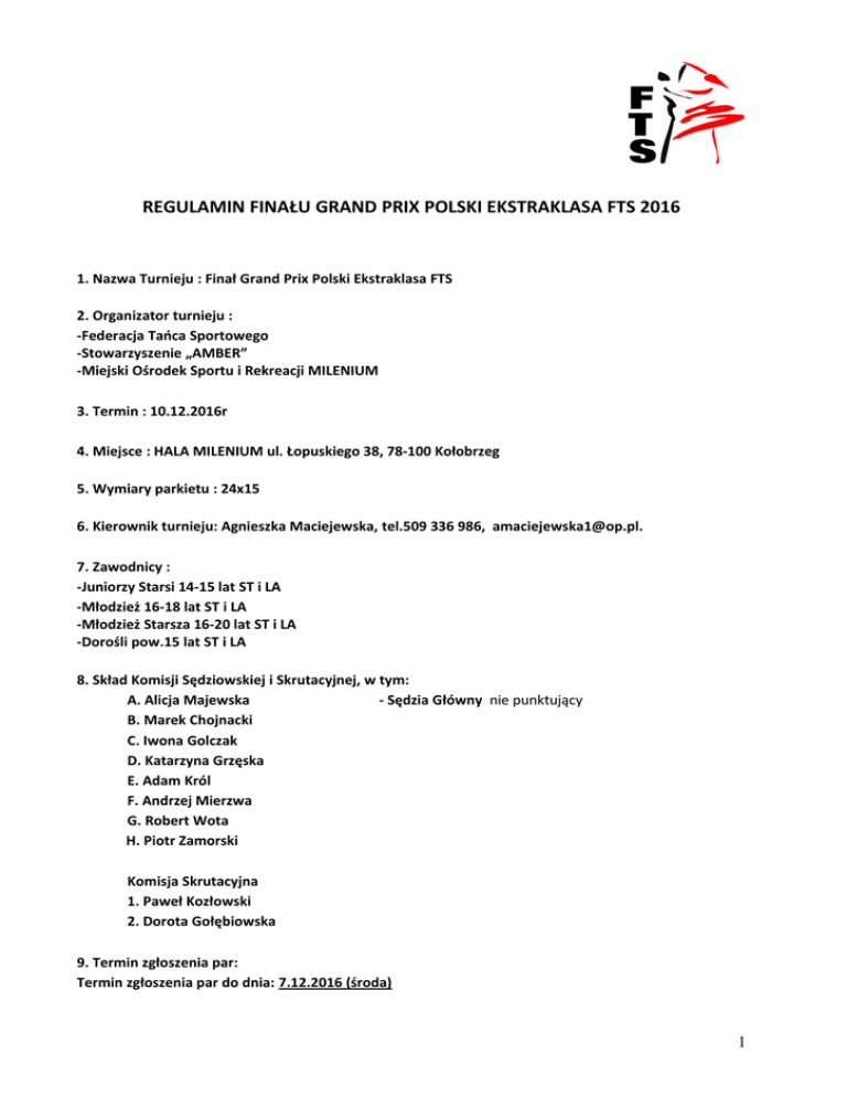REGULAMIN FINAŁU GRAND PRIX POLSKI EKSTRAKLASA FTS 2016 1. Nazwa Turnieju : Finał Grand Prix Polski Ekstraklasa FTS 2. Organizator turnieju : -Federacja Tańca Sportowego -Stowarzyszenie „AMBER” -Miejski Ośrodek Sportu i Rekreacji MILENIUM 3. Termin : 10.12.2016r 4. Miejsce : HALA MILENIUM ul. Łopuskiego 38, 78-100 Kołobrzeg 5. Wymiary parkietu : 24x15 6. Kierownik turnieju: Agnieszka Maciejewska, tel.509 336 986, [email protected]. 7. Zawodnicy : -Juniorzy Starsi 14-15 lat ST i LA -Młodzież 16-18 lat ST i LA -Młodzież Starsza 16-20 lat ST i LA -Dorośli pow.15 lat ST i LA 8. Skład Komisji Sędziowskiej i Skrutacyjnej, w tym: A. Alicja Majewska - Sędzia Główny nie punktujący B. Marek Chojnacki C. Iwona Golczak D. Katarzyna Grzęska E. Adam Król F. Andrzej Mierzwa G. Robert Wota H. Piotr Zamorski Komisja Skrutacyjna 1. Paweł Kozłowski 2. Dorota Gołębiowska 9. Termin zgłoszenia par: Termin zgłoszenia par do dnia: 7.12.2016 (środa) 1 10. Warunki uczestnictwa w turnieju W turnieju może wziąć udział para, która: a) jest zgłoszona do rywalizacji FTS w sporcie tanecznym, b) posiada licencję zawodnika FTS, c) jest zrzeszona w klubie sportowym lub innym podmiocie działającym w strukturach sportowych FTS d) posiada książeczkę startową lub inny dokument potwierdzający datę urodzenia 11. Opłaty, cena biletów wstępu, wpisowe, opłata za nagrywanie, inne opłaty: -Opłata startowa wniesiona do dnia 7.12.2016 na konto organizatora wynosi: 40 zł od osoby za styl. (decyduje data nadania wpłaty). Stowarzyszenie AMBER ul. Łopuskiego 38, 78-100 Kołobrzeg BANK ZACHODNI WBK nr konta 90 1090 2659 0000 0001 1712 8195 z dopiskiem „GPP FTS imię i nazwisko pary, kategoria startowa” Opłata wniesiona po terminie wynosi 60 zł od osoby za styl. -Bilet wstępu : *30 zł / os cały dzień *50 zł /os miejsce przy stoliku (informacja i rezerwacje: [email protected]) Dzieci do lat 7 wstęp wolny ( jeżeli nie zajmują miejsca przy stoliku). 12. Dodatkowe informacje organizatora, bufet, opieka medyczna, stoiska (asortyment). - Opieka medyczna - Bufet - Stoisko taneczne VENA 13. Program turnieju: Sobota 10.12.2016r JUNIORZY (14-15 lat) ST i LA, MŁODZIEŻ STARSZA (16-20 lat) ST i LA rejestracja godz.11.00-12.00 próba parkietu 12.00-12.45 rozpoczęcie godz.13.00 MŁODZIEŻ (16-18 lat) ST i LA, DOROŚLI (pow.15 lat ) ST i LA rejestracja godz. 16.00-17.00 próba parkietu 17.00-17.45 rozpoczęcie godz. 18.00 14. Wszelkie sprawy sporne nie ujęte w niniejszym regulaminie rozstrzyga Kierownik Turnieju w porozumieniu z Sędzią Głównym. 2 REGULAMIN MISTRZOSTW I PUCHARU WOJEWÓDZTWA ZACHODNIOPOMORSKIEGO ZZTS 1. Nazwa Turnieju : Mistrzostwa i Puchar Województwa Zachodniopomorskiego 2016 2. Organizator turnieju : -Zachodniopomorski Związek Tańca Sportowego -Stowarzyszenie „AMBER” -Miejski Ośrodek Sportu i Rekreacji MILENIUM 3. Termin : 10-11.12.2016 (sobota, niedziela) 4. Miejsce : HALA MILENIUM ul.Łopuskiego 38, 78-100 Kołobrzeg 5. Wymiary parkietu : 24x15 6. Kierownik turnieju: Agnieszka Maciejewska, tel.509 336 986, [email protected] 7. Zawodnicy : -Puchar Województwa Zachodniopomorskiego: Dzieci Młodsze ( 8-9 lat) kl. E,D Dzieci Starsze (10-11 lat) kl. E,D,C Juniorzy Młodsi (12-13 lat) kl. E,D,C,B Juniorzy Starsi ( 14-15 lat) kl. E,D,C,B,A Dorośli ( pow.15 lat) kl. E,D,C,B,A -Mistrzostwa Województwa Zachodniopomorskiego: Dzieci Młodsze ( 8-9 lat) open Dzieci Starsze (10-11 lat) open Juniorzy Młodsi (12-13 lat) open Juniorzy Starsi (14-15 lat) open Młodzież (16-18 lat) open Młodzież Starsza (16-20 lat) open Dorośli (pow.15 lat) open 8. Skład Komisji Sędziowskiej i Skrutacyjnej, w tym: A. Tomasz Konury - Sędzia Główny nie punktujący B. Marek Chojnacki C. Iwona Golczak D. Katarzyna Goszka E. Mariusz Korzeb 3 F. Andrzej Mierzwa G. Danuta Niemczynowicz-Przekop H. Robert Wota Komisja Skrutacyjna 1. Paweł Kozłowski 2. Dorota Gołębiowska 9. Termin zgłoszenia par: Wstępny termin zgłoszeń do dnia: 1.12.2016r (czwartek) Ostateczny termin zgłoszeń upływa w dniu: 8.12.2016r 10. Warunki uczestnictwa w turnieju W turnieju może wziąć udział para, która: a) jest zgłoszona do rywalizacji FTS w sporcie tanecznym, b) posiada licencję zawodnika FTS, c) jest zrzeszona w klubie sportowym lub innym podmiocie działającym w strukturach sportowych FTS d) posiada książeczkę startową lub inny dokument potwierdzający datę urodzenia. 11. Opłaty, cena biletów wstępu, wpisowe, opłata za nagrywanie, inne opłaty: Opłata startowa: -Puchar Województwa: klasa E kombinacja - 30 zł/osobę klasy D,C,B,A - 25 zł/ osobę za styl -Mistrzostwa Województwa: kategoria open - 30zł/osobę za styl Bilet wstępu : -30 zł / os jeden dzięń -50 zł /os miejsce przy stoliku (informacja i rezerwacja miejsc: [email protected]) Dzieci do lat 7 wstęp wolny ( jeżeli nie zajmują miejsca przy stoliku) Trenerzy klubów zrzeszonych w ZZTS są naszymi gośćmi !!!! (w kasie turnieju należy odebrać wejściówkę, miejsce przy stoliku). 12. Dodatkowe informacje organizatora, bufet, opieka medyczna, stoiska (asortyment). – Opieka medyczna – Bufet – Stoisko taneczne VENA 13. Wstępny program turnieju: Sobota 10.12.2016 I BLOK godz.10.00 Puchar Województwa ZZTS Niedziela 11.12.2016 4 I BLOK godz.10.00 Puchar Województwa ZZTS II BLOK godz.13.30 Mistrzostwa i Puchar Województwa ZZTS III BLOK godz.18.00 Mistrzostwa Województwa ZZTS Szczegółowy program turnieju z podziałem kategorii na bloki zostanie opublikowany 2.12.2016r (piątek) na podstawie ilości wstępnie zgłoszonych par. 14. Wszelkie sprawy sporne nie ujęte w niniejszym regulaminie rozstrzyga Kierownik Turnieju w porozumieniu z Sędzią Głównym. 5