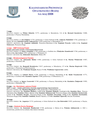 KALENDARIUM PROWINCJI OPATRZNOŚCI BOśEJ NA MAJ 2008 1 maja ROCZNICE ŚMIERCI: o. Wiktor Dekorbe †1771, pochowany w Berezdowie, UA ● br. Bernard Karalewicz †1808, pochowany w Puszczy Mariańskiej. 2 maja ROCZNICE ŚMIERCI: o. Jan Podpusz †1755, pochowany w Górze Kalwarii ● br. AmbroŜy Rudziński †1762, pochowany w Raśnie, BY ● o. Sebastian Stefan AmbroŜewicz †1830, pochowany w Mariampolu, LT. IMIENINY OBCHODZĄ: ks. Zygmunt Jabłoński, Warszawa-Marymont ● ks. Zygmunt Proczek, Lublin ● ks. Zygmunt Stolarczyk, Warszawa-Praga. 3 maja – NMP Królowej Polski Święto patronalne parafii w Warszawie-Marymoncie ROCZNICE ŚMIERCI: o. Aleksy Gargalski †1746, pochowany w Goźlinie ● o. Władysław Kanobrocki †1766, pochowany w Skórcu ● ks. Jan Leitans †1931, pochowany w Welonach, LV. IMIENINY OBCHODZI: ks. Aliaksandr Zharnasek, Mińsk, BY. 4 maja – Wniebowstąpienie Pańskie ROCZNICE ŚMIERCI: ks. Aleksander Bołtuć †1963, pochowany w Górze Kalwarii ● ks. Marian Wiśniewski †1967, pochowany w Hereford, GB. 5 maja ROCZNICE ŚMIERCI: br. Romuald Bratulewicz †1817, pochowany w Mirosławiu, LT ● br. Marian RząŜewski †1986, pochowany w Warszawie na Wawrzyszewie. IMIENINY OBCHODZĄ: br. Waldemar Karpuk, Rzym, IT ● br. Waldemar Ligarzewski, Lublin. 6 maja ROCZNICE ŚMIERCI: o. Gabriel Morze †1746, pochowany w Puszczy Mariańskiej ● br. Rafał Truszkowski †1771, pochowany w Goźlinie ● br. Kazimierz Spečius †1940, pochowany w Wiłkomierzu, LT. 7 maja ROCZNICE ŚMIERCI: o. Ignacy Łoszewski †1748, pochowany w Puszczy Mariańskiej ● br. Kazimierz śmijowski †1995, pochowany w Balsamão, PR. 8 maja – św. Stanisława, patrona Polski NMP z Lujan – święto patronalne wikariatu argentyńskiego Zgromadzenia ROCZNICA ŚMIERCI: ks. Nikodem Długołęski †1768, pochowany w Mariampolu, LT. IMIENINY OBCHODZĄ: br. Stanisław Bednarz, Lublin ● ks. Stanisław Bogucki, Grudziądz ● br. Stanisław Bruc, Puszcza Mariańska ● ks. Stanisław Chryc, Skórzec ● ks. Stanisław Klimaszewski, Warszawa-Stegny ● ks. Stanisław Kosiorowski, Licheń ● br. Stanisław Krygier, Warszawa-Stegny ● ks. Stanisław Krysztopa, Elbląg ● ks. Stanisław Kurlandzki, Warszawa-Stegny ● ks. Stanisław Maliński, Brumov-Bylnice, CZ ● br. Stanisław Sękowski, Stoczek Warmiński. 10 maja ROCZNICE ŚMIERCI: br. Augustyn †1715, pochowany w Górze Kalwarii ● o. Jan Dziewulski †1853, pochowany w ParyŜu, FR. 11 maja – Zesłanie Ducha Świętego ROCZNICE ŚMIERCI: br. Konstanty Bonikowski †1740, pochowany w Skórcu ● o. Walenty Jabłonowski, w 1863 r. aresztowany, przebywał na zesłaniu; data śmierci nieznana. 12 maja NMP Matki Kościoła – święto patronalne: parafii w Dudincach, SK; domu zakonnego w Elblągu; domu zakonnego i parafii w Karagandzie, KAZ; domu zakonnego i parafii w Londynie, GB; domu zakonnego i parafii w Rdzawce; domu zakonnego w Vilgertshofen, D 13 maja ROCZNICE ŚMIERCI: o. Mateusz Miczulewicz †1849, pochowany w Mariampolu, LT ● br. Jan Peldžius †1964, pochowany w Chicago, USA ● ks. Józef Frąckiewicz †1985, pochowany w Głębokiem, BY. IMIENINY OBCHODZI: ks. Robert Maszkowski, Licheń. 14 maja ROCZNICA ŚMIERCI: br. Julian Duchalski †1988, pochowany w Warszawie na Wawrzyszewie. IMIENINY OBCHODZI: ks. Maciej Zachara, Lublin. 15 maja ROCZNICA ŚMIERCI: ks. Kastilis Ramanauskas †1996, pochowany w Onikszcie, LT. 16 maja ROCZNICE ŚMIERCI: o. Aleksander Mraas †1769, pochowany w Mniszewie ● o. Bartłomiej Urban †1890, pochowany w Warszawie ● ks. Klemens Kačergius †1966, pochowany w Mariampolu, LT. IMIENINY OBCHODZĄ: ks. Andrzej Dziedziul, Warszawa-Praga ● ks. Andrzej Szostek, Lublin. 17 maja ROCZNICA ŚMIERCI: o. Wawrzyniec Tchorzewski †1836, pochowany w Puszczy Mariańskiej. 18 maja – Najświętszej Trójcy – święto patronalne parafii w Drui, BY, oraz parafii w Rosicy, BY bł. Stanisława Papczyńskiego, ZałoŜyciela Zgromadzenia ROCZNICE ŚMIERCI: o. Stanisław Pórzycki †1863, pochowany w Skórcu ● br. Konstanty Rimša †1975. 19 maja ROCZNICE ŚMIERCI: o. Michał Sendel †1754, pochowany w Górze Kalwarii ● o. Kajetan Wetycki †1787, pochowany w Mariampolu, LT ● ks. Beniamin UŜdavinis †1985, pochowany w Chicago, USA ● ks. Jan Sakevičius †2006, pochowany w Chicago, USA. 20 maja ROCZNICE ŚMIERCI: o. Aleksander Dydwall †1803, pochowany w Mariampolu, LT ● br. Paweł Detynecki pochowany w Skórcu ● ks. Aleksander Perz †1978, pochowany w Henley-on-Thames, GB. †1832, 21 maja ROCZNICE ŚMIERCI: ks. Leon Kulwieć †1919, pochowany w Warszawie na Bielanach ● kl. Bronisław Kačergius †1924, pochowany na cmentarzu Collegium Germanicum na Watykanie ● br. Piotr Valinčius †1975, pochowany w Mariampolu, LT ● ks. Bernard Mickiewicz †2006, pochowany w Czerniowcach, UA. 22 maja – Najświętszego Ciała i Krwi Chrystusa ROCZNICA ŚMIERCI: ks. Piotr Činikas †1981, pochowany w Chicago, USA. 23 maja ROCZNICE ŚMIERCI: kl. Narcyz Kowalski †1792, pochowany w Warszawie ● br. Franciszek Cieniewski †1802, pochowany w Skórcu ● o. Józef Cieniewski †1811, pochowany w Seroczynie ● br. Jan Stefanowicz †1986, pochowany w Hereford, GB. 24 maja ROCZNICA ŚMIERCI: br. Zygmunt Czerwiński †1985, pochowany w Górze Kalwarii. 25 maja ROCZNICE ŚMIERCI: br. Józef Wilkoszewski †1757, pochowany w Puszczy Mariańskiej ● kl. Wincenty Chojęcki †1780, pochowany w Ostrzykowie, UA. IMIENINY OBCHODZI: ks. Grzegorz Reiss, Warszawa-Stegny. 26 maja ROCZNICE ŚMIERCI: o. AmbroŜy Billewicz †1803, pochowany w Mirosławiu, LT ● kl. Konstanty Danilewicz †1951, pochowany w Warszawie na Wawrzyszewie. 27 maja ROCZNICA ŚMIERCI: br. Augustyn Grundans †1928, pochowany w Welonach, LV. 29 maja ROCZNICA ŚMIERCI: ks. Napoleon Lubowicki †1931, pochowany w Wysokim Litewskim, BY. 30 maja ROCZNICA ŚMIERCI: ks. abp Franciszek Karevičius †1945, pochowany w Kowni