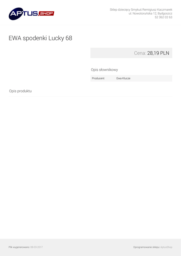 Sklep dziecięcy Smykuś Remigiusz Kaczmarek ul. Nowotoruńska 12, Bydgoszcz 52 362 02 63 EWA spodenki Lucky 68 Cena: 28,19 PLN Opis słownikowy Producent Ewa Klucze Opis produktu Plik wygenerowano: 08-03-2017 Powered by TCPDF (www.tcpdf.org) Oprogramowanie sklepu: AptusShop