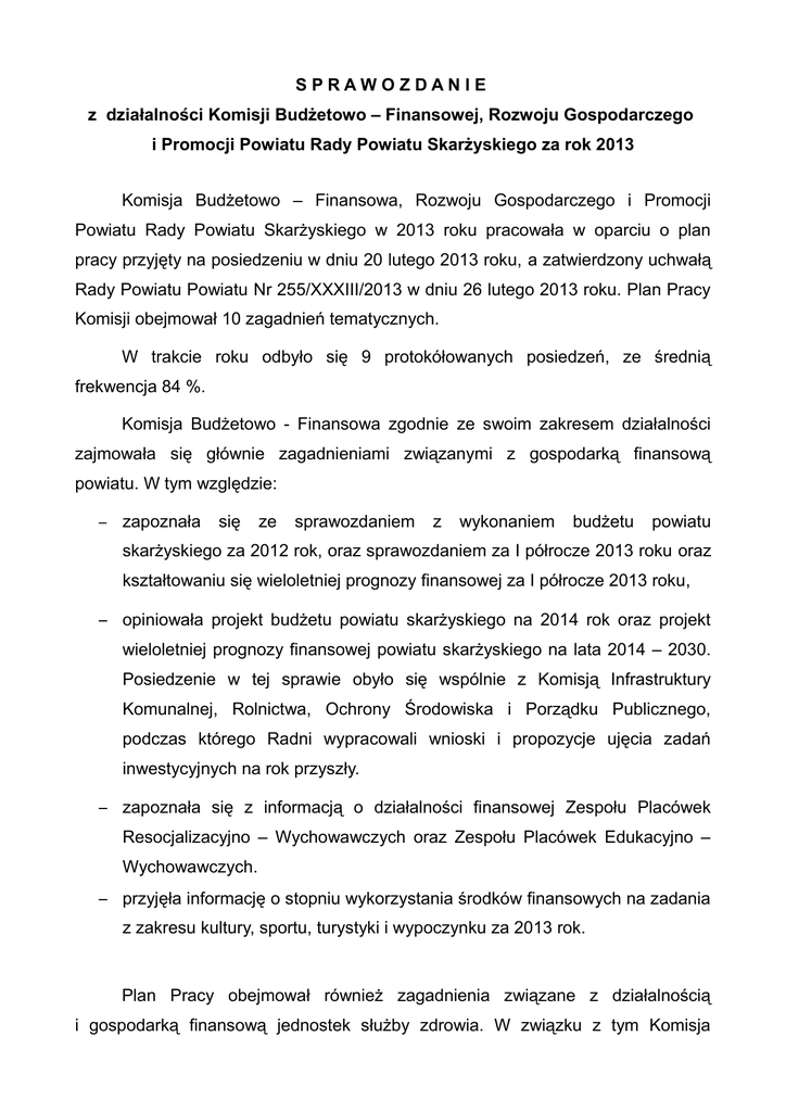 SPRAWOZDANIE z działalności Komisji Budżetowo – Finansowej, Rozwoju Gospodarczego i Promocji Powiatu Rady Powiatu Skarżyskiego za rok 2013 Komisja Budżetowo – Finansowa, Rozwoju Gospodarczego i Promocji Powiatu Rady Powiatu Skarżyskiego w 2013 roku pracowała w oparciu o plan pracy przyjęty na posiedzeniu w dniu 20 lutego 2013 roku, a zatwierdzony uchwałą Rady Powiatu Powiatu Nr 255/XXXIII/2013 w dniu 26 lutego 2013 roku. Plan Pracy Komisji obejmował 10 zagadnień tematycznych. W trakcie roku odbyło się 9 protokółowanych posiedzeń, ze średnią frekwencja 84 %. Komisja Budżetowo - Finansowa zgodnie ze swoim zakresem działalności zajmowała się głównie zagadnieniami związanymi z gospodarką finansową powiatu. W tym względzie: – zapoznała się ze sprawozdaniem z wykonaniem budżetu powiatu skarżyskiego za 2012 rok, oraz sprawozdaniem za I półrocze 2013 roku oraz kształtowaniu się wieloletniej prognozy finansowej za I półrocze 2013 roku, – opiniowała projekt budżetu powiatu skarżyskiego na 2014 rok oraz projekt wieloletniej prognozy finansowej powiatu skarżyskiego na lata 2014 – 2030. Posiedzenie w tej sprawie obyło się wspólnie z Komisją Infrastruktury Komunalnej, Rolnictwa, Ochrony Środowiska i Porządku Publicznego, podczas którego Radni wypracowali wnioski i propozycje ujęcia zadań inwestycyjnych na rok przyszły. – zapoznała się z informacją o działalności finansowej Zespołu Placówek Resocjalizacyjno – Wychowawczych oraz Zespołu Placówek Edukacyjno – Wychowawczych. – przyjęła informację o stopniu wykorzystania środków finansowych na zadania z zakresu kultury, sportu, turystyki i wypoczynku za 2013 rok. Plan Pracy obejmował również zagadnienia związane z działalnością i gospodarką finansową jednostek służby zdrowia. W związku z tym Komisja Budżetowo – Finansowa zapoznała się ze sprawozdaniami finansowymi Międzyzakładowego Ośrodka Medycyny Pracy, Zespołu Opieki Zdrowotnej oraz Obwodu Lecznictwa Kolejowego za 2012 rok. Przyjęła również informację Zarządu Powiatu na temat przebiegu wykonania planów finansowych samodzielnych publicznych zakładów opieki zdrowotnej, dla których organem założycielskim jest powiat skarżyski za I półrocze 2013 roku. Radni zapoznali się także z założeniami programowymi działań Zespołu Opieki Zdrowotnej na lata 2013 – 2018 oraz aktualna sytuacją finansową i kadrową placówki. W roku 2013 Komisja podejmowała tematykę związaną z działalnością Powiatowego Urzędu Pracy w Skarżysku-Kamiennej. W tym względzie zapoznała się z informacją o stanie bezrobocia na terenie powiatu skarżyskiego, realizacją zadań z zakresu promocji zatrudnienia, łagodzenia skutków bezrobocia oraz aktywizacji zawodowej bezrobotnych. Ponadto wysłuchała informacji o realizacji projektów realizowanych i wdrażanych przez PUP oraz działalności lokalnych punktów informacyjno – konsultacyjnych. Przyjęła także sprawozdanie z realizacji Powiatowego Programu Promocji Zatrudnienia oraz Aktywizacji Rynku Pracy . Jak co roku sprawozdaniem z Komisja Budżetowo działalności – Powiatowego Finansowa Centrum zapoznała Pomocy się ze Rodzinie w Skarżysku-Kamiennej za 2012 rok wraz z wykazem potrzeb w zakresie pomocy społecznej. Ponadto analizowała sprawozdanie z realizacji programu współpracy z organizacjami pozarządowymi i innymi podmiotami prowadzącymi działalność pożytku publicznego w roku 2012 . Komisja w czasie swych posiedzeń opiniowała wszystkie projekty uchwał wnoszone pod obrady Rady Powiatu. W trakcie roku przyjęto 7 wniosków, z czego 4 wnioski dotyczyły uchwał wnoszonych pod obrady Rady Powiatu, 3 wnioski finansów powiatu. Przewodniczący Komisji Krzysztof Ligowski