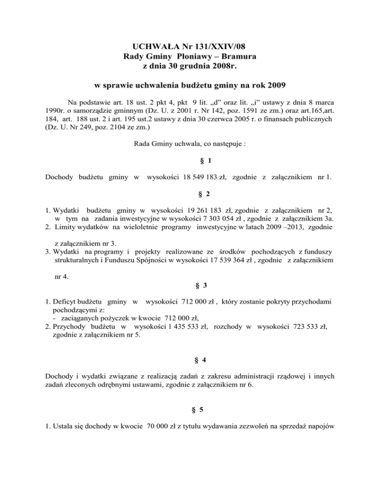 UCHWAŁA Nr 131/XXIV/08 Rady Gminy Płoniawy – Bramura z dnia 30 grudnia 2008r. w sprawie uchwalenia budżetu gminy na rok 2009 Na podstawie art. 18 ust. 2 pkt 4, pkt 9 lit. „d” oraz lit. „i” ustawy z dnia 8 marca 1990r. o samorządzie gminnym (Dz. U. z 2001 r. Nr 142, poz. 1591 ze zm.) oraz art.165,art. 184, art. 188 ust. 2 i art. 195 ust.2 ustawy z dnia 30 czerwca 2005 r. o finansach publicznych (Dz. U. Nr 249, poz. 2104 ze zm.) Rada Gminy uchwala, co następuje : § 1 Dochody budżetu gminy w wysokości 18 549 183 zł, zgodnie z załącznikiem nr 1. § 2 1. Wydatki budżetu gminy w wysokości 19 261 183 zł, zgodnie z załącznikiem nr 2, w tym na zadania inwestycyjne w wysokości 7 303 054 zł , zgodnie z załącznikiem 3a. 2. Limity wydatków na wieloletnie programy inwestycyjne w latach 2009 –2013, zgodnie z załącznikiem nr 3. 3. Wydatki na programy i projekty realizowane ze środków pochodzących z funduszy strukturalnych i Funduszu Spójności w wysokości 17 539 364 zł , zgodnie z załącznikiem nr 4. § 3 1. Deficyt budżetu gminy w wysokości 712 000 zł , który zostanie pokryty przychodami pochodzącymi z: - zaciąganych pożyczek w kwocie 712 000 zł, 2. Przychody budżetu w wysokości 1 435 533 zł, rozchody w wysokości 723 533 zł, zgodnie z załącznikiem nr 5. § 4 Dochody i wydatki związane z realizacją zadań z zakresu administracji rządowej i innych zadań zleconych odrębnymi ustawami, zgodnie z załącznikiem nr 6. § 5 1. Ustala się dochody w kwocie 70 000 zł z tytułu wydawania zezwoleń na sprzedaż napojów alkoholowych oraz wydatki w kwocie 65 000 zł na realizację zadań określonych w gminnym programie profilaktyki i rozwiązywania problemów alkoholowych. 2.Ustala się wydatki w kwocie 5 000 zł na realizację zadań określonych w gminnym programie przeciwdziałania narkomanii. § 6 Plan dochodów i wydatków w łącznej kwocie dla dochodów własnych jednostek budżetowych: dochody 153 667 zł; wydatki 158 674 zł, zgodnie z załącznikiem nr 7 . § 7 Dotacje podmiotowe dla : - gminnych instytucji kultury na łączną kwotę - 175 236 zł, § 8 Ustala się plan przychodów i wydatków Gminnego Funduszu Ochrony Środowiska i Gospodarki Wodnej w wysokości : 1) przychody - 7 000 zł, 2) wydatki - 7 000 zł, zgodnie z załącznikiem nr 8. §9 Limity zobowiązań z tytułu emisji papierów wartościowych oraz kredytów i pożyczek zaciąganych na: 1) sfinansowanie planowanego deficytu budżetu w kwocie 712 000 zł, 2) spłatę wcześniej zaciągniętych zobowiązań z tytułu zaciągniętych pożyczek i kredytów w kwocie 723 533 zł. § 10 Upoważnia się Wójta Gminy do: 1) zaciągania kredytów i pożyczek oraz emisji papierów wartościowych na pokrycie występującego w ciągu roku przejściowego deficytu budżetu do wysokości 6 000 000 zł, 2) zaciągania zobowiązań: a) na finansowanie wydatków na wieloletnie programy inwestycyjne, na programy i projekty realizowane ze środków Unii Europejskiej lub bezzwrotnych środków zagranicznych oraz na zadania wynikające z kontraktów wojewódzkich do wysokości określonej w załącznikach nr 3 i 4, b) z tytułu umów, których realizacja w roku następnym (2010) jest niezbędna dla zapewnienia ciągłości działania gminy i termin zapłaty upływa w 2010r. 3) dokonywania zmian w planie wydatków, z wyłączeniem przeniesień wydatków między działami, 4) przekazania kierownikom jednostek budżetowych uprawnień do dokonywania przeniesień w planie wydatków oraz w planie dochodów własnych i wydatków nimi finansowanych, 5) lokowania wolnych środków budżetowych na rachunkach bankowych w innych bankach, niż bank prowadzący obsługę budżetu gminy. § 11 Dołącza się do uchwały prognozę łącznej kwoty długu i spłat gminy na koniec 2009 roku i lata następne. § 12 Wykonanie uchwały powierza się Wójtowi Gminy. § 13 Uchwała wchodzi w życie z dniem 1 stycznia 2009 roku i podlega publikacji w Dzienniku Urzędowym Województwa Mazowieckiego. BUDŻET GMINY Płoniawy-Bramura na rok 2009 Dochody ogółem planuje się w kwocie 18 549 183 zł z czego: - dochody bieżące 13 737 397 zł - dochody majątkowe 4 811 786 zł W dochodach bieżących: - subwencje 6 579 244 zł - dotacje na zadania zlecone 1 884 676 zł - dotacje na zadania własne 197 600 zł Wydatki ogółem planuje się w kwocie 19 261 183zł z czego : - wydatki bieżące - wydatki majątkowe 11 958 129 zł 7 303 054 zł Deficyt budżetu w kwocie 712 000 zł zostanie pokryty z pożyczek zaciągniętych w WFOŚ i GW na : - sieć wodociągową we wsi Łęgi 129 000 zł, - zakup średniego samochodu p. poż. dla OSP Płoniawy 400 000 zł, - modernizację budynku UG 111 000 zł, - modernizację kotłowni centralnego ogrzewania w Szkole Podstawowej w Węgrzynowie 72 000 zł. Spłaty zaciągniętych wcześniej zobowiązań w kwocie: - spłata kredytów w wysokości 676 189 zł - spłata pożyczek w wysokości 47 344 zł. zostaną pokryte kredytem. I. D O C H O D Y Dział 010 - ROLNICTWO i ŁOWIECTWO Dochody planuje się w wysokości 654 800 zł. Dochody bieżące w kwocie 4 800 zł i jest to czynsz dzierżawny obwodów łowieckich , dochody majątkowe w kwocie 650 000 zł to dotacja na sieć wodociągową we wsi Łęgi w kwocie 50 000 zł oraz środki z RPO na przyzagrodowe oczyszczalnie ścieków kwocie 600 000 zł . Dział 400 - WYTWARZANIE I ZAOPTRYWANIE W ENERGIĘ ELEKTRYCZNĄ, GAZ I WODĘ Dochody w wysokości 294 347 zł planuje się uzyskać z tytułu sprzedaży wody, odsetek od nieterminowych wpłat oraz kosztów upomnień i są to dochody bieżące. Dział 600- TRANSPORT I ŁĄCZNOŚĆ Dochody w tym dziale w kwocie 100 000 zł to dochody majątkowe i jest to dotacja na zadania inwestycyjne. Dział 700 - GOSPODARKA MIESZKANIOWA Dochody w wysokości 17 801 zł planuje się uzyskać z tytułu opłat za użytkowanie wieczyste w kwocie 534 zł, za dzierżawę składników majątkowych i wynajem lokali mieszkalny
