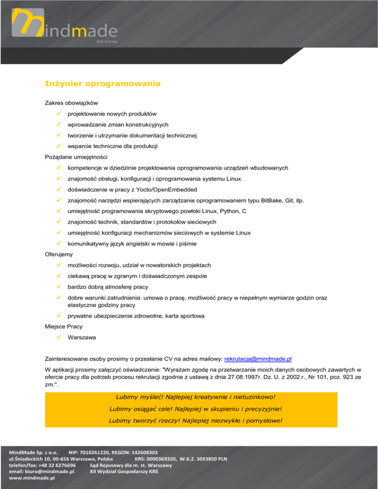 Inżynier oprogramowania Zakres obowiązków projektowanie nowych produktów wprowadzanie zmian konstrukcyjnych tworzenie i utrzymanie dokumentacji technicznej wsparcie techniczne dla produkcji Pożądane umiejętności kompetencje w dziedzinie projektowania oprogramowania urządzeń wbudowanych znajomość obsługi, konfiguracji i oprogramowania systemu Linux doświadczenie w pracy z Yocto/OpenEmbedded znajomość narzędzi wspierających zarządzanie oprogramowaniem typu BitBake, Git, itp. umiejętność programowania skryptowego powłoki Linux, Python, C znajomość technik, standardów i protokołów sieciowych umiejętność konfiguracji mechanizmów sieciowych w systemie Linux komunikatywny język angielski w mowie i piśmie Oferujemy możliwości rozwoju, udział w nowatorskich projektach ciekawą pracę w zgranym i doświadczonym zespole bardzo dobrą atmosferę pracy dobre warunki zatrudnienia: umowa o pracę, możliwość pracy w niepełnym wymiarze godzin oraz elastyczne godziny pracy prywatne ubezpieczenie zdrowotne, karta sportowa Miejsce Pracy Warszawa Zainteresowane osoby prosimy o przesłanie CV na adres mailowy: [email protected] W aplikacji prosimy załączyć oświadczenie: "Wyrażam zgodę na przetwarzanie moich danych osobowych zawartych w ofercie pracy dla potrzeb procesu rekrutacji zgodnie z ustawą z dnia 27.08.1997r. Dz. U. z 2002 r., Nr 101, poz. 923 ze zm.". Lubimy myśleć! Najlepiej kreatywnie i nietuzinkowo! Lubimy osiągać cele! Najlepiej w skupieniu i precyzyjnie! Lubimy tworzyć rzeczy! Najlepiej niezwykłe i pomysłowe! MindMade Sp. z o.o. NIP: 7010261220, REGON: 142608303 ul.Śniadeckich 10, 00-656 Warszawa, Polska KRS: 0000369320, W.K.Z. 3033850 PLN telefon/fax: +48 22 6276696 Sąd Rejonowy dla m. st. Warszawy email: [email protected] XII Wydział Gospodarczy KRS www.mindmade.pl