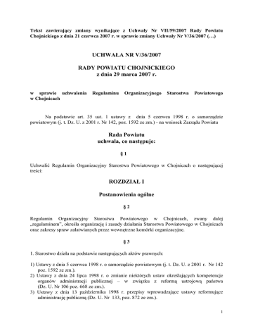 Tekst zawierający zmiany wynikające z Uchwały Nr VII/59/2007 Rady Powiatu Chojnickiego z dnia 21 czerwca 2007 r. w sprawie zmiany Uchwały Nr V/36/2007 (…) - projekt UCHWAŁA NR V/36/2007 RADY POWIATU CHOJNICKIEGO z dnia 29 marca 2007 r. w sprawie uchwalenia w Chojnicach Regulaminu Organizacyjnego Starostwa Powiatowego Na podstawie art. 35 ust. 1 ustawy z dnia 5 czerwca 1998 r. o samorządzie powiatowym (j. t. Dz. U. z 2001 r. Nr 142, poz. 1592 ze zm.) - na wniosek Zarządu Powiatu Rada Powiatu uchwala, co następuje: §1 Uchwalić Regulamin Organizacyjny Starostwa Powiatowego w Chojnicach o następującej treści: ROZDZIAŁ I Postanowienia ogólne §2 Regulamin Organizacyjny Starostwa Powiatowego w Chojnicach, zwany dalej „regulaminem”, określa organizację i zasady działania Starostwa Powiatowego w Chojnicach oraz zakresy spraw załatwianych przez wewnętrzne komórki organizacyjne. §3 1. Starostwo działa na podstawie następujących aktów prawnych: 1) Ustawy z dnia 5 czerwca 1998 r. o samorządzie powiatowym (j. t. Dz. U. z 2001 r. Nr 142 poz. 1592 ze zm.). 2) Ustawy z dnia 24 lipca 1998 r. o zmianie niektórych ustaw określających kompetencje organów administracji publicznej – w związku z reformą ustrojową państwa (Dz. U. Nr 106 poz. 668 ze zm.). 3) Ustawy z dnia 13 października 1998 r. przepisy wprowadzające ustawy reformujące administrację publiczną (Dz. U. Nr 133, poz. 872 ze zm.). 1 4) Ustawy z dnia 24 lipca 1998 r. o wprowadzeniu zasadniczego trójstopniowego podziału terytorialnego państwa (Dz. U. Nr 96, poz. 603 ze zm.), 5) Rozporządzenia Rady Ministrów z dnia 7 sierpnia 1998 r. w sprawie utworzenia powiatów (Dz. U. Nr 103, poz. 652), 6) Ustawy z dnia 24 lipca 1998 r. o wejściu w Ŝycie ustawy o samorządzie powiatowym, ustawy o samorządzie województwa oraz ustawy o administracji rządowej w województwie (Dz. U. Nr 99, poz. 631), 7) Ustawy z dnia 22 marca 1990 r. o pracownikach samorządowych ( j. t. Dz. U. z 2001 r. Nr 142, poz. 1593 ze zm.) 8) Statutu Powiatu i niniejszego regulaminu. §4 1. Ilekroć w regulaminie jest mowa o: 1) regulaminie – naleŜy przez to rozumieć Regulamin Organizacyjny Starostwa Powiatowego w Chojnicach, 2) Powiecie - naleŜy przez to rozumieć Powiat Chojnicki z siedzibą w Chojnicach, 3) Radzie – naleŜy przez to rozumieć Radę Powiatu w Chojnicach, 4) Zarządzie – naleŜy przez to rozumieć Zarząd Powiatu w Chojnicach, 5) Staroście, Wicestaroście, Skarbniku – naleŜy przez to rozumieć Starostę Chojnickiego, Wicestarostę Chojnickiego, Skarbnika Powiatu Chojnickiego, 6) Etatowym Członku Zarządu – naleŜy przez to rozumieć członka Zarządu Powiatu Chojnickiego, z którym nawiązany został stosunek pracy w Starostwie Powiatowym, 1 6 )Sekretarzu - naleŜy przez to rozumieć Sekretarza Powiatu, 7) Starostwie – naleŜy przez to rozumieć Starostwo Powiatowe w Chojnicach, 8) wydziale –naleŜy przez to rozumieć komórki organizacyjne Starostwa, wymienione w § 8. §5 1. Pracą Starostwa kieruje Starosta przy pomocy Wicestarosty, Etatowego Członka Zarządu, Sekretarza, Skarbnika i dyrektorów wydziałów. 2. Starostwo jest jednostką budŜetową z siedzibą w Chojnicach, ul. 31 Stycznia 56, przy pomocy, której Zarząd wykonuje zadania Powiatu. 3. Kierownikiem i zwierzchnikiem słuŜbowym pracowników Starostwa jest Starosta. § 6 1. Starostwo wykonuje: 1) określone ustawami: a) zadania publiczne o charakterze ponadgminnym, b) zadania z zakresu administracji rządowej, c) inne zadania wynikające z przepisów szczególnych; 2) zadania powierzone w drodze porozumień zawartych z organami administracji rządowej lub samorządowej; 3) zadania wynikające z uchwał Rady lub Zarządu. 2 ROZDZIAŁ II Organizacja Starostwa § 7 1. Wewnętrznymi komórkami organizacyjnymi Starostwa są wydziały, biura i samodzielne stanowiska, wymienione w § 8. 2. Wydziały, biura i samodzielne stanowiska, kaŜde w zakresie określonym w regulaminie, podejmują działania i prowadzą sprawy związane z realizacją zadań Powiatu. § 8 1. W skład Starostwa wchodzą następujące wydziały, biura i samodzielne stanowiska, które przy oznakowaniu spraw uŜywają symboli: 1) Wydział Organizacyjno – Prawny i Spraw Obywatelskich w tym: a) Biuro Obsługi Interesantów b) Zespół ds. Remontów OR 2) Wydział Finansowo – BudŜetowy FN 3) Wydział Architektury i Budownictwa AB 4) Wydział Ochrony Środowiska, Rolnictwa i Leśnictwa OS 5) Wydział Geodezji i Nieruchomości W skład Wydziału Geodezji i Nieruchomości wchodzą: a) Biuro Ewidencji Gruntów i Budynków, b) Powiatowy Ośrodek Dokumentacji Geodezyjnej i Kartograficznej, c) Zespół Uzgadniania Dokumentacji Projektowej, d) Biuro Gospodarki Nieruchomościami GN 6) Wydział Komunikacji i Transportu KT 7) Wydział Edukacji, Kultury, Sportu i Zdrowia OKZ 8) Biuro Rady BR 9) Biuro ds. Zarządzania Kryzysowego i Ochrony Ludności ZK 10) Biuro ds. Funduszy BF 11) Samodzielne stanowisko Powiatowego Rzecznika Konsumentów RK 3 12) Samodzielne stanowisko ds. audytu wewnętrznego 13) Samodzielne stanowisko ds. kontroli AW KF 14) Pełnomocnik ds. Ochrony Informacji Niejawnych PO 15) Pełnomocnik ds. Zamówień Publicznych PZP 16) Pełnomocnik ds. Osób Niepełnosprawnych PON 17) Pełnomocnik ds. Systemu Zarządzania Jakością PSJ 18) Pełnomocnik ds. Bezpieczeństwa Ruchu Drogowego PB § 9 1. W wydziałach tworzone są stanowiska pracy jedno i wieloosobowe. 2. Na czele wydziałów stoją dyrektorzy, a na czele biur kierownicy. 3. Nabór na stanowiska urzędnicze, w tym kierownicze stanowiska urzędnicze, przeprowadza się na zasadach i w trybie ustawy o pracownikach samorządowych oraz zarządzenia Starosty regulującego system zatrudniania pracowników w Starostwie Powiatowym w Chojnicach. 4. Nabór kandydatów organizuje Starosta. § 10 1. W Starostwie tworzy się następujące stanowiska kierownicze: 1) Starosta, 2) Wicestarosta, 3) Etatowy Członek Zarządu, 31) Se
