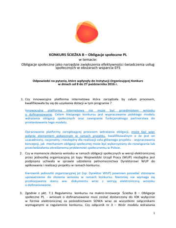 KONKURS ŚCIEŻKA B – Obligacje społeczne PL w temacie: Obligacje społeczne jako narzędzie zwiększenia efektywności świadczenia usług społecznych w obszarach wsparcia EFS Odpowiedzi na pytania, które wpłynęły do Instytucji Organizującej Konkurs w dniach od 8 do 27 października 2016 r. 1. Czy innowacyjna platforma internetowa która zarządzała by całym procesem, kwalifikowała by się do uzyskania dotacji w tym programie ? Innowacyjna platforma internetowa nie może być przedmiotem wniosku o dofinansowanie. Celem bieżącego konkursu jest wypracowanie polskiego modelu wdrażania obligacji społecznych oraz zawiązanie funkcjonalnego partnerstwa do przetestowania tego modelu. Opracowanie platformy zarządzającej procesem wdrażania obligacji, może być więc jedynie elementem pobocznym w ramach projektu, kwalifikowalnym o ile jest on uzasadniony, racjonalny i niezbędny dla realizacji celu głównego projektu - wypracowania koncepcji, jak mechanizm obligacji społecznej może być wykorzystany do rozwiązania lub przeciwdziałania określonemu problemowi społecznemu w Polsce. 2. Czy w momencie złożenia wniosku w ramach obligacji społecznych w wersji elektronicznej przez jednostkę organizacyjną jst typu Wojewódzki Urząd Pracy (WUP) niezbędna jest podpisana uchwała w sprawie udzielenia pełnomocnictwa Dyrektorowi WUP do aplikowania i realizacji projektu w ramach konkursu. Kierownik jednostki organizacyjnej jst (np. Dyrektor WUP) powinien posiadać stosowne upoważnienie do złożenia wniosku w ramach konkursu. Niemniej nie wymaga się przekazywania skanu ww. dokumentu wraz z wersją elektroniczną wniosku o dofinansowanie. 3. Zgodnie z pkt. 7.1 Regulaminu konkursu na makro-innowacje Ścieżka B – Obligacje społeczne PL - wniosek o dofinansowanie musi zostać dostarczony do IOK wyłącznie w formie elektronicznej za pośrednictwem SOWA wraz ze wszystkimi załącznikami wymaganymi w regulaminie konkursu. Czy załącznik nr 3 – Wzór modelu wdrażania 1 obligacji społecznych, ma zostać załączony w formie skanu dokumentu zawierającego podpis osoby uprawnionej do reprezentowania wnioskodawcy, zgodny z pkt.2.7 wniosku o dofinansowanie czy dokumentu tekstowego (bez podpisów) ? Na wersji elektronicznej załącznika nr 3 - Wzór modelu wdrażania obligacji społecznych, przesyłanej wraz z wnioskiem o dofinansowanie poprzez system SOWA, nie wymagamy podpisu osoby uprawnionej do reprezentowania wnioskodawcy (i partnerów, jeśli dotyczy). Prosimy jednak o wpisanie imienia i nazwiska (lub imion i nazwisk) osób uprawnionych pod tekstem w pliku doc. Dane te powinny pokrywać się z punktem 2.7 wniosku (również 2.9 - w przypadku projektu partnerskiego). 2