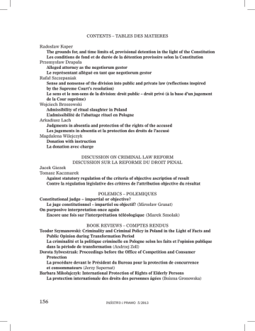 CONTENTS – TABLES DES MATIERES Radosław Koper The grounds for, and time limits of, provisional detention in the light of the Constitution Les conditions de fond et de durée de la détention provisoire selon la Constitution Przemysław Drapała Alleged attorney as the negotiorum gestor Le représentant allégué en tant que negotiorum gestor Rafał Szczepaniak Sense and nonsense of the division into public and private law (reflections inspired by the Supreme Court’s resolution) Le sens et le non-sens de la division: droit public – droit privé (à la base d’un jugement de la Cour suprême) Wojciech Brzozowski Admissibility of ritual slaughter in Poland L’admissibilité de l’abattage rituel en Pologne Arkadiusz Lach Judgments in absentia and protection of the rights of the accused Les jugements in absentia et la protection des droits de l’accusé Magdalena Wilejczyk Donation with instruction La donation avec charge DISCUSSION ON CRIMINAL LAW REFORM DISCUSSION SUR LA REFORME DU DROIT PENAL Jacek Giezek Tomasz Kaczmarek Against statutory regulation of the criteria of objective ascription of result Contre la régulation législative des critères de l’attribution objective du résultat POLEMICS – POLEMIQUES Constitutional judge – impartial or objective? Le juge constitutionnel – impartiel ou objectif? (Mirosław Granat) On purposive interpretation once again Encore une fois sur l’interprétation téléologique (Marek Smolak) BOOK REVIEWS – COMPTES RENDUS Teodor Szymanowski: Criminality and Criminal Policy in Poland in the Light of Facts and Public Opinion during Transformation Period La criminalité et la politique criminelle en Pologne selon les faits et l’opinion publique dans la période de transformation (Andrzej Zoll) Dorota Sylwestrzak: Proceedings before the Office of Competition and Consumer Protection La procédure devant le Président du Bureau pour la protection de concurrence et consommateurs (Jerzy Supernat) Barbara Mikołajczyk: International Protection of Rights of Elderly Persons La protection internationale des droits des personnes âgées (Bożena Gronowska) 156 PAŃSTWO i PRAWO 5/2013 СОДЕРЖАНИЕ НОМЕРА Радослав Копер Основания и сроки временного ареста в свете Конституции Пшемыслав Драпала Мнимый представитель как negotiorum gestor Рафал Шчепаняк Смысл и бессмыслица разделения на публичное и частное право (на основании решения Верховного Суда) Войчех Бжозовски Допустимость ритуального убоя в Польше Аркадиуш Лях Приговоры in absentia и охрана прав обвиняемого Магдаленя Вилейчик Дарение, обремененное возложением ДИСКУССИЯ О РЕФОРМЕ УГОЛОВНОГО ПРАВА Яцек Гэзек Томаш Качмарек Против законодательного регулирования критериев объективного приписывания следствия ПОЛЕМИКИ Конституционный судья – беспристрастный или объективный? (Мирослав Гранат) Еще раз о целевом толковании (Марэк Смоляк) РЕЦЕНЗИИ Теодор Шимановски: Преступность и уголовная политика в Польше периода трансформации в свете фактов и общественного мнения (рец. Анджей Цоль) Дорота Сильвестшак: Процесс у главы Комитета по охране конкуренции и потребителей (рец. Ежи Супернат) Барбара Миколайчик: Международная охрана прав пожилых людей (рец. Божена Гроновска) PAŃSTWO i PRAWO 5/2013 157 TREŚĆ ZESZYTU 5/2013 „PAŃSTWA I PRAWA” Dr hab. Radosław Koper, Uniwersytet Śląski w Katowicach Podstawy i terminy tymczasowego aresztowania w świetle Konstytucji . . . . . . . . . . . . . . . . . . . . . . . . 3 Prof. dr hab. Przemysław Drapała, Akademia Leona Koźmińskiego w Warszawie Pełnomocnik rzekomy jako negotiorum gestor . . . . . . . . . . . . . . . . . . . . . . . . . . . . . . . . . . . . . . . . . . . . 17 Dr hab. Rafał Szczepaniak, Uniwersytet im. Adama Mickiewicza w Poznaniu Sens i nonsens podziału na prawo publiczne i prywatne (na kanwie uchwały SN). . . . . . . . . . . . . . . 31 * Dr Wojciech Brzozowski, Uniwersytet Warszawski Dopuszczalność uboju rytualnego w Polsce. . . . . . . . . . . . . . . . . . . . . . . . . . . . . . . . . . . . . . . . . . . . . . . 47 Prof. dr hab. Arkadiusz Lach, Uniwersytet Mikołaja Kopernika w Toruniu Wyroki in absentia a ochrona praw oskarżonego . . . . . . . . . . . . . . . . . . . . . . . . . . . . . . . . . . . . . . . . . . 57 Dr Magdalena Wilejczyk, Uniwersytet Ekonomiczny we Wrocławiu Darowizna obciążona poleceniem. . . . . . . . . . . . . . . . . . . . . . . . . . . . . . . . . . . . . . . . . . . . . . . . . . . . . . . 67 DYSKUSJA NAD REFORMĄ PRAWA KARNEGO Prof. dr hab. Jacek Giezek, Uniwersytet Wrocławski Prof. dr hab. Tomasz Kaczmarek, Uniwersytet Wrocławski Przeciwko ustawowej regulacji kryteriów obiektywnego przypisania skutku . . . . . . . . . . . . . . . . . . 79 POLEMIKI Sędzia konstytucyjny – bezstronny czy obiektywny? (Mirosław Granat) . . . . . . . . . . . . . . . . . . . . . . . . . . 93 O wykładni celowościowej raz jeszcze (Marek Smolak). . . . . . . . . . . . . . . . . . . . . . . . . . . . . . . . . . . . . . . . . 97 Zbigniew Radwański Janina Panowicz-Lipska. . . . . . . . . . . . . . . . . . . . . . . . . . . . . . . . . . . . . . . . . . . . . . . 103 RE