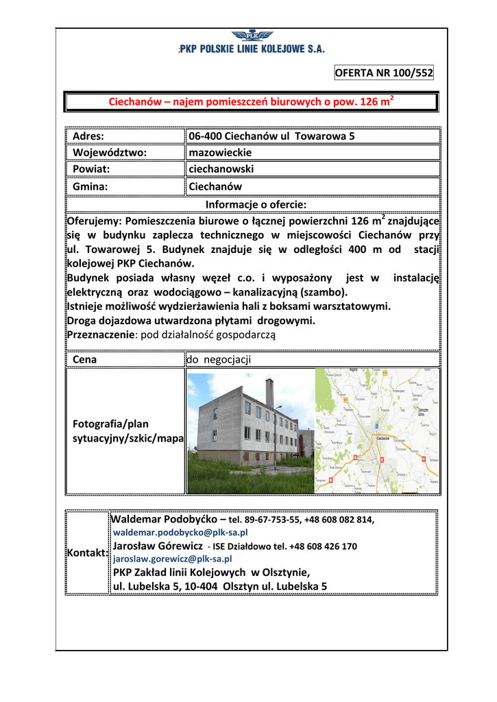 ; OFERTA NR 100/552 Ciechanów – najem pomieszczeń biurowych o pow. 126 m2 Adres: Województwo: Powiat: 06-400 Ciechanów ul Towarowa 5 mazowieckie ciechanowski Gmina: Ciechanów Informacje o ofercie: Oferujemy: Pomieszczenia biurowe o łącznej powierzchni 126 m2 znajdujące się w budynku zaplecza technicznego w miejscowości Ciechanów przy ul. Towarowej 5. Budynek znajduje się w odległości 400 m od stacji kolejowej PKP Ciechanów. Budynek posiada własny węzeł c.o. i wyposażony jest w instalację elektryczną oraz wodociągowo – kanalizacyjną (szambo). Istnieje możliwość wydzierżawienia hali z boksami warsztatowymi. Droga dojazdowa utwardzona płytami drogowymi. Przeznaczenie: pod działalność gospodarczą Cena do negocjacji Fotografia/plan sytuacyjny/szkic/mapa Waldemar Podobyćko – tel. 89-67-753-55, +48 608 082 814, [email protected] Jarosław Górewicz - ISE Działdowo tel. +48 608 426 170 Kontakt: [email protected] PKP Zakład linii Kolejowych w Olsztynie, ul. Lubelska 5, 10-404 Olsztyn ul. Lubelska 5