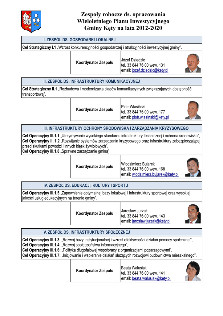 Zespoły robocze ds. opracowania Wieloletniego Planu Inwestycyjnego Gminy Kęty na lata 2012-2020 I. ZESPÓŁ DS. GOSPODARKI LOKALNEJ Cel Strategiczny I.1 „Wzrost konkurencyjności gospodarczej i atrakcyjności inwestycyjnej gminy”. Koordynator Zespołu: Józef Dziedzic tel. 33 844 76 00 wew. 131 email: [email protected] II. ZESPÓŁ DS. INFRASTRUKTURY KOMUNIKACYJNEJ Cel Strategiczny II.1 „Rozbudowa i modernizacja ciągów komunikacyjnych zwiększających dostępność transportową”. Koordynator Zespołu: Piotr Własiński tel. 33 844 76 00 wew. 177 email: [email protected] III. INFRASTRUKTURY OCHRONY ŚRODOWISKA I ZARZĄDZANIA KRYZYSOWEGO Cel Operacyjny III.1.1 „Utrzymywanie wysokiego standardu infrastruktury technicznej i ochrona środowiska”, Cel Operacyjny III.1.2 „Rozwijanie systemów zarządzania kryzysowego oraz infrastruktury zabezpieczającej przed skutkami powodzi i innych klęsk żywiołowych”, Cel Operacyjny III.1.8 „Sprawne zarządzanie gminą”. Koordynator Zespołu: Włodzimierz Bujarek tel. 33 844 76 00 wew. 168 email: [email protected] IV. ZESPÓŁ DS. EDUKACJI, KULTURY I SPORTU Cel Operacyjny III.1.5 „Zapewnienie optymalnej bazy lokalowej i infrastruktury sportowej oraz wysokiej jakości usług edukacyjnych na terenie gminy”. Koordynator Zespołu: Jarosław Jurzak tel. 33 844 76 00 wew. 143 email: [email protected] V. ZESPÓŁ DS. INFRASTRUKTURY SPOŁECZNEJ Cel Operacyjny III.1.3: „Rozwój bazy instytucjonalnej i wzrost efektywności działań pomocy społecznej”, Cel Operacyjny III.1.4: „Rozwój społeczeństwa informacyjnego”, Cel Operacyjny III.1.6: „Polityka długofalowej współpracy z organizacjami pozarządowymi”, Cel Operacyjny III.1.7: „Inicjowanie i wspieranie działań służących rozwojowi budownictwa mieszkalnego”. Koordynator Zespołu: Beata Walusiak tel. 33 844 76 00 wew. 141 email: [email protected]