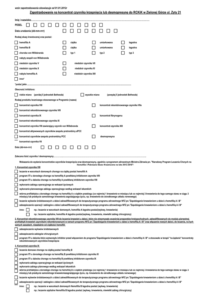 wzór zapotrzebowania obowiazuje od 01.01.2012r Zapotrzebowanie na koncentrat czynnika krzepnięcia lub desmopresynę do RCKiK w Zielonej Górze ul. Zyty 21 Imię i nazwisko……………………………………………………………………………………………………………………………………….…… PESEL Data urodzenia (dd-mm-rrrr) Rodzaj skazy krwotocznej oraz postać: hemofilia A ciężka umiarkowana łagodna hemofilia B ciężka umiarkowana łagodna choroba von Willebranda typ 1 typ 2 typ 3 nabyty zespół von Willebranda niedobór czynnika V niedobór czynnika VII niedobór czynnika X niedobór czynnika XI nabyta hemofilia A niedobór czynnika XIII inne* *podać jakie ........................................................................................................................................................................................... Obecność inhibitora: niskie miano (poniżej 5 jednostek Bethesda) wysokie miano (powyżej 5 jednostek Bethesda) Rodzaj produktu leczniczego stosowanego w Programie (nazwa) koncentrat czynnika VIII koncentrat rekombinowanego czynnika VIIa koncentrat rekombinowanego czynnika VIII koncentrat czynnika IX koncentrat fibrynogenu koncentrat rekombinowanego czynnika IX koncentrat czynnika VIII zawierający czynnik von Willebranda koncentrat czynnika XIII koncentrat aktywowanych czynników zespołu protrombiny aPCC koncentrat czynników zespołu protrombiny PCC desmopresyna koncentrat czynnika VII Data (dd-mm-rrrr) Zalecana ilość czynnika / desmopresyny…………..…………………………………………………………………………………………………………….. Wskazania do wydania koncentratów czynników krzepnięcia oraz desmopresyny, zgodnie z programem zdrowotnym Ministra Zdrowia pn. "Narodowy Program Leczenia Chorych na Hemofilię i Pokrewne Skazy Krwotoczne na lata 2012-2018": 1. Koncentrat czynnika VIII leczenie w warunkach domowych chorego na ciężką postać hemofilii A program ITI u dorosłego chorego na hemofilię A powikłaną inhibitorem czynnika VIII program ITI u dziecka chorego na hemofilię A powikłaną inhibitorem czynnika VIII wykonanie zabiegu operacyjnego ze wskazań życiowych wykonanie planowanego zabiegu operacyjnego według wskazań lekarskich wtórna profilaktyka u dorosłego chorego na hemofilię A o ciężkim przebiegu (co najmniej 1 krwawienie w miesiącu lub co najmniej 3 krwawienia do tego samego stawu w ciągu 3 miesięcy lub przebycie samoistnego krwawienia zagrażającego życiu, np. krwawienie do ośrodkowego układu nerwowego) leczenie wylewów śródstawowych u dzieci zakwalifikowanych do terapeutycznego programu zdrowotnego NFZ pn."Zapobieganie krwawieniom u dzieci z hemofilią A i B" zabezpieczenie operacji i zabiegów u dzieci zakwalifikowanych do terapeutycznego programu zdrowotnego NFZ pn."Zapobieganie krwawieniom u dzieci z hemofilią A i B" inne: np.: leczenie w warunkach domowych, hemofilia A łagodna postać(wylewy, krwawienia) np.: leczenie szpitalne, hemofilia A łagodna postać(wylewy, krwawienia, niewielki zabieg chirurgiczny) 2. Koncentrat rekombinowanego czynnika VIII do leczenia krwawień u dzieci, które nie otrzymywały wcześniej preparatów krwiopochodnych, zakwalifikowanych do modułu pierwotnej profilaktyki krwawień czynnikami rekombinowanymi w ramach programu NFZ pn."Zapobieganie krwawieniom u dzieci z hemofilią A i B" oraz włączenie nowych dzieci, do leczenia, na tych samych zasadach, niezależnie od ciężkości hemofilii zabezpieczenie wylewów śródstawowych zabezpieczenie zabiegów chirurgicznych program ITI u dziecka które wytworzyło inhibitor przed włączeniem do programu"Zapobieganie krwawieniom u dzieci z hemofilią A i B" a stosowało w terapii "na żądanie" koncentraty rekombinowanych czynników krzepnięcia 3. Koncentrat czynnika IX leczenie domowe chorego na ciężką postać hemofilię B program ITI u dorosłego chorego na hemofilię B powikłaną inhibitorem czynnika IX program ITI u dziecka chorego na hemofilię B powikłaną inhibitorem czynnika IX wykonanie zabiegu operacyjnego ze wskazań życiowych wykonanie zabiegu planowego według wskazań lekarskich wtórna profilaktyka u dorosłego chorego na hemofilię B o ciężkim przebiegu (co najmniej 1 krwawienie w miesiącu lub co najmniej 3 krwawienia do tego samego stawu w ciągu 3 miesięcy lub przebycie samoistnego krwawieniazagrażającego życiu, np. krwawienie do ośrodkowego układu nerwowego) leczenie wylewów śródstawowych u dzieci zakwalifikowanych do terapeutycznego programu zdrowotnego NFZ pn."Zapobieganie krwawieniom u dzieci z hemofilią A i B" zabezpieczenie operacji i zabiegów u dzieci zakwalifikowanych do terapeutycznego programu zdrowotnego NFZ pn."Zapobieganie krwawieniom u dzieci z hemofilią A i B" inne: np.: leczenie w warunkach domowych Hemofilia B łagodna postać (wylewy, krwawienia) np.: leczenie szpitalne Hemofilia B łagodna postać (wylewy, krwawienia, niewielki zabieg chirurgiczny) 4. Koncentrat rekombinowanego czynnika IX do leczenia krwawień u dzieci, które nie otrzymywały wcześniej preparatów krwiopochodnych, zakwalifikowanych do modułu pierwotnej profilaktyki krwawień czynnikami rekombinowanymi w ramach programu NFZ pn."Zapobieganie krwawieniom u dzieci z hemofilią A i B" oraz włączanie nowych dzieci, do leczenia na tych samych zasadach, niezależnie od ciężkości hemofilii zabezpieczenie wylewów śródstawowych zabezpieczenie zabiegów chirurgicznych program ITI u dziecka które wytworzyło inhibitor przed włączeniem do programu"Zapobieganie krwawieniom u dzieci z hemofilią A i B" a stosowało w terapii "na żądanie" koncentraty rekombinowanych czynników krzepnięcia 5. Koncentrat czynnika VIII zawierający czynnik von Willebranda, zarejestrowany ze wskazaniem do leczenia choroby von Willebranda leczenie w warunkach domowych chorego na chorobę von Willebranda o najcięższym przebiegu k