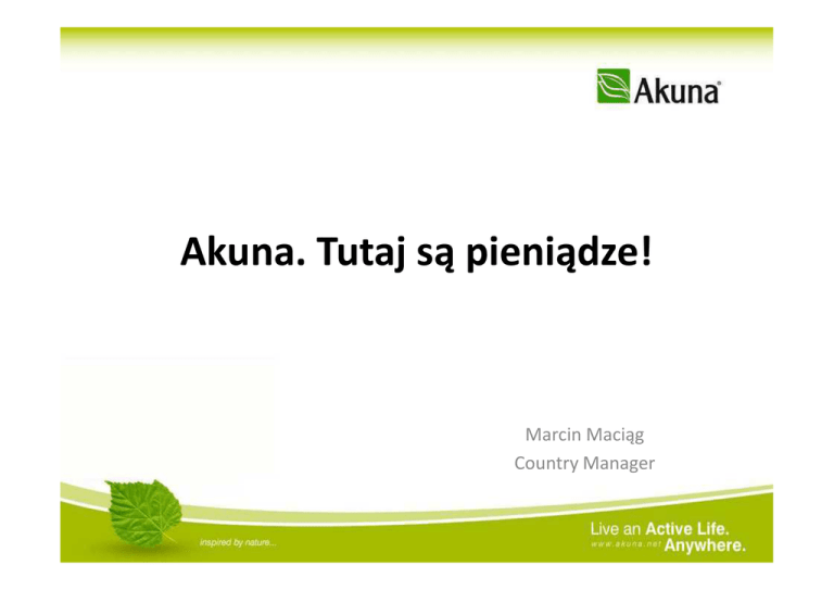 Akuna. Tutaj są pieniądze! Marcin Maciąg Country Manager Punkt wyjścia: …na początku 2011 poznaliśmy Zestaw Powitalny, który zdaniem większości menedżerów zadecydował o ich sukcesie w roku 2011 …potwierdzają to także liczby: - Prawie 10.000 Zestawów Powitalnych w 2011r. - Ponad 1.200.000 PLN wypłaconych benefitów finansowych z samego Programu Benefit. Najważniejsze korzyści Zestawów Powitalnych: - Alveo w najlepszej rynkowej cenie! - Możliwość zarabiania już od pierwszego dnia w Akunie! - Pełne logistyczne wsparcie firmy! A TERAZ: ZESTAW PLUS • oferujesz Alveo w najlepszej możliwej cenie! • w Akunie zarabiasz już od pierwszego dnia! • otrzymujesz pełne wsparcie logistyczne Akuny! Szansa na dodatkowe 8.000 zł do końca 2012r.! Zdecydowane PLUSy PLUSa: - Zawartość: Taki sam skład jak w Zestawie Powitalnym - Wartość punktowa: 100 pkt. - Dla kogo: dla każdego menedżera Akuna oraz Senior Dystrybutora - Benefit: Kupując Zestaw Plus otrzymujesz za 1 zł wybrany produkt – Mastervit, Onyx Plus, Pinky lub AkuC, o wartości ponad 100 zł - Ograniczenie: maksymalnie 7 Zestawów Plus w miesiącu - Dodatkowy Benefit: kupując równocześnie 7 Zestawów Plus – oprócz 7 butelek wybranego produktu uzyskujesz jeszcze jedną – ósmą za 1 zł – czyli łącznie produkty o wartości ponad 800 zł! Dodatkowo: - Kupując Zestaw Plus wchodzisz do Programu Benefit 2012 - Zestawy Plus mają zawartą deklarację członkowską – to oznacza, że możesz wykorzystywać je jako Zestawy Powitalne wprowadzając nowych partnerów do Akuny; - Za każdą osobę wprowadzoną do biznesu poprzez umowę z Zestawu Plus otrzymujesz kupon do konkursu miesięcznego; - Dystrybutor pod którym do trzech poziomów wprowadzono 12 nowych partnerów w opraciu o Zestaw Powitalny lub umowy z Zestawu Plus ma możliwość zostania Liderem/Złotym Partnerem – konieczna jest nominacja liderska uzupełniona przez sponsora! …no tak, ale do 15.200,00 PLN rocznie wciąż brakuje paru złotych…. Jak to, przecież są – tutaj w Akunie! ☺ Jesteś L lub LD – słuchaj TERAZ uważnie! Nie jesteś L lub LD – też słuchaj TERAZ uważnie, bo nowi L i LD to podstawa rozwoju Twojej struktury! Jesteś LIDEREM. Tylko TERAZ możesz otrzymać za jedyne 6zł produkty o wartości 500zł miesięcznie! To proste, w ramach miesiąca: - spełnij warunek kwalifikacji; - miej dwie dywizje kwalifikowane! Rocznie to dodatkowy dochód nawet do 5.000zł!!! Rocznie to dodatkowy dochód nawet do 5.000zł!!! A są to: - 2 sztuki preparatu Alveo - 2 opakowania Take a plaster - 2 opakowania AkuEnergy Jesteś LIDEREM DYWIZJI. Tylko TERAZ możesz otrzymać za jedyne 8zł produkty o wartości 730zł miesięcznie! To proste, w ramach miesiąca: - spełnij warunek kwalifikacji; - miej trzy dywizje kwalifikowane! Rocznie to dodatkowy dochód nawet do 7.300zł!!! Rocznie to dodatkowy dochód nawet do 7.300zł A są to: - 2 sztuki preparatu Alveo - 3 opakowania Take a plaster - 2 opakowania AkuEnergy - 1 Zestaw Bio-kosmetyków START Zestawów Plus – 20.03.2012r. START Promocji dla L i LD – 01.03.2012r. Bądź TAM z NAMI! Chwytaj tą okazję! Więcej informacji o programie: Aneta Gawrońska Telefon: 694 475 675 Mail: [email protected] A w ramach specjalnego pilotażu tego programu tylko przez jeden miesiąc przekazaliśmy już produkty o wartości prawie 40.000 PLN!!! To działa! Akuna. Tutaj są pieniądze! ŁĄCZYMY SIĘ… Wioletta Grzybowska, Dyrektor Sieci Międzynarodowej Kazimiera Sądel-Wróbel, Dyrektor Sieci Regionalnej Paweł Borecki, Wiceprezydent Marek Wawrzeńczyk, Wiceprezydent NASZA MISJA „ZAPRASZAJĄC NOWYCH LUDZI DO NASZEJ GLOBALNEJ SPOŁECZNOŚCI, SPRAWIAMY ŻE NIEPRZERWANIE ROŚNIE JAKOŚĆ ŻYCIA KAŻDEGO Z NAS” DZIĘKUJĘ!