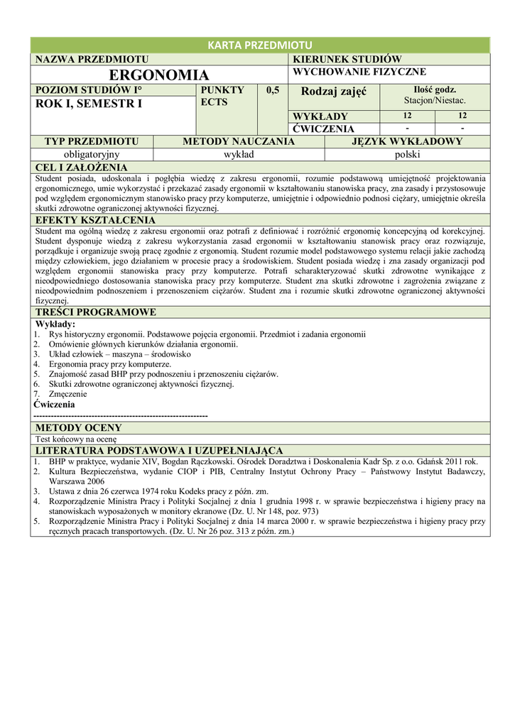 KARTA PRZEDMIOTU KIERUNEK STUDIÓW WYCHOWANIE FIZYCZNE NAZWA PRZEDMIOTU ERGONOMIA POZIOM STUDIÓW I° ROK I, SEMESTR I TYP PRZEDMIOTU obligatoryjny CEL I ZAŁOŻENIA PUNKTY ECTS 0,5 Rodzaj zajęć Ilość godz. Stacjon/Niestac. 12 12 WYKŁADY ĆWICZENIA METODY NAUCZANIA JĘZYK WYKŁADOWY wykład polski Student posiada, udoskonala i pogłębia wiedzę z zakresu ergonomii, rozumie podstawową umiejętność projektowania ergonomicznego, umie wykorzystać i przekazać zasady ergonomii w kształtowaniu stanowiska pracy, zna zasady i przystosowuje pod względem ergonomicznym stanowisko pracy przy komputerze, umiejętnie i odpowiednio podnosi ciężary, umiejętnie określa skutki zdrowotne ograniczonej aktywności fizycznej. EFEKTY KSZTAŁCENIA Student ma ogólną wiedzę z zakresu ergonomii oraz potrafi z definiować i rozróżnić ergonomię koncepcyjną od korekcyjnej. Student dysponuje wiedzą z zakresu wykorzystania zasad ergonomii w kształtowaniu stanowisk pracy oraz rozwiązuje, porządkuje i organizuje swoją pracę zgodnie z ergonomią. Student rozumie model podstawowego systemu relacji jakie zachodzą między człowiekiem, jego działaniem w procesie pracy a środowiskiem. Student posiada wiedzę i zna zasady organizacji pod względem ergonomii stanowiska pracy przy komputerze. Potrafi scharakteryzować skutki zdrowotne wynikające z nieodpowiedniego dostosowania stanowiska pracy przy komputerze. Student zna skutki zdrowotne i zagrożenia związane z nieodpowiednim podnoszeniem i przenoszeniem ciężarów. Student zna i rozumie skutki zdrowotne ograniczonej aktywności fizycznej. TREŚCI PROGRAMOWE Wykłady: 1. 2. 3. 4. 5. 6. 7. Rys historyczny ergonomii. Podstawowe pojęcia ergonomii. Przedmiot i zadania ergonomii Omówienie głównych kierunków działania ergonomii. Układ człowiek – maszyna – środowisko Ergonomia pracy przy komputerze. Znajomość zasad BHP przy podnoszeniu i przenoszeniu ciężarów. Skutki zdrowotne ograniczonej aktywności fizycznej. Zmęczenie Ćwiczenia ------------------------------------------------------------ METODY OCENY Test końcowy na ocenę LITERATURA PODSTAWOWA I UZUPEŁNIAJĄCA 1. 2. 3. 4. 5. BHP w praktyce, wydanie XIV, Bogdan Rączkowski. Ośrodek Doradztwa i Doskonalenia Kadr Sp. z o.o. Gdańsk 2011 rok. Kultura Bezpieczeństwa, wydanie CIOP i PIB, Centralny Instytut Ochrony Pracy – Państwowy Instytut Badawczy, Warszawa 2006 Ustawa z dnia 26 czerwca 1974 roku Kodeks pracy z późn. zm. Rozporządzenie Ministra Pracy i Polityki Socjalnej z dnia 1 grudnia 1998 r. w sprawie bezpieczeństwa i higieny pracy na stanowiskach wyposażonych w monitory ekranowe (Dz. U. Nr 148, poz. 973) Rozporządzenie Ministra Pracy i Polityki Socjalnej z dnia 14 marca 2000 r. w sprawie bezpieczeństwa i higieny pracy przy ręcznych pracach transportowych. (Dz. U. Nr 26 poz. 313 z późn. zm.)